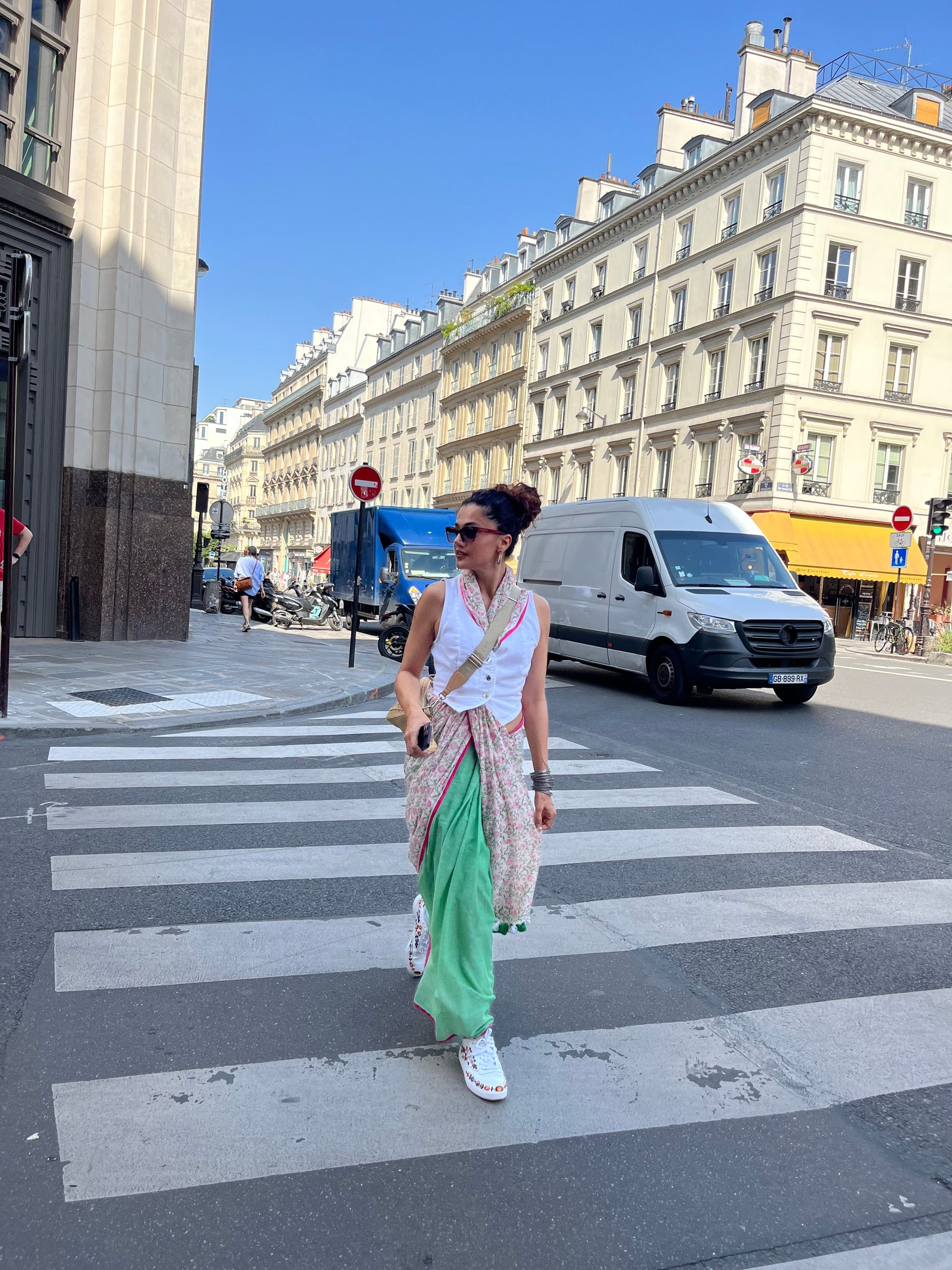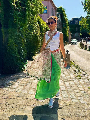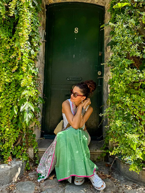Curated with delicately divine mul cotton, this saree is a testament to graceful charm. The block-printed design is an artisan's dream, as white and green creates the perfect fusion to bring out the enchantress in you! This piece from the regal Taapsee × Suta collection is adorned with a vivacious pink border, Aadha Ishq is a special creation, that transgresses love in the most pious way possible!