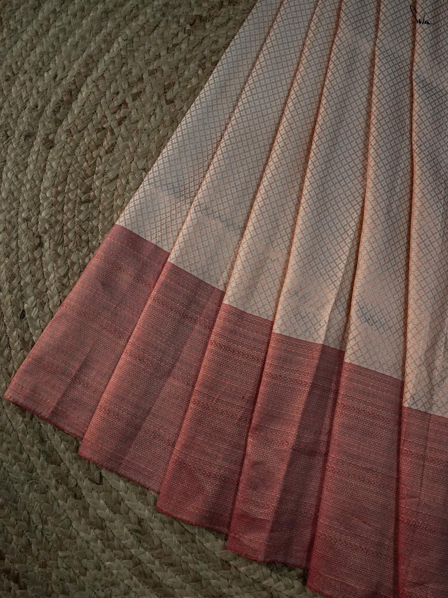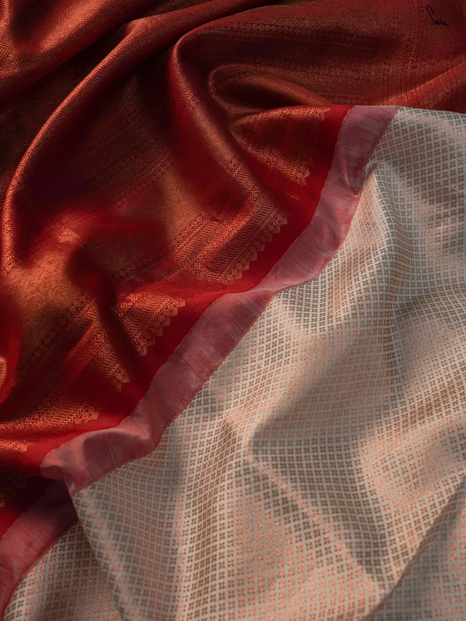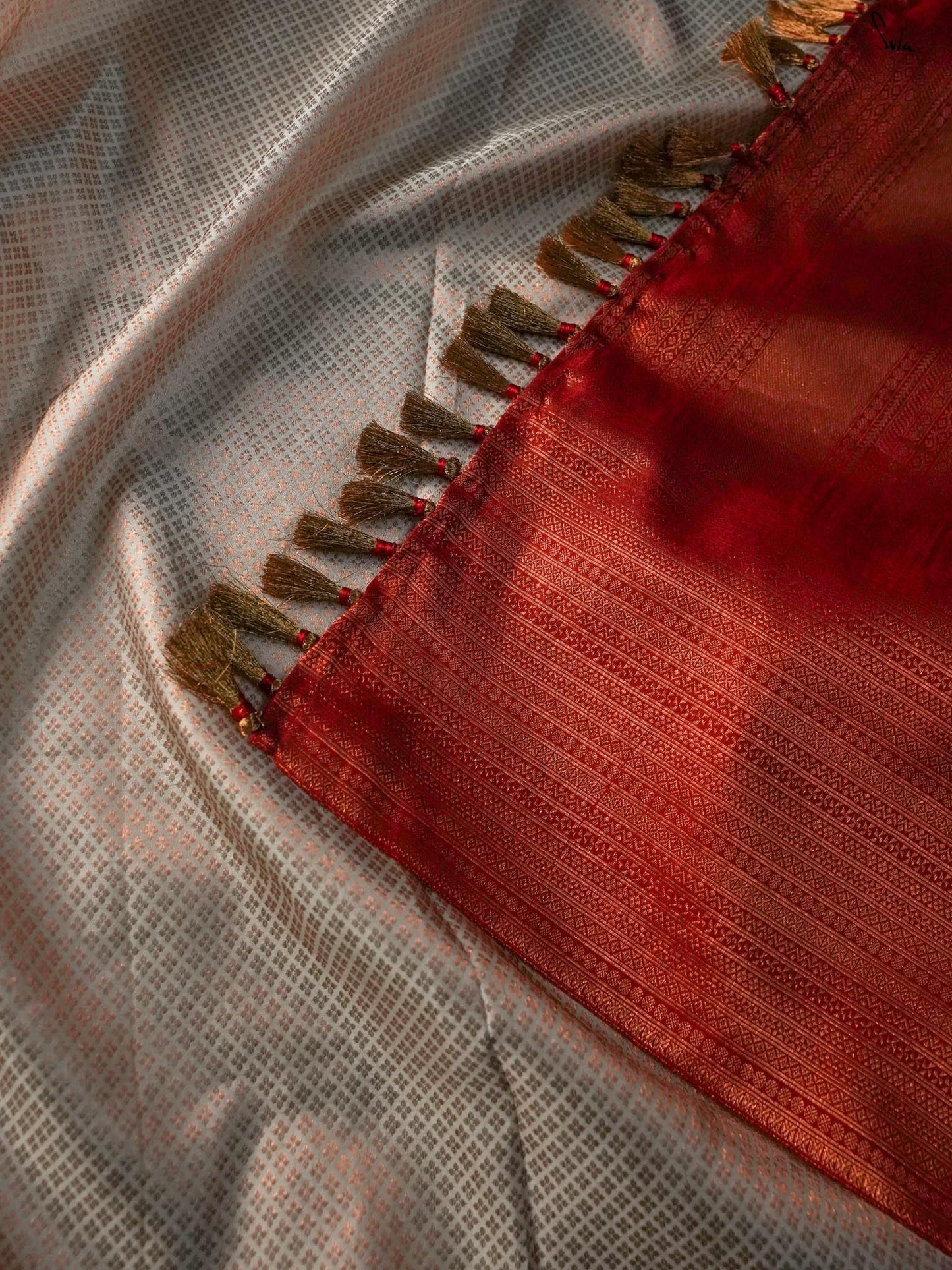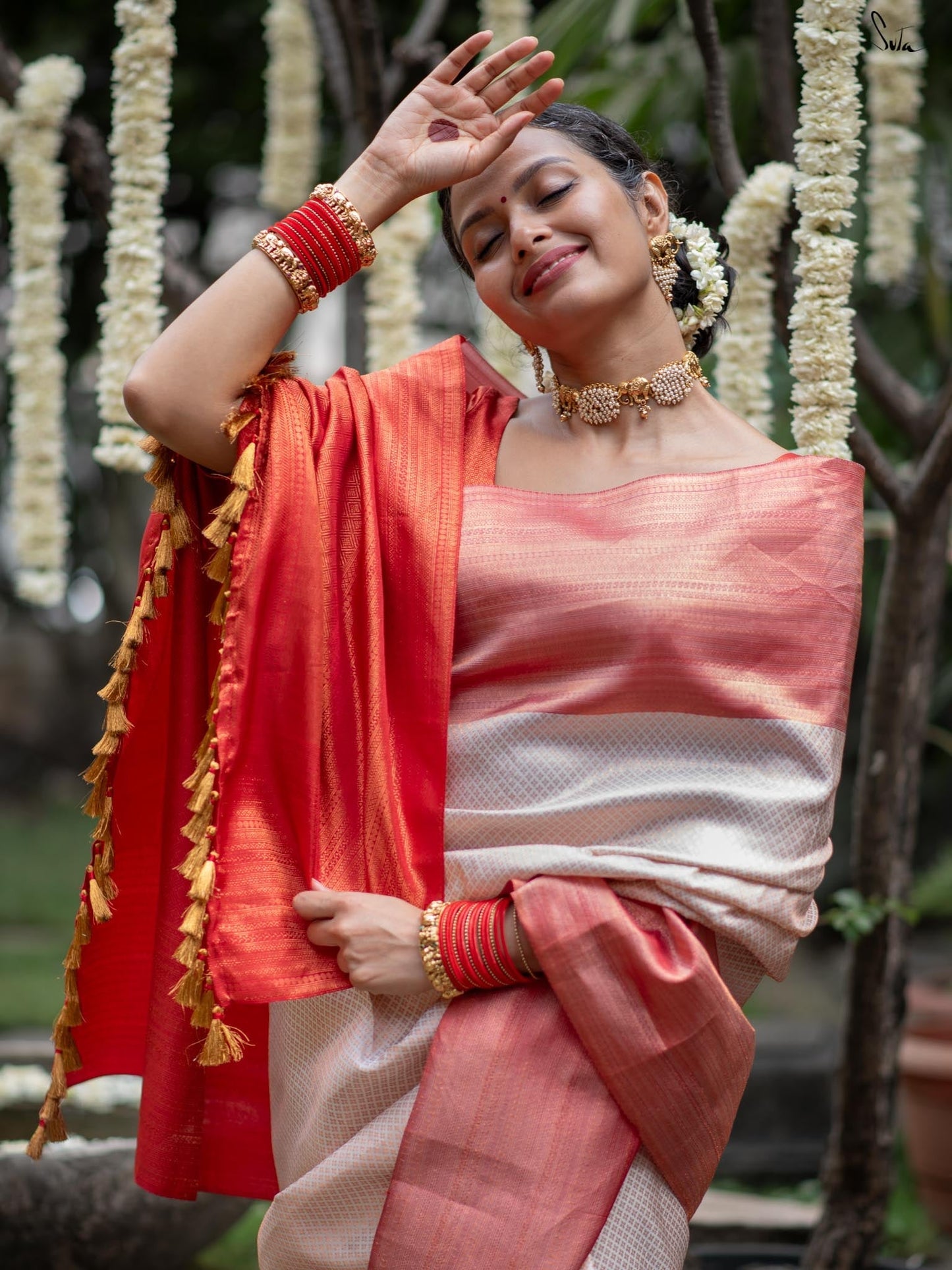 Aadira, a luminous white Kanjivaram woven in 100% silk with a contrasting red border symbolizes the moon's soft glow. The intricate zari work and metallic tassels mirror the moonlight’s ethereal beauty, lighting up your presence. The saree comes with a matching blouse piece to complete your celestial look.