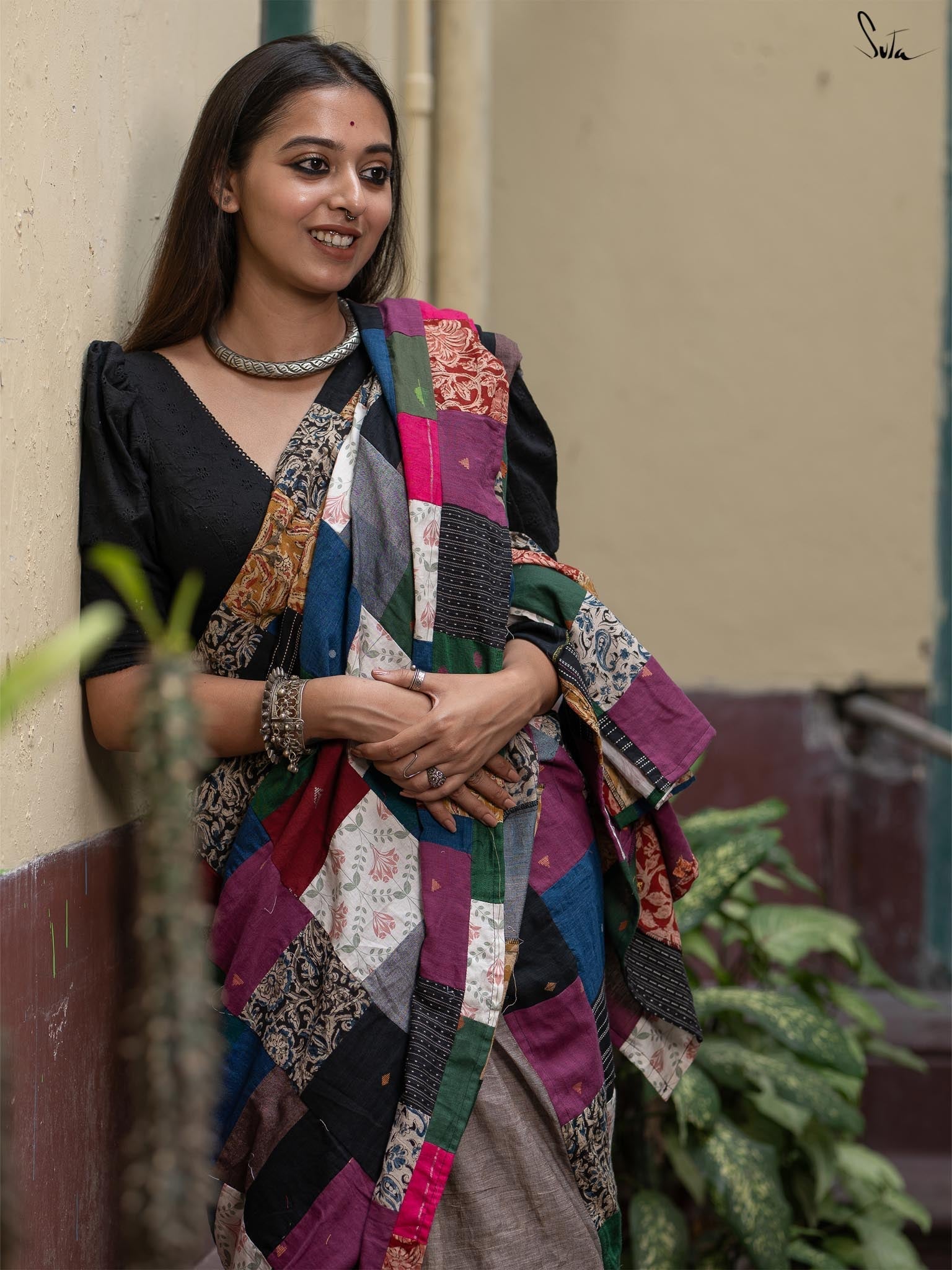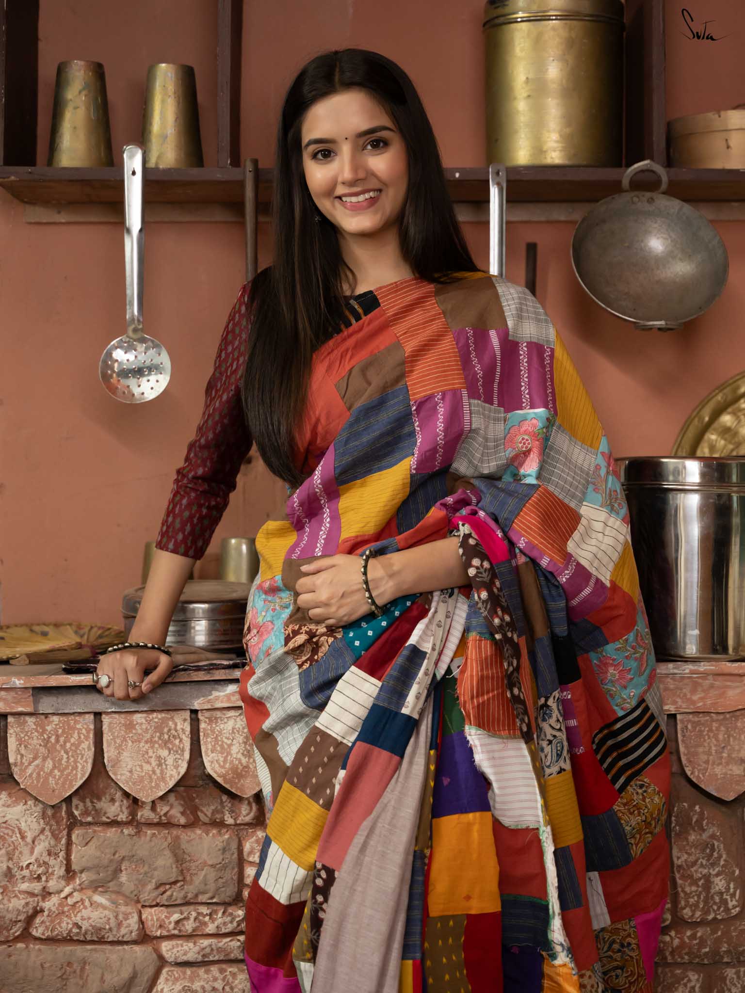The Aaliyah patchwork saree is a celebration of sustainable style. Crafted from repurposed fabrics, it minimizes waste and promotes eco-friendly practices. Each unique patch tells a story, showcasing the rich heritage of Indian textiles. A mesmerizing display of colors and textures makes this comfortable and versatile saree a one-of-a-kind masterpiece.Perfect for everyday wear, outings with friends, or any occasion where you want to express your unique style and commitment to sustainability..
