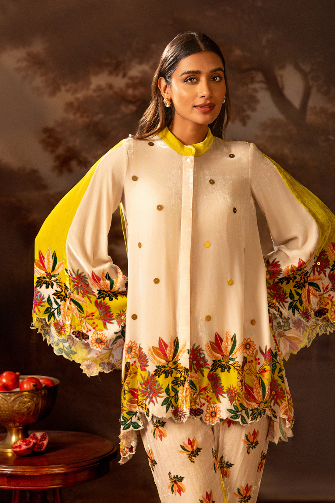 Yellow Aarani Embellished Shirt with Cutwork Hem paired with Pants in valvet