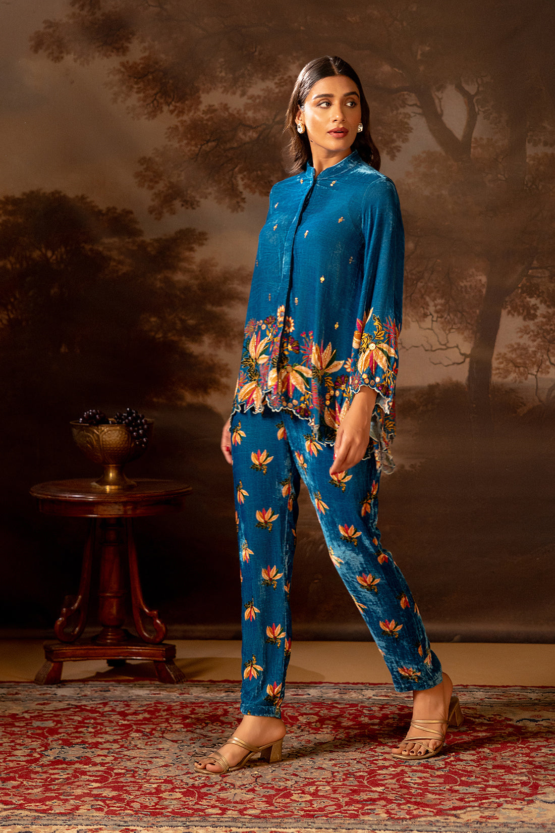 Black Aarani Embellished Shirt with Cutwork Hem paired with Pants in velvet