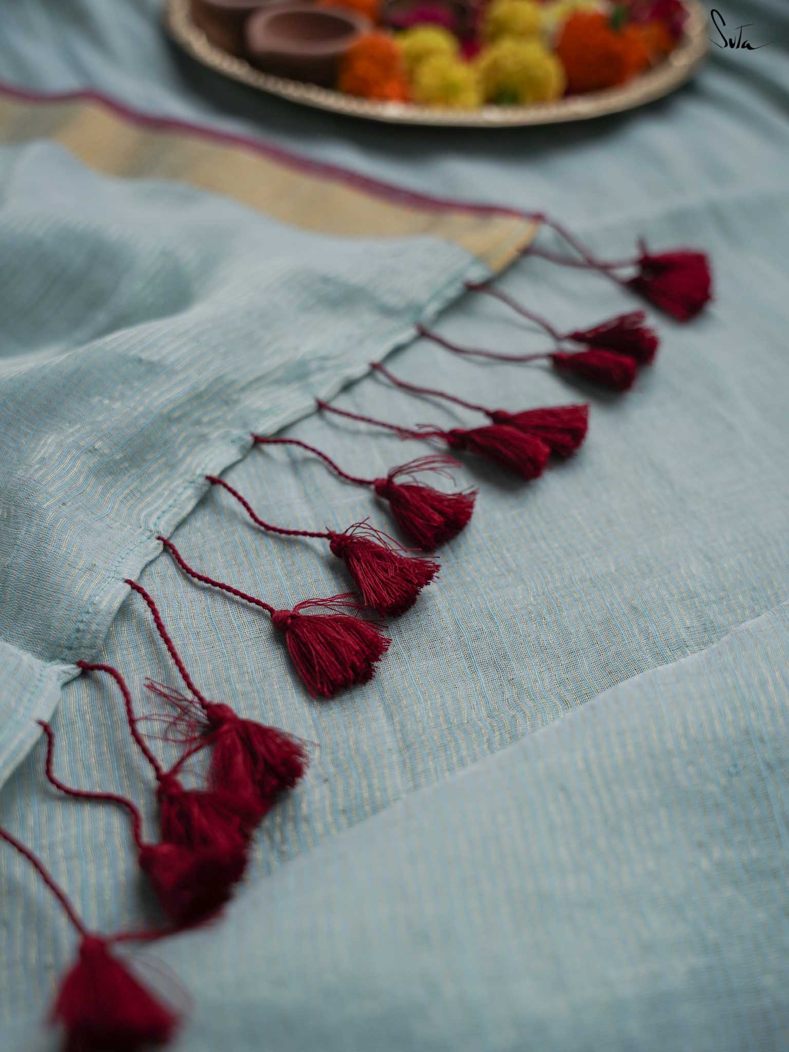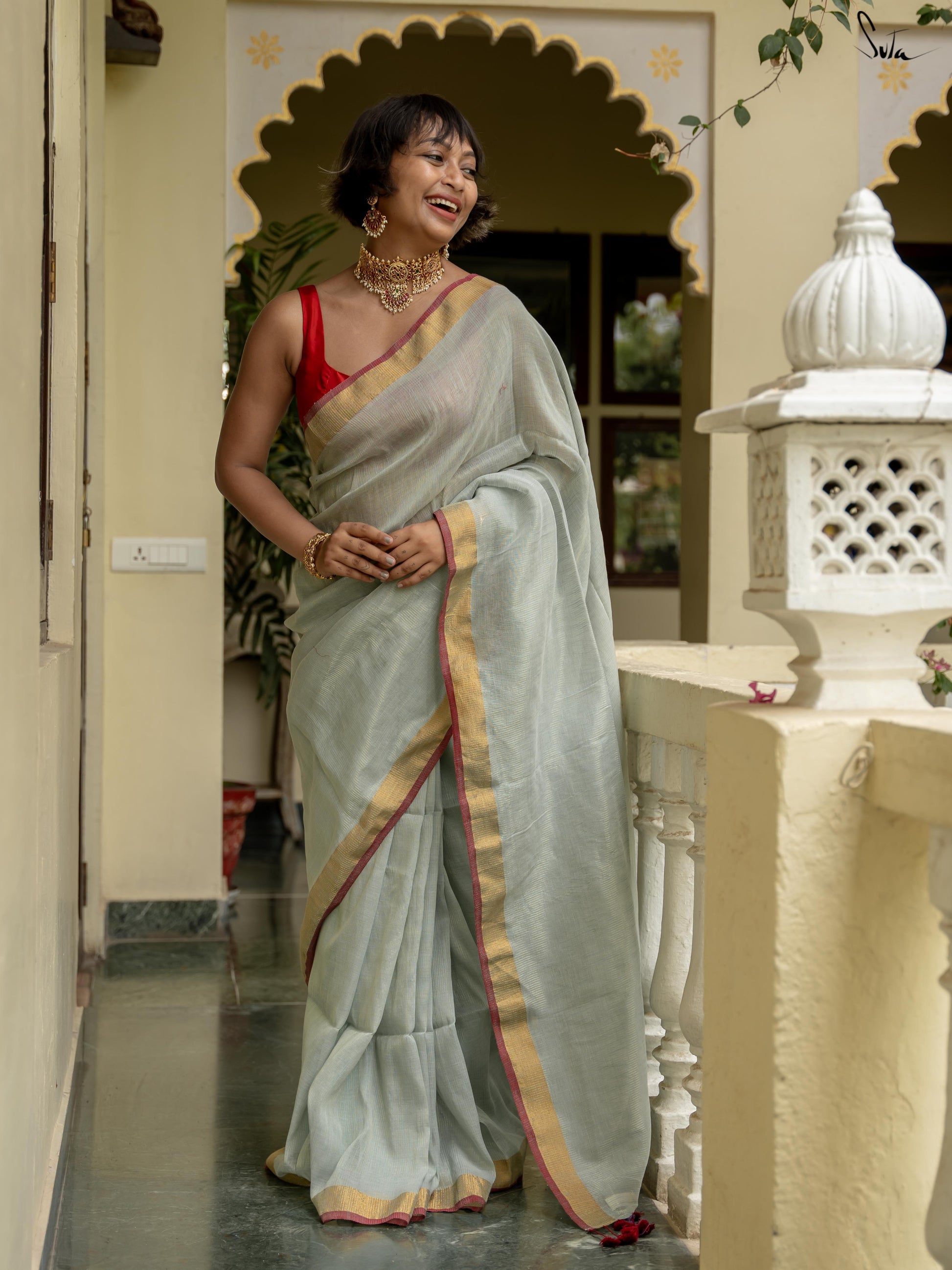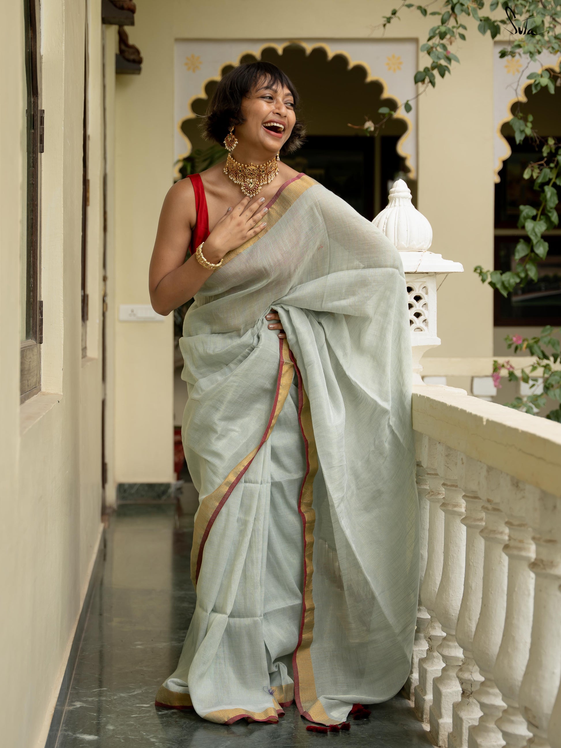 Imagine styling yourself in the mesmerizing Aasmani Mehfil Saree in light blue, crafted with a cotton slub fabric that’s lightweight yet rich. Perfect for celebrations, this festive saree features a red and gold border with intricate zari details and zari stripes throughout the saree.