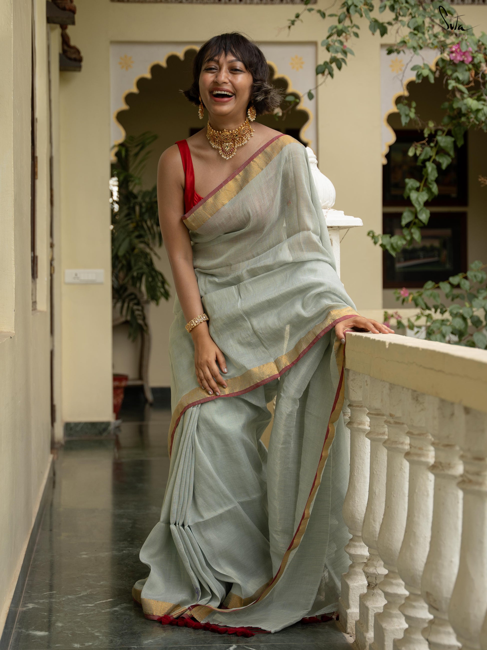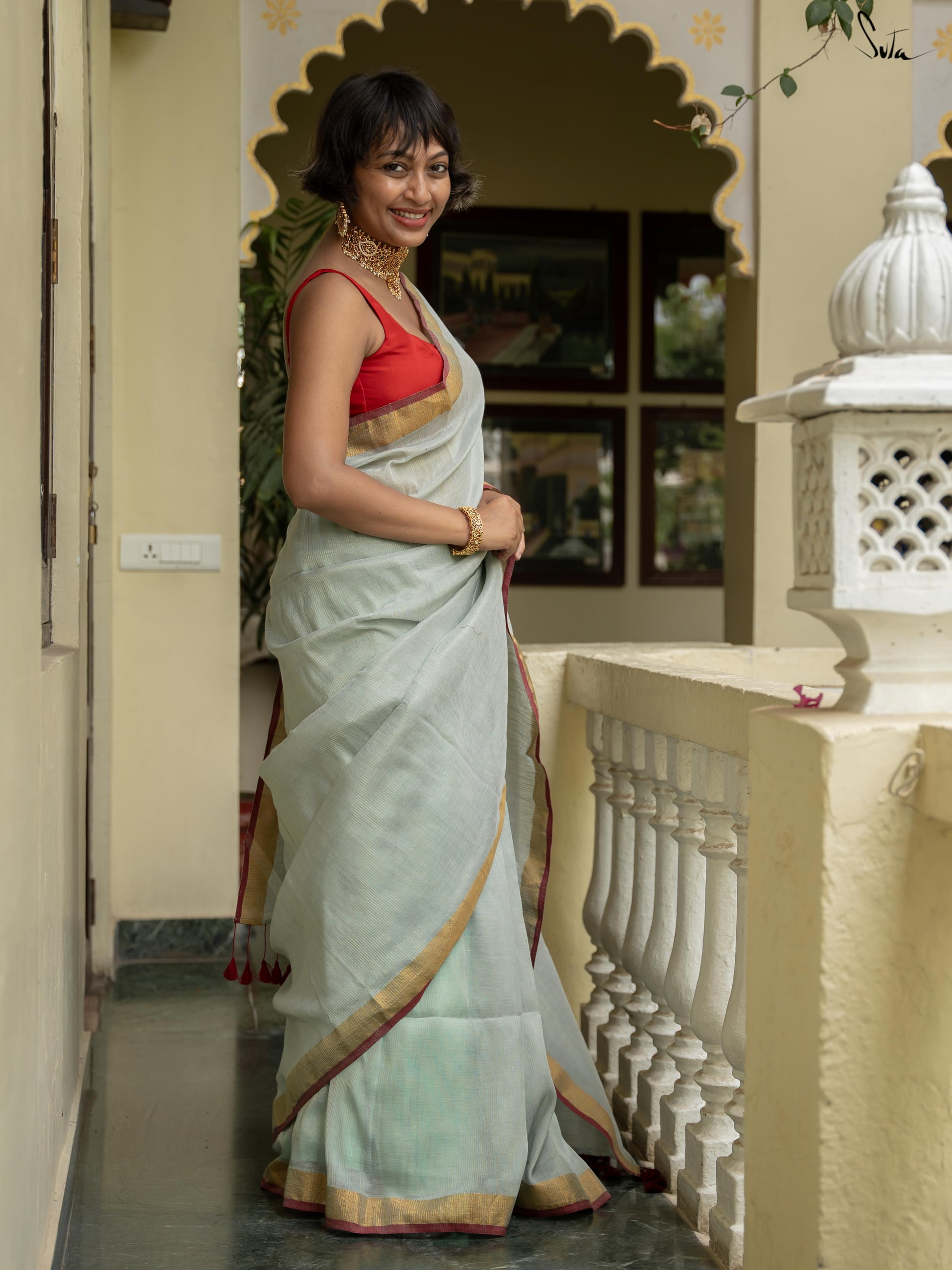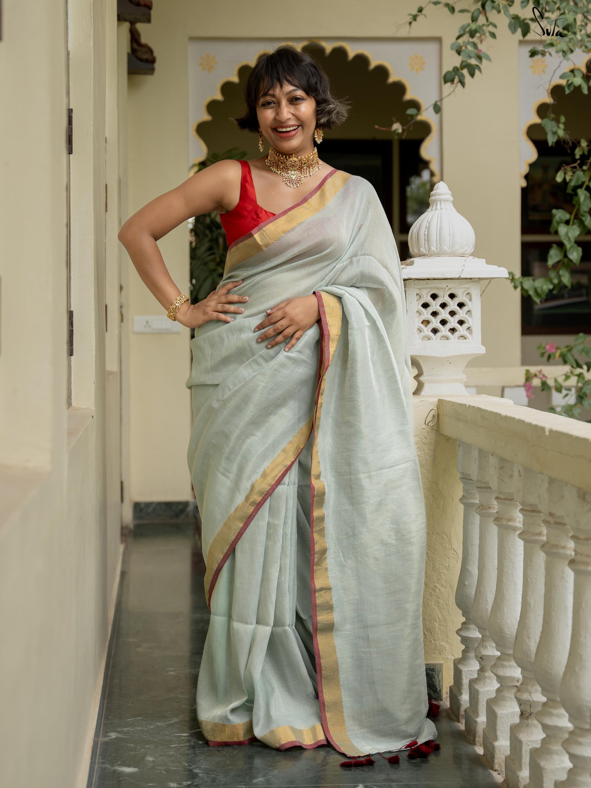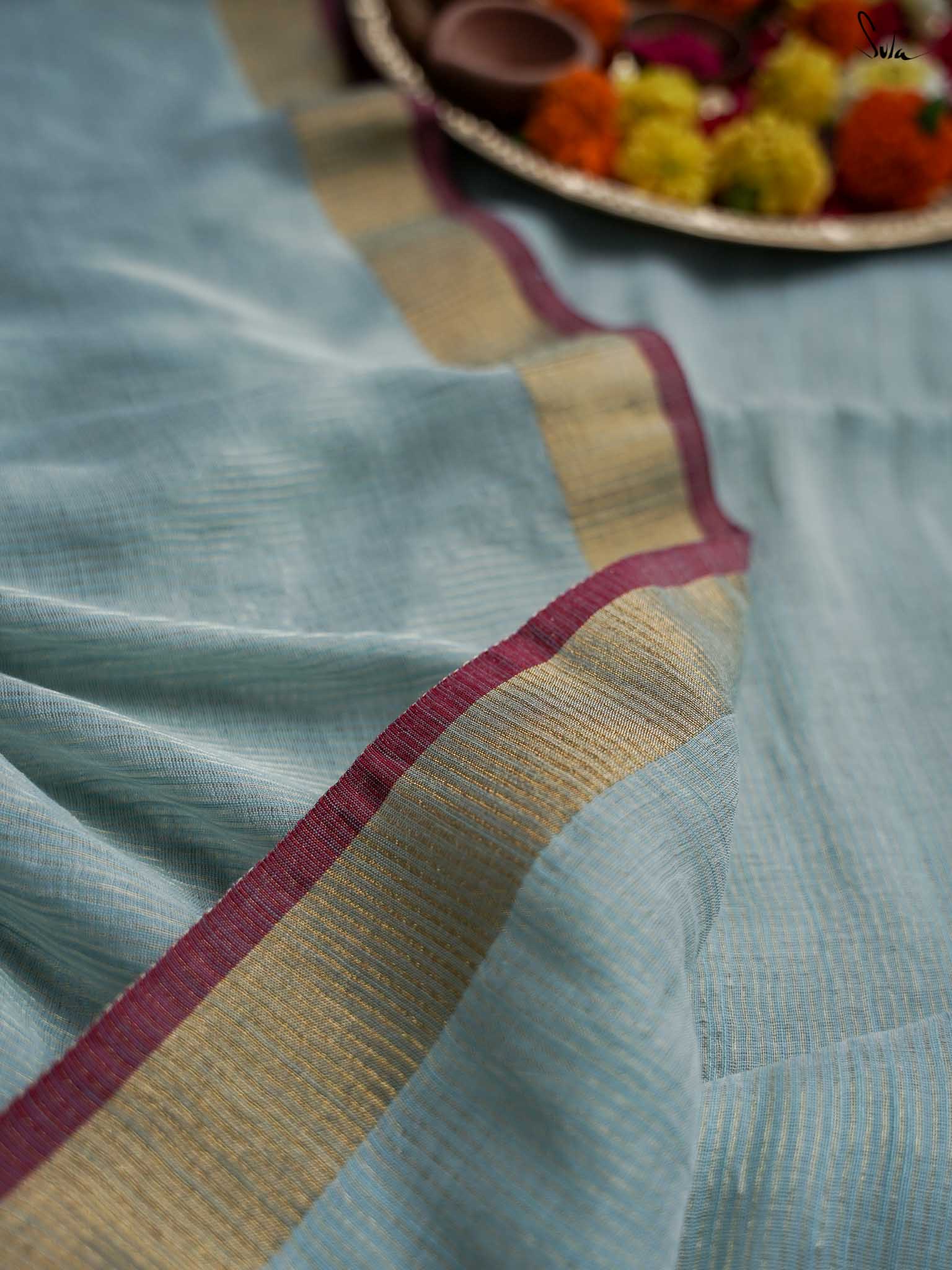 Imagine styling yourself in the mesmerizing Aasmani Mehfil Saree in light blue, crafted with a cotton slub fabric that’s lightweight yet rich. Perfect for celebrations, this festive saree features a red and gold border with intricate zari details and zari stripes throughout the saree.