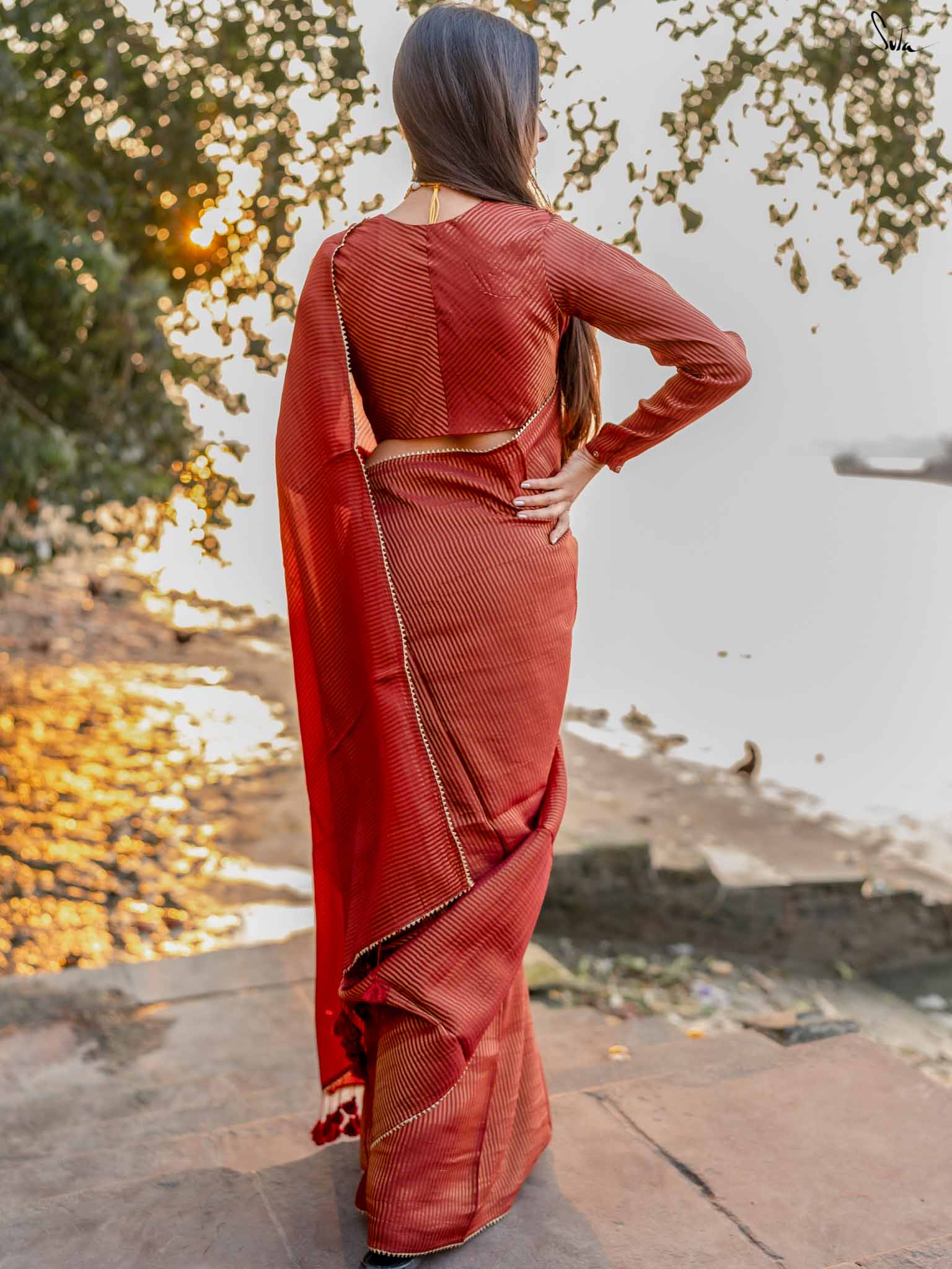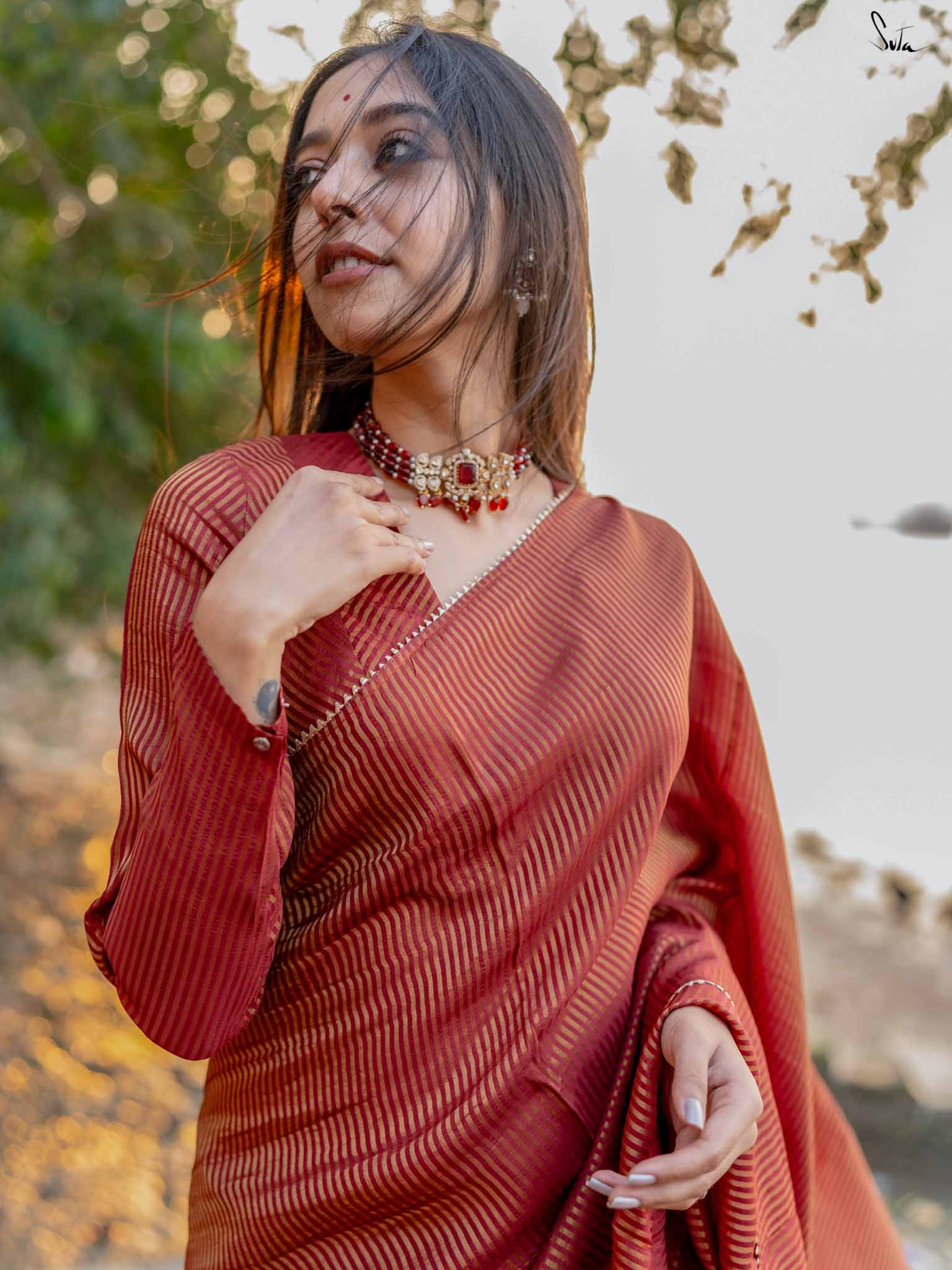 A powerful maroon saree crafted from viscose zari, with handwoven zari stripes and a gota border with maroon tassels. It’s a bold, empowering choice for any special occasion.