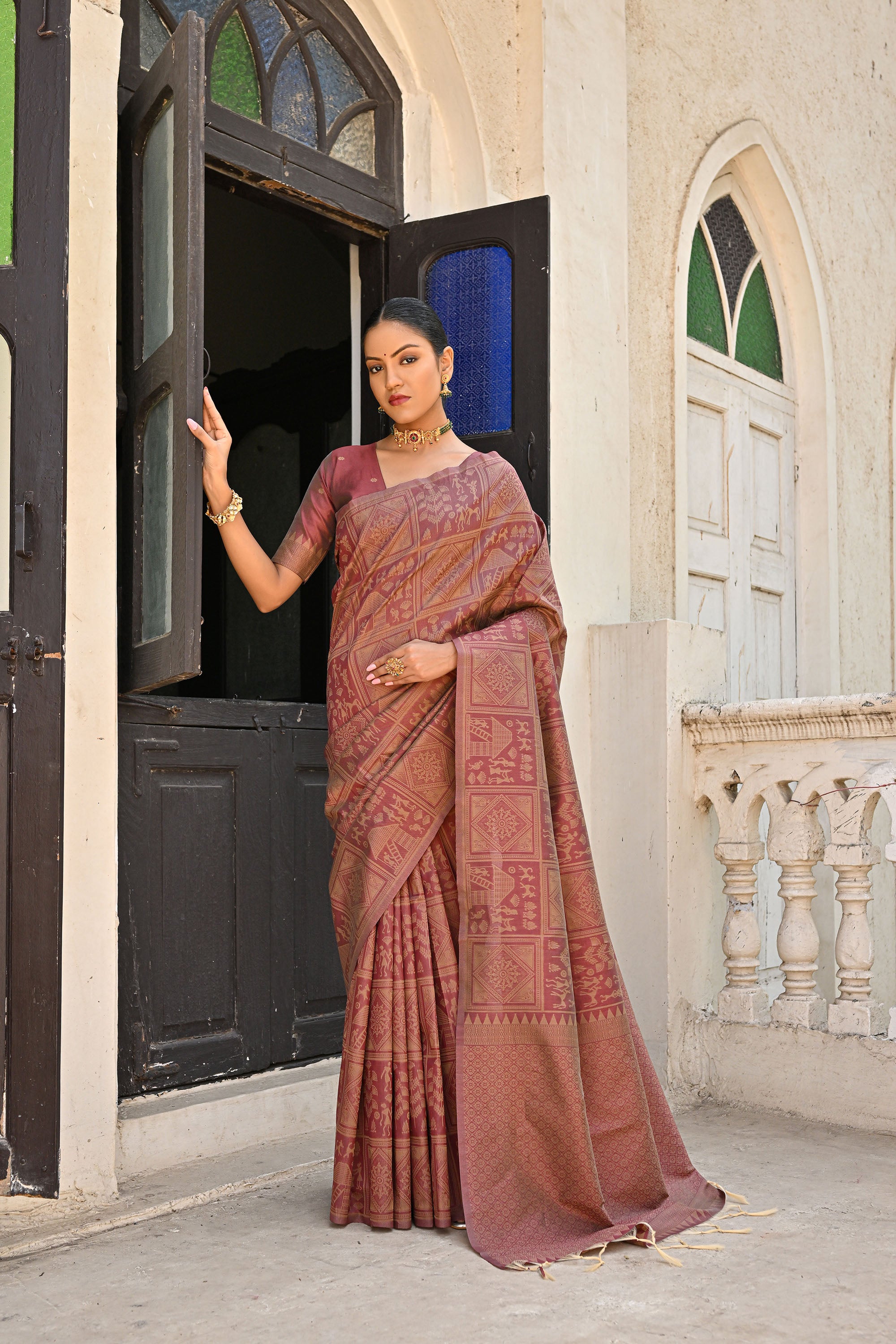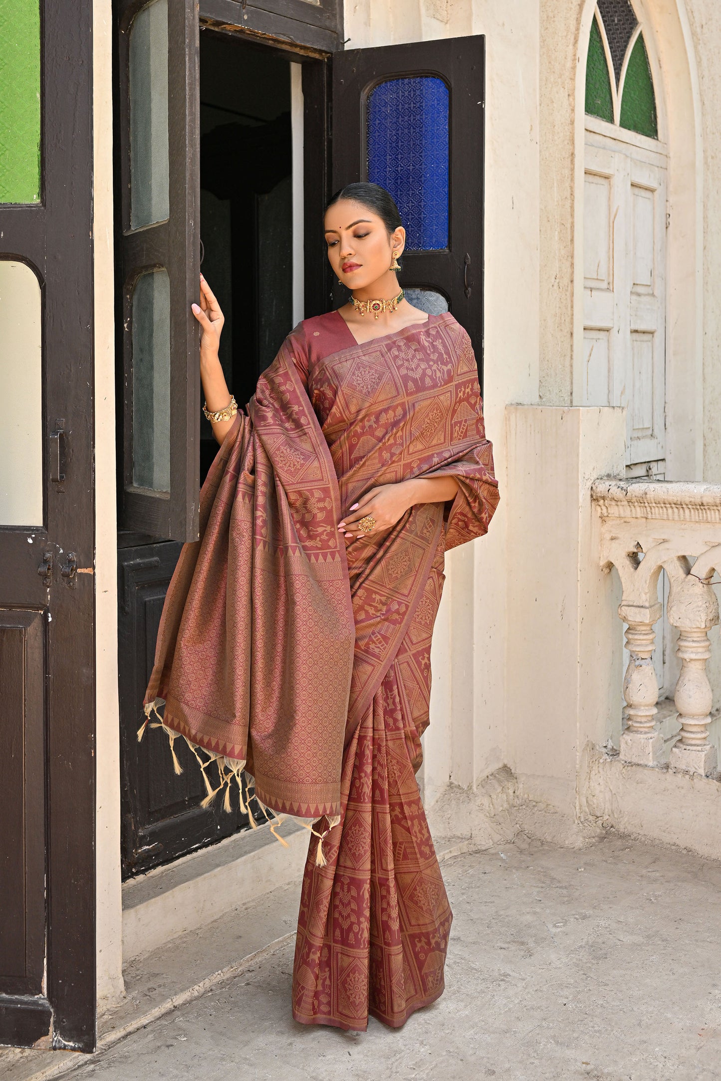 Alika kalamkari Coffee Handloom Raw Silk Kalamkari woven Saree