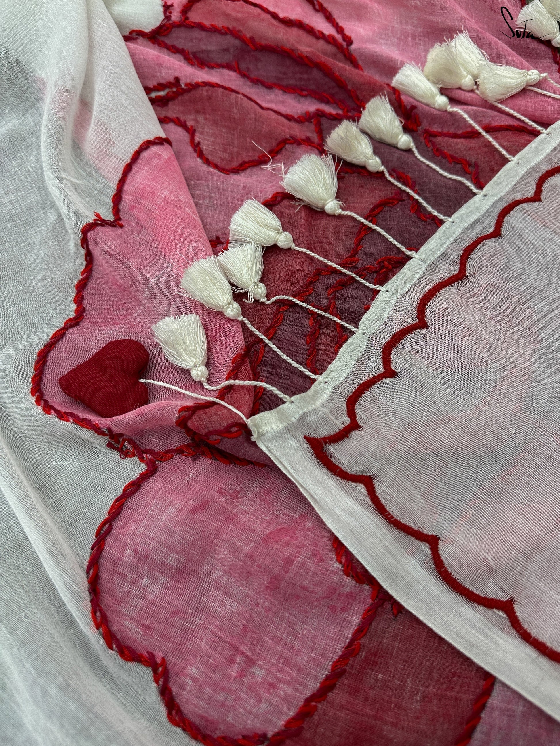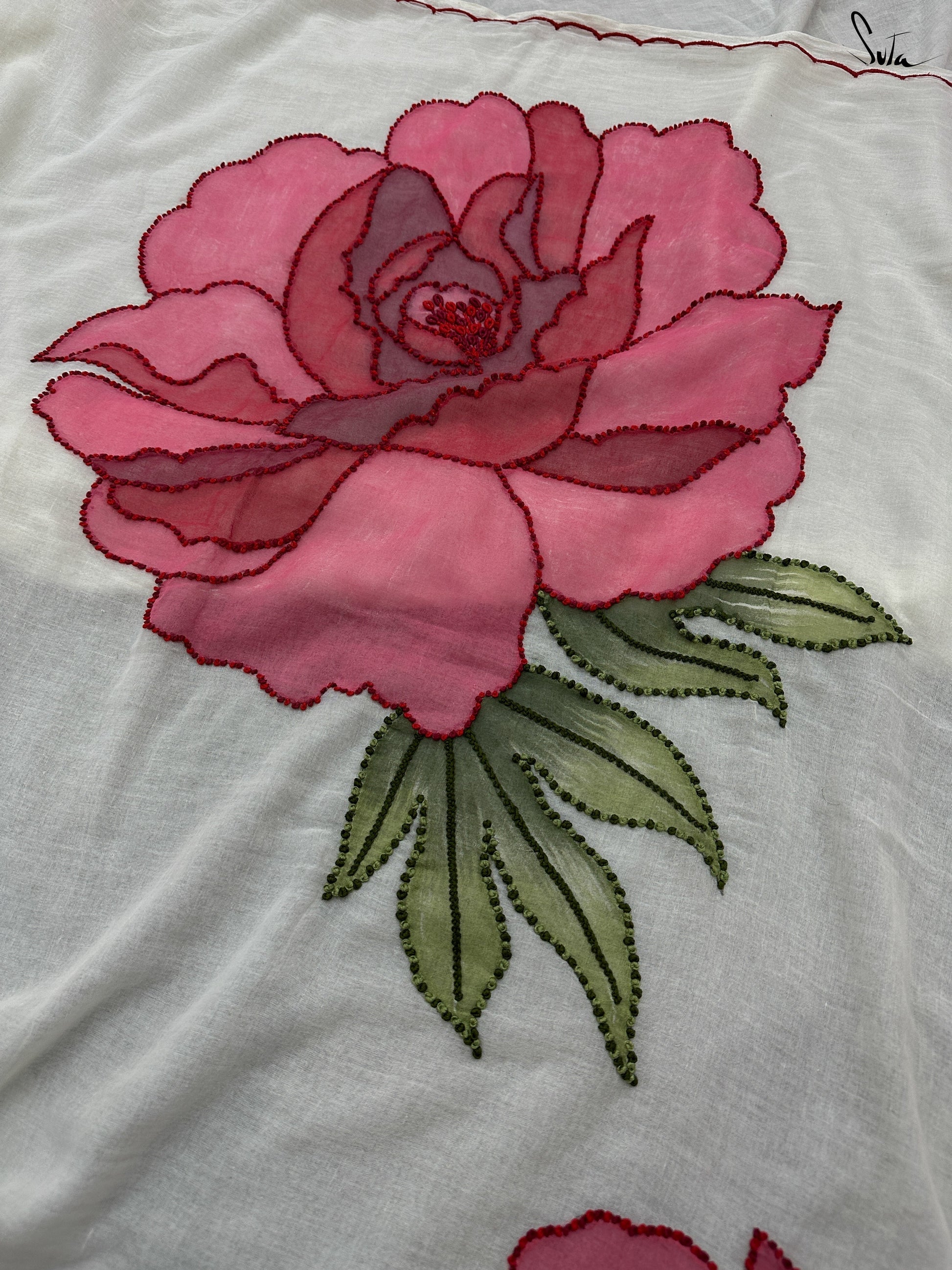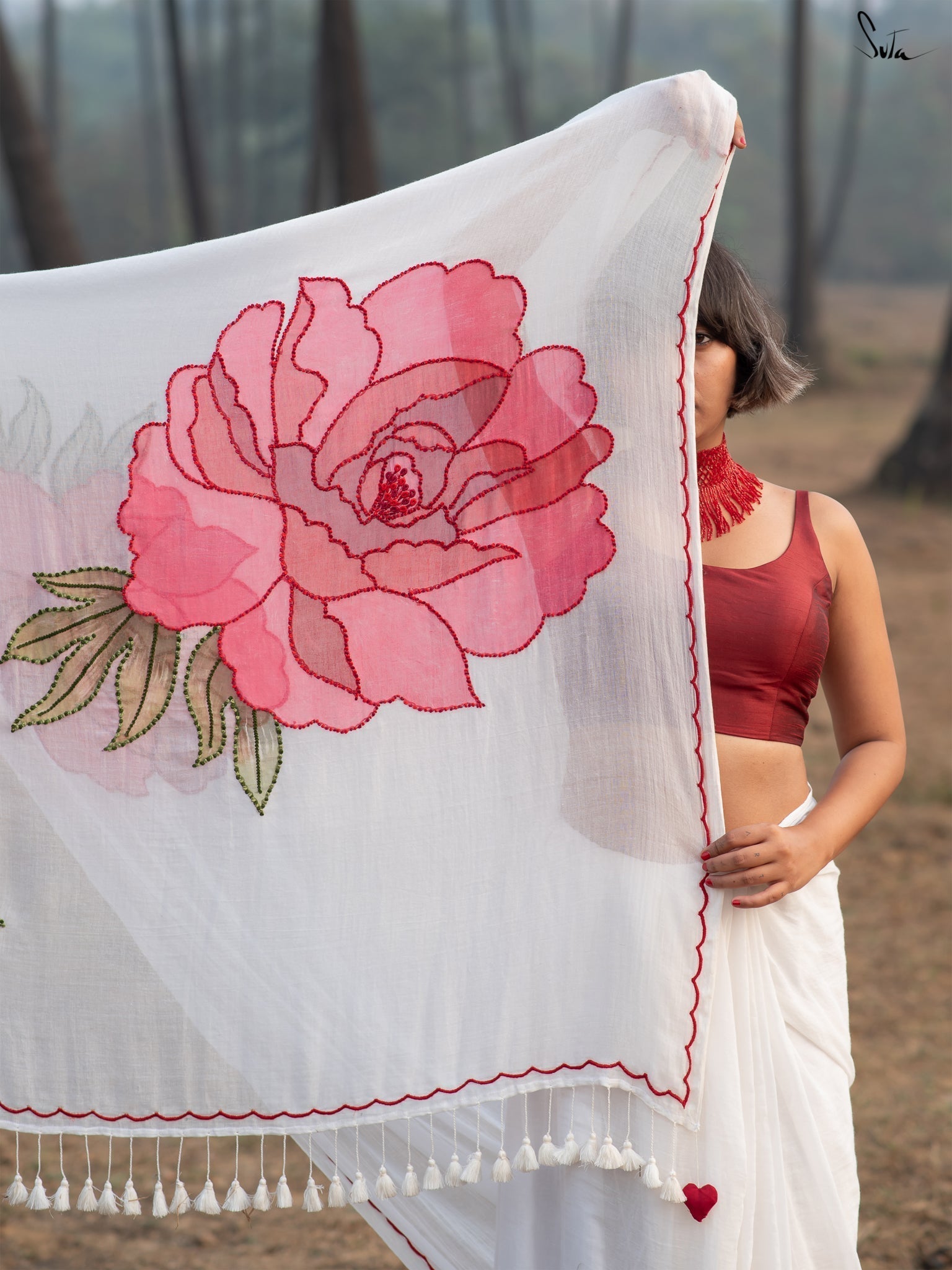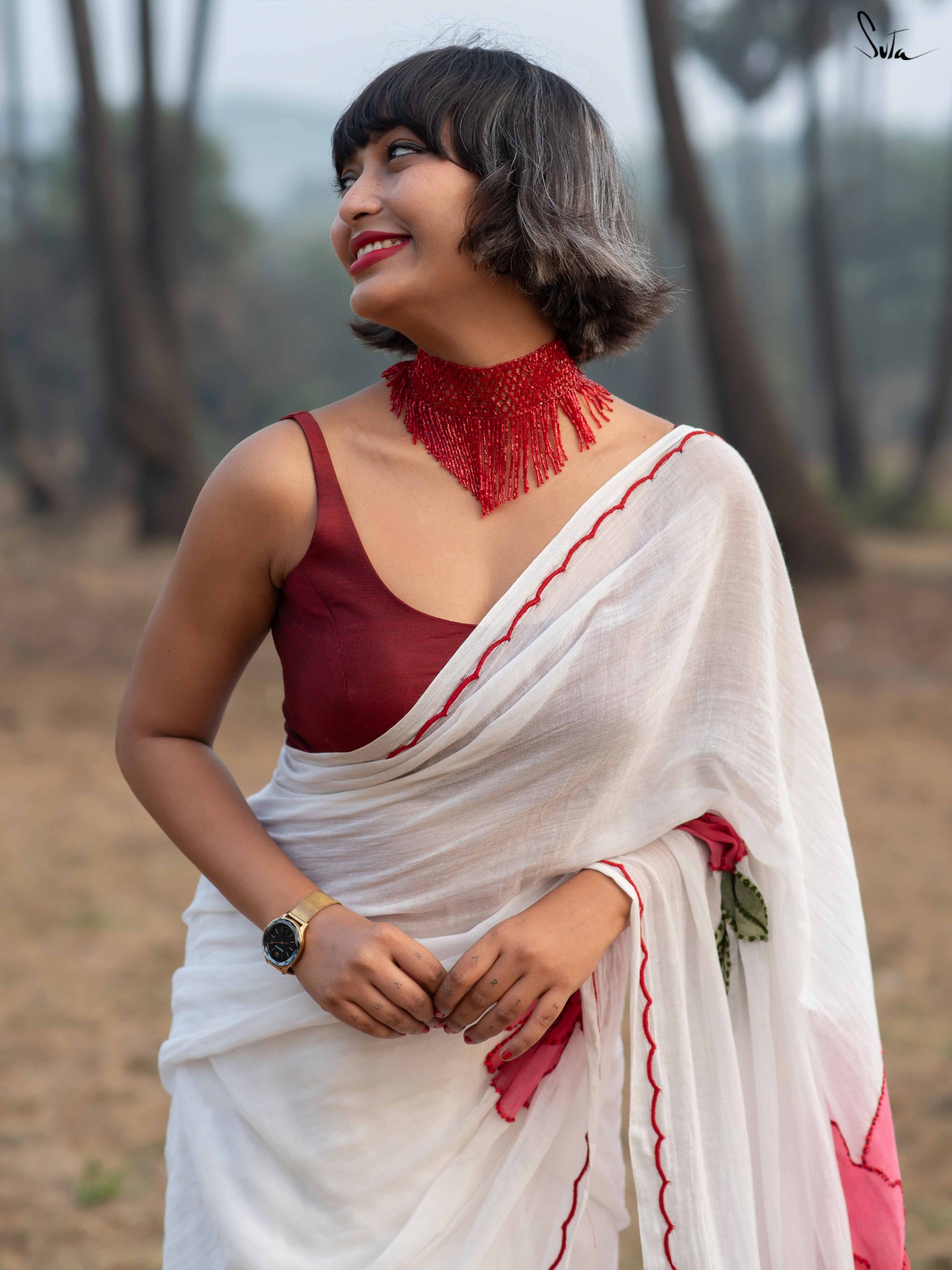 Lets toast to timeless love in this white mul cotton hand-painted and hand-embroidered saree.