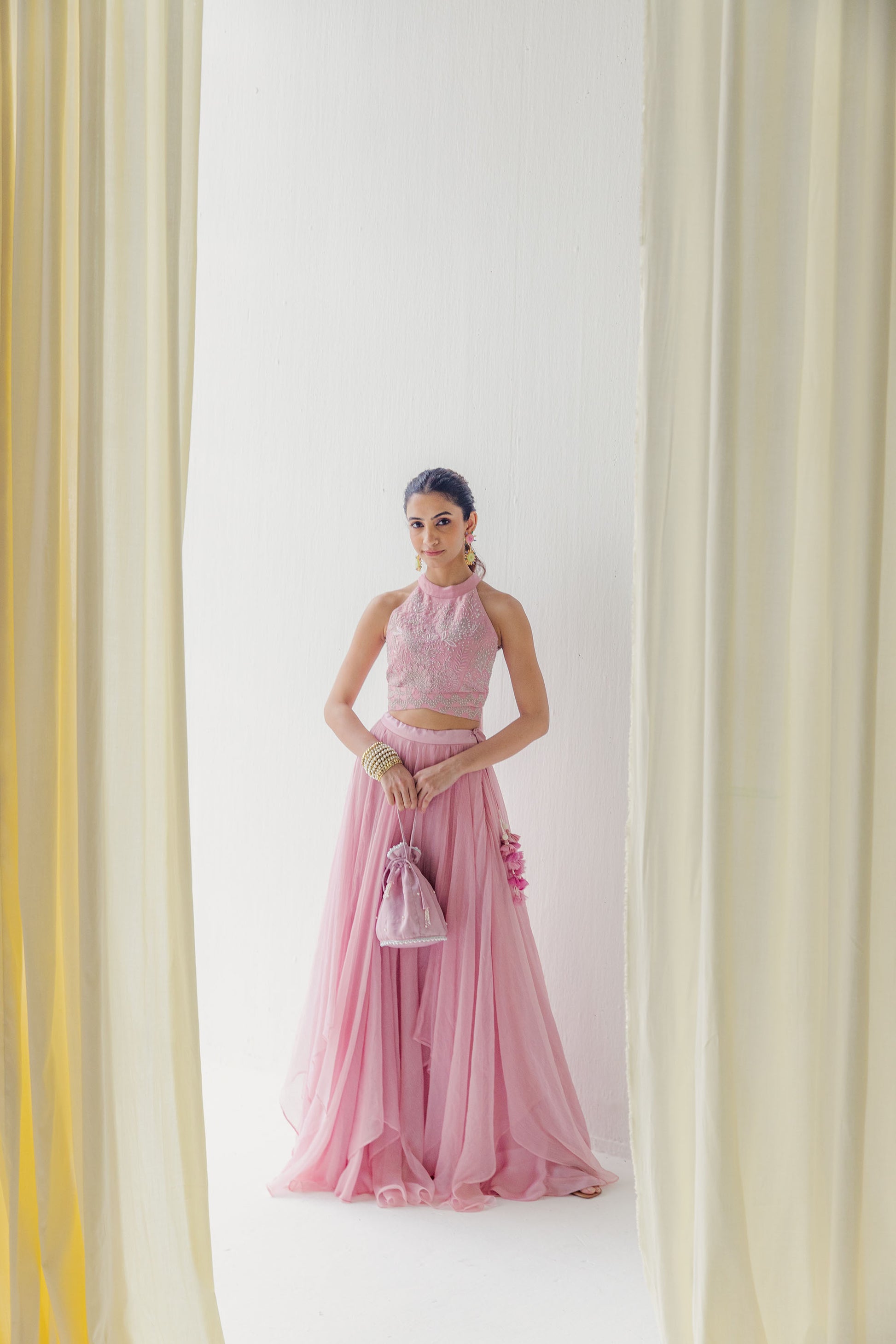 Blush Pink Embroidered Lehenga Set with Cape-Style DupattaThe Amara Set features a blush pink raw silk halter top with aquatic floral embroidery and a criss-cross back. The layered lehenga is crafted from satin georgette and shimmer chiffon. A marble-textured shimmer chiffon drape replaces the dupatta for a cape-like effect.Product Type: Three-Piece Lehenga SetPattern: Floral Embroidery with Marble Print CapeLength: Top – Cropped | Lehenga – Floor-LengthClosure: Side ZipLining: Fully Lined