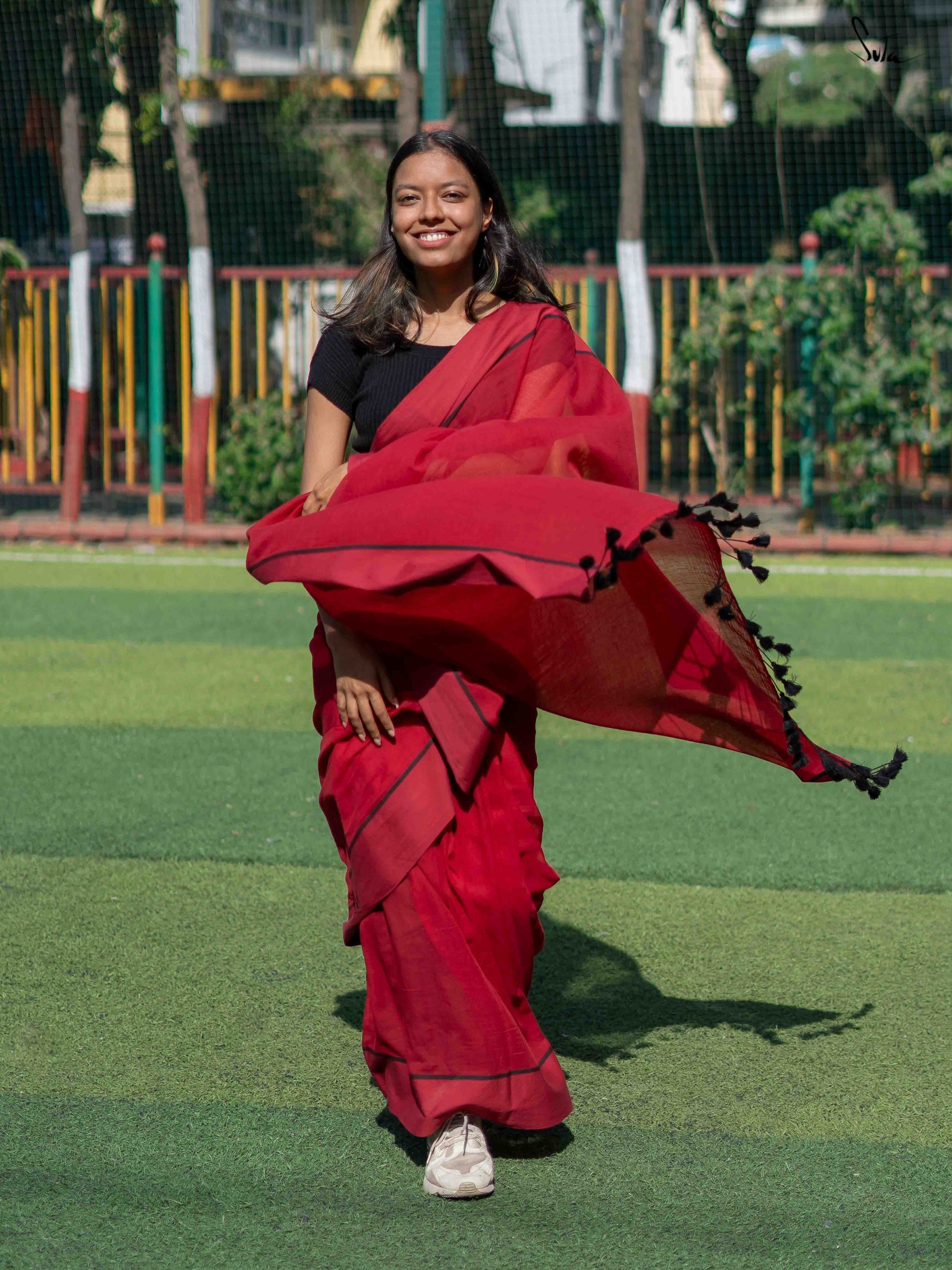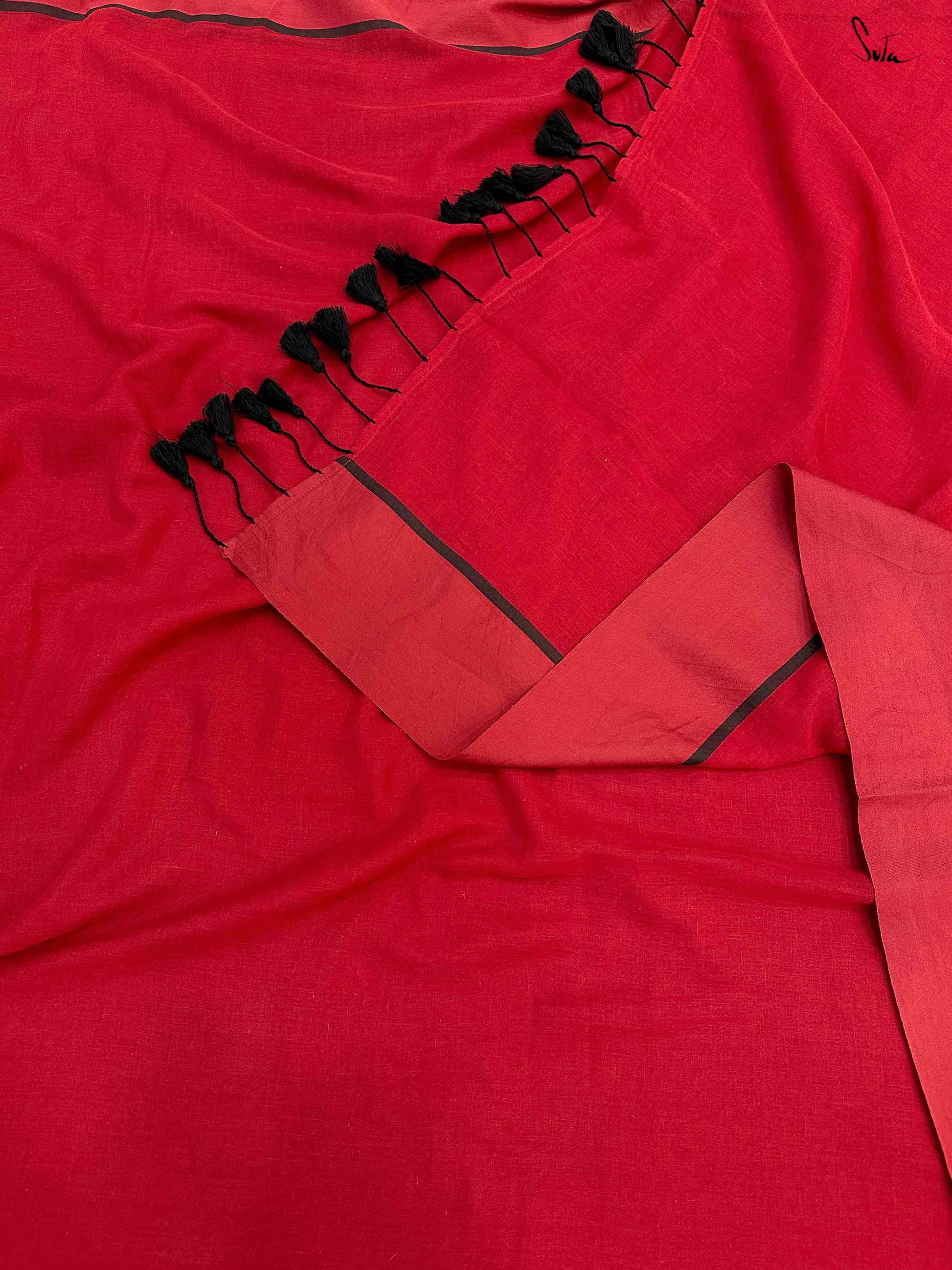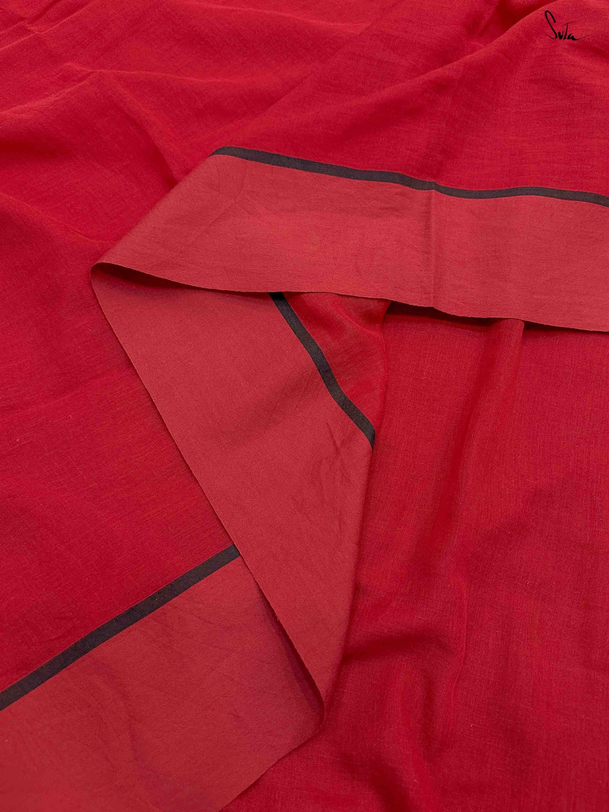 Look magical in this red mul cotton saree with a striking black border. This garment will take to your shape, letting your individuality flourish. Fanning your curiosity for an adventure as free-spirited as YOU, it will swathe you in heavenly softness.