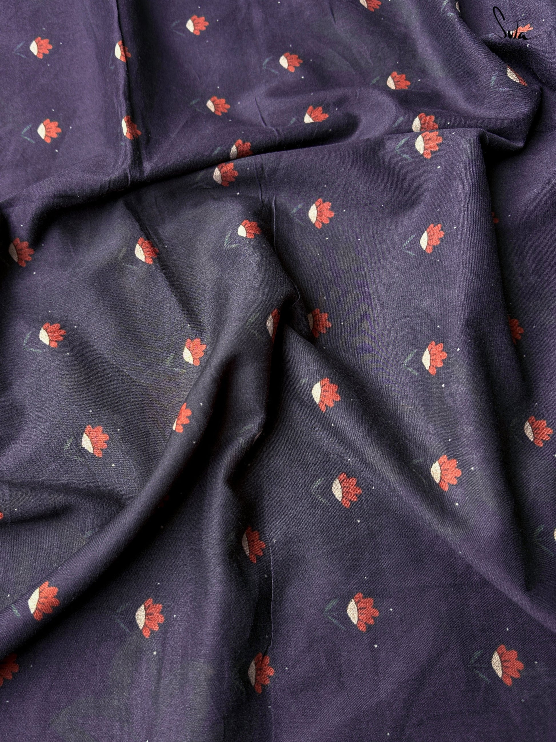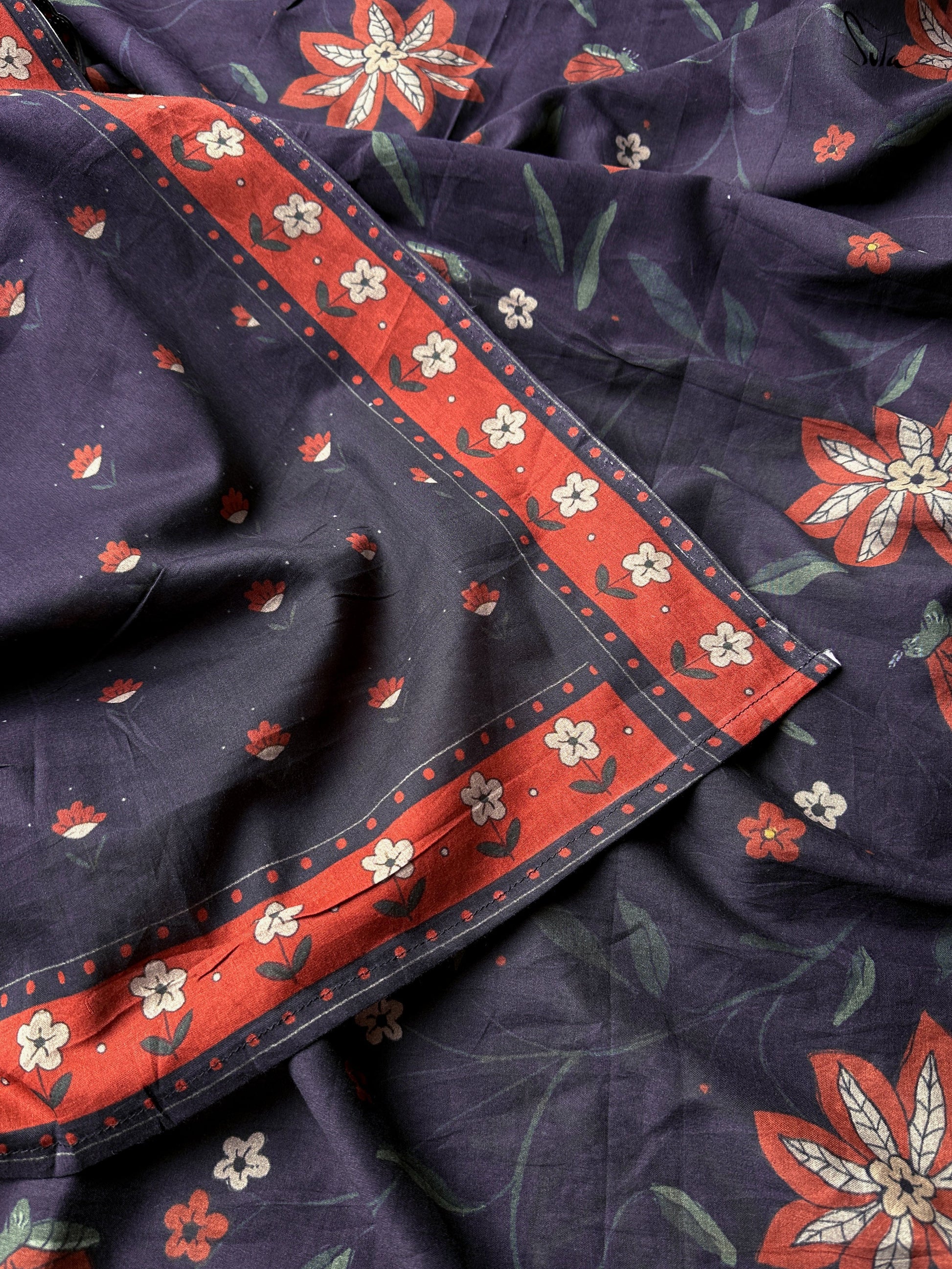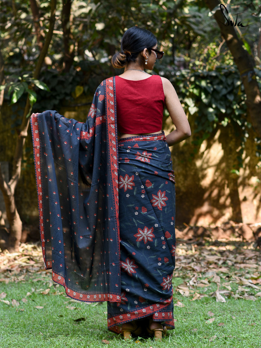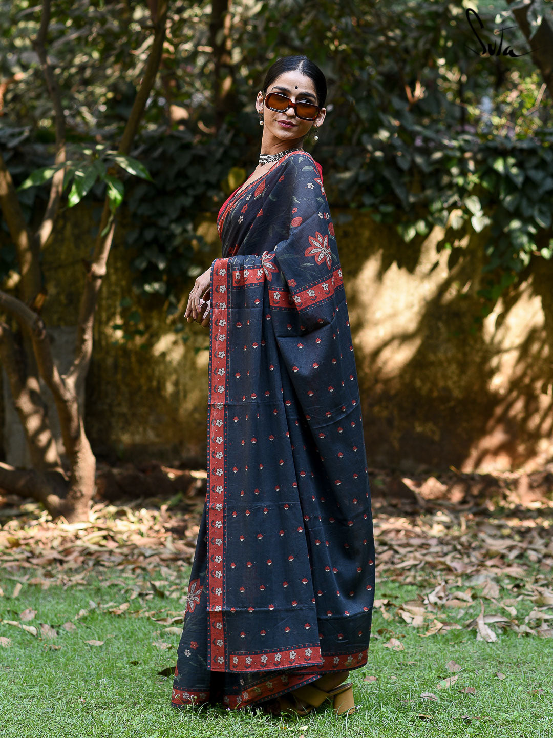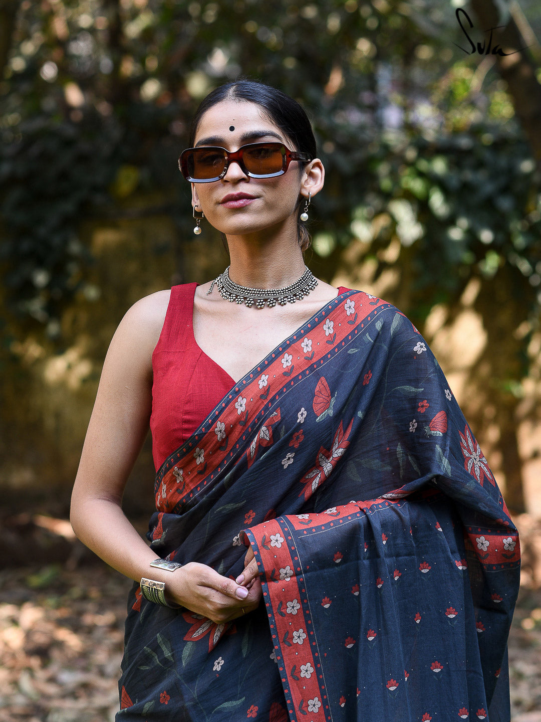 A lightweight, figure-flattering saree thats made of pure cotton is just what your wardrobe ordered. The red-tinged floral accents on a background of the deepest navy blue make this saree truly memorable.