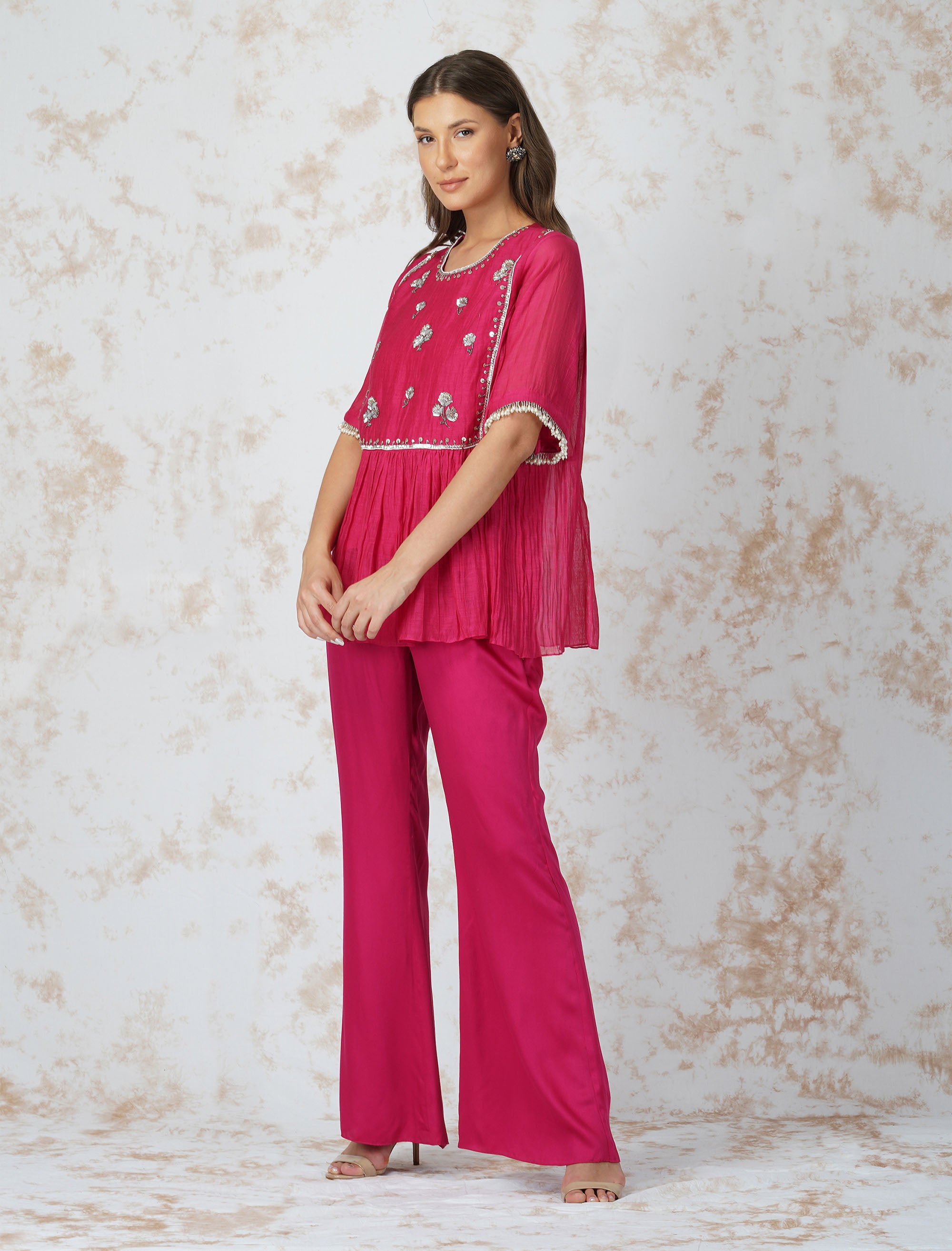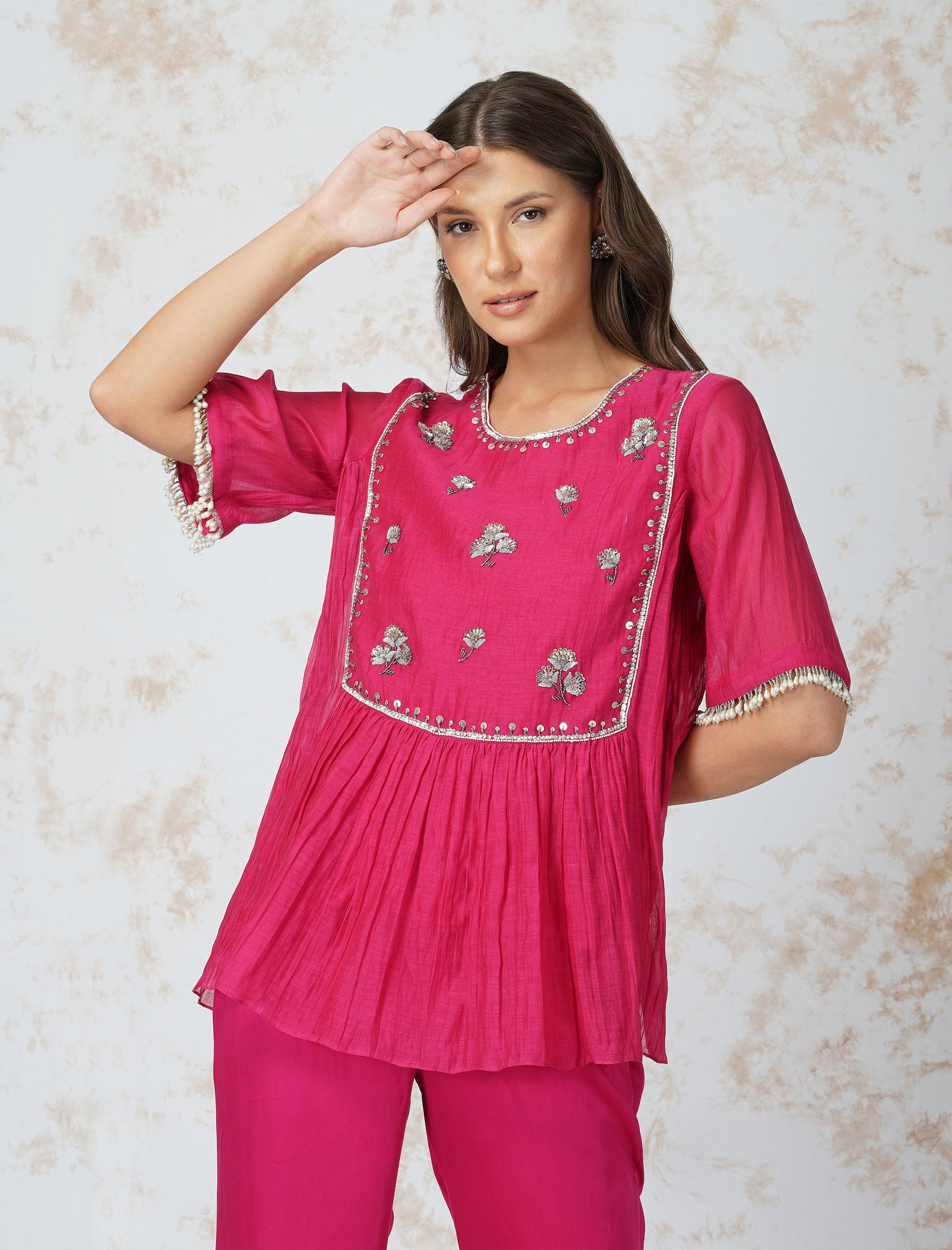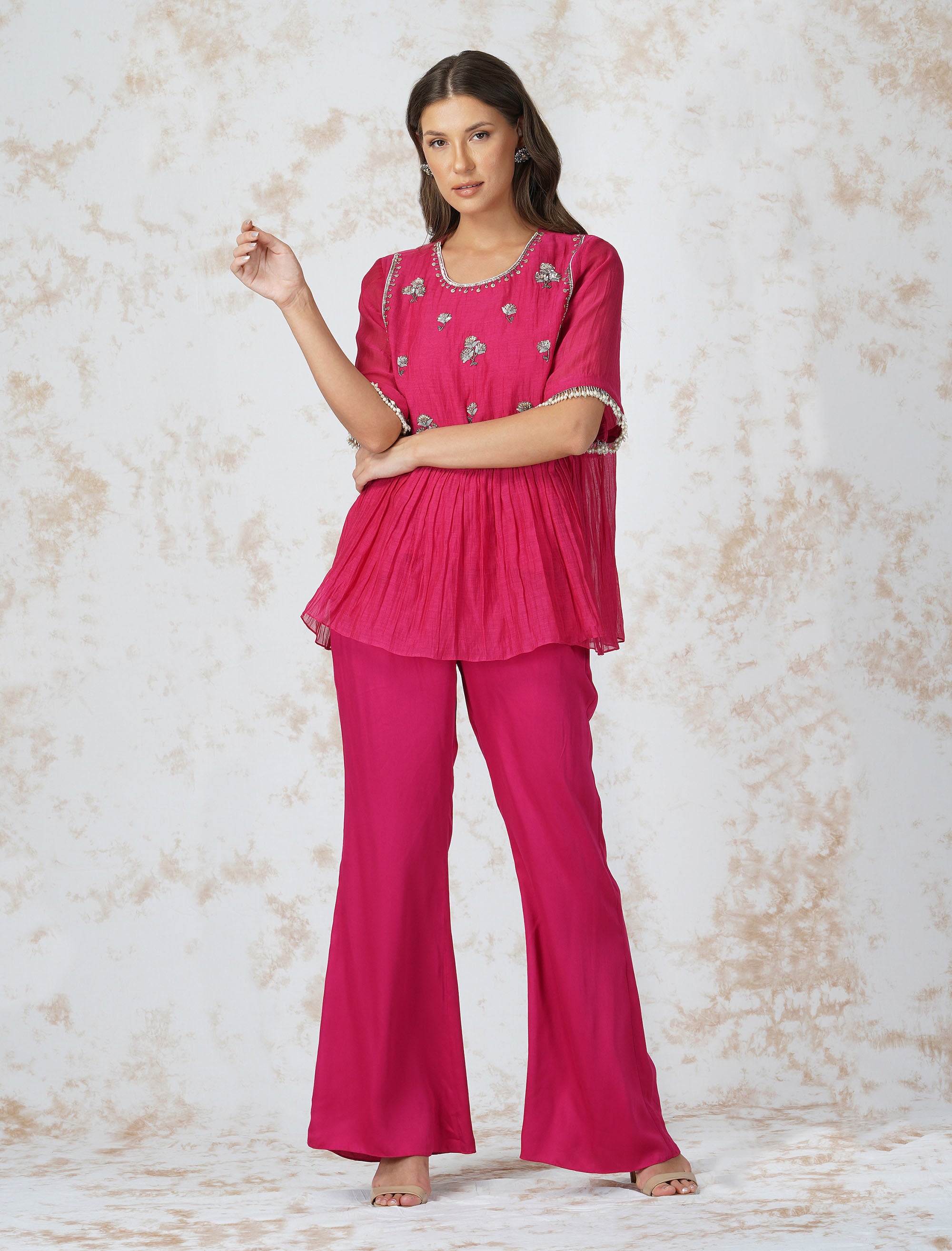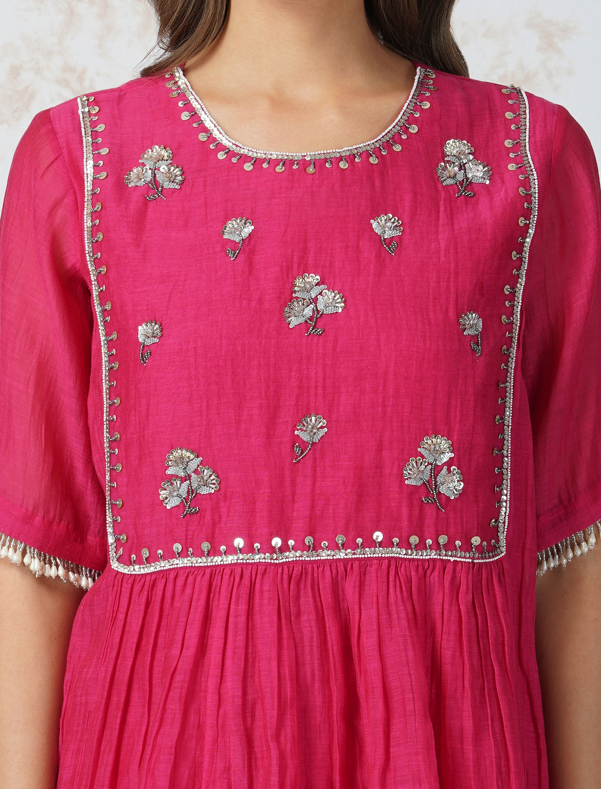 Antique Work Tiered Hot Pink Top Set
