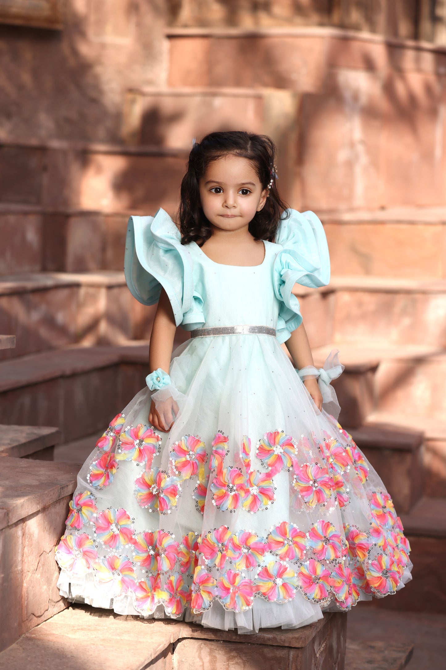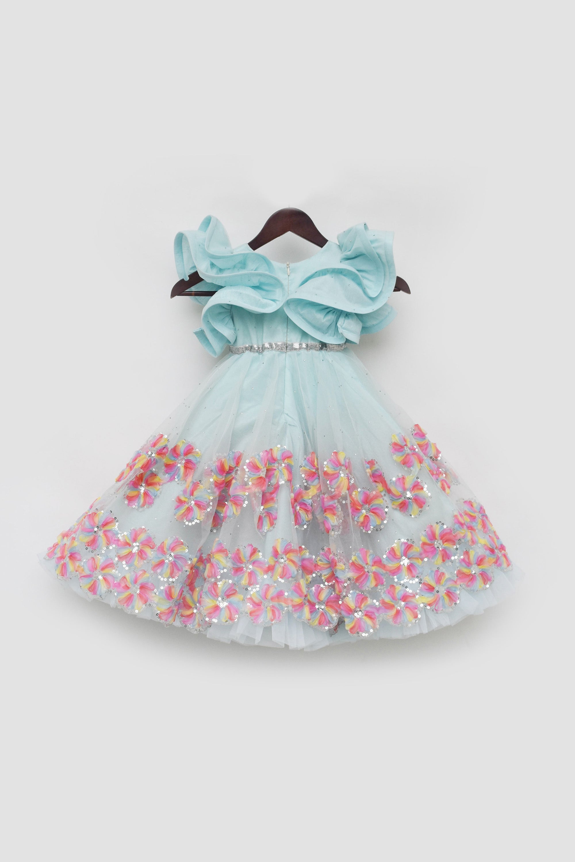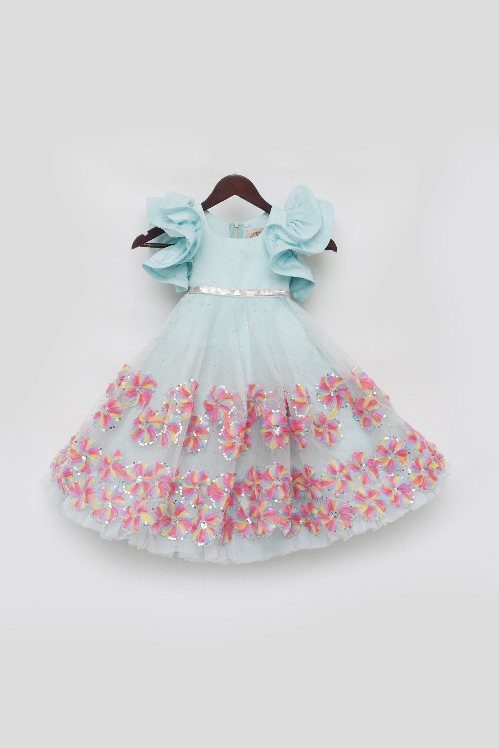 Introducing our girls' Aqua Blue Gown, a mesmerizing ensemble that exudes elegance and charm. The gown, with its cotton lining and frill sleeves, ensures comfort and brings unparalleled glamour to any occasion. The 3D flower and sequence border detailing adds an extra element of oomph, while the sequence silver belt accentuates the waistline for a perfect fit. Whether it's a wedding, or any special event, this aqua blue gown will make your little girl feel like a princess, ready to make a statement with her impeccable style.