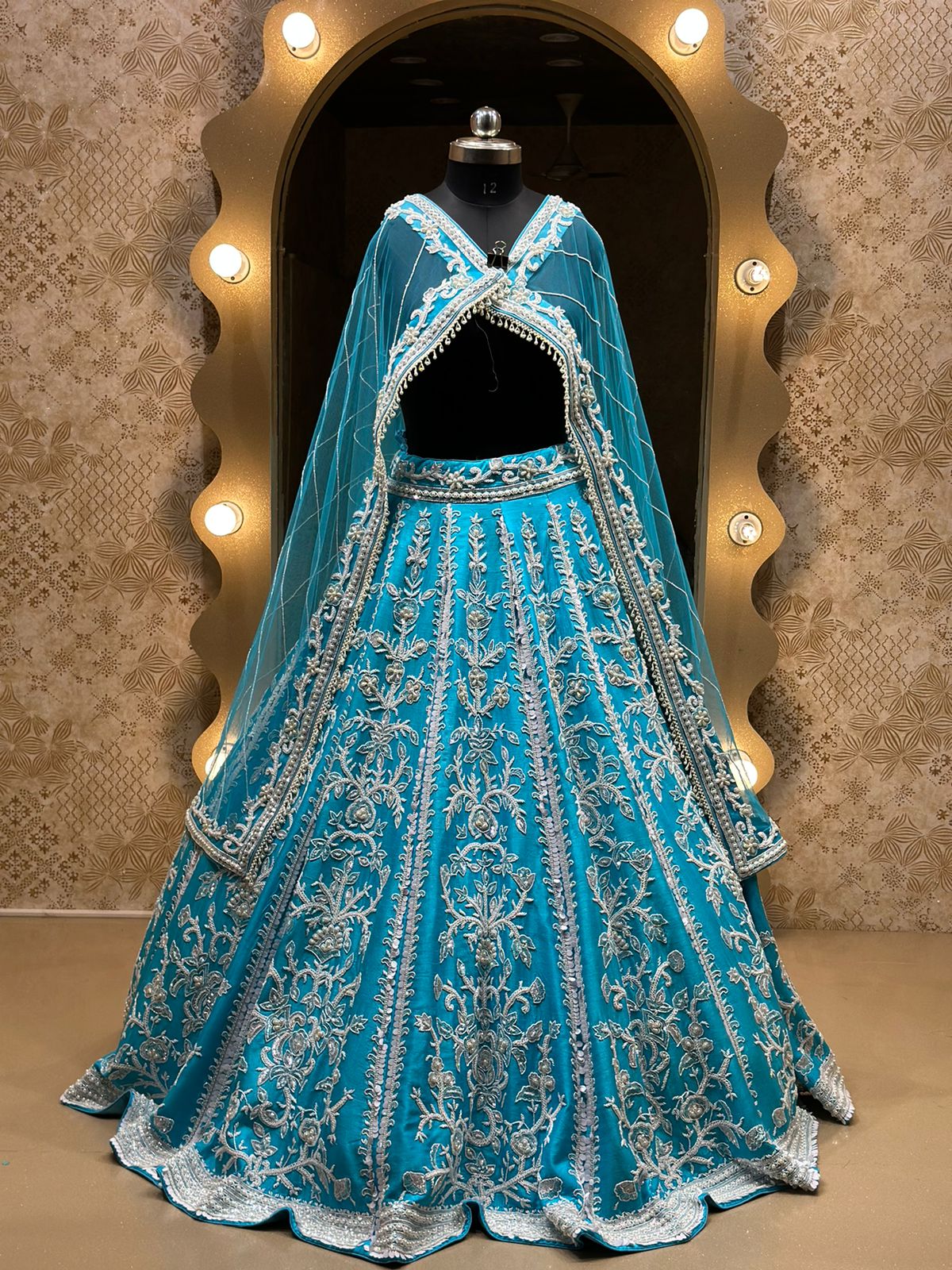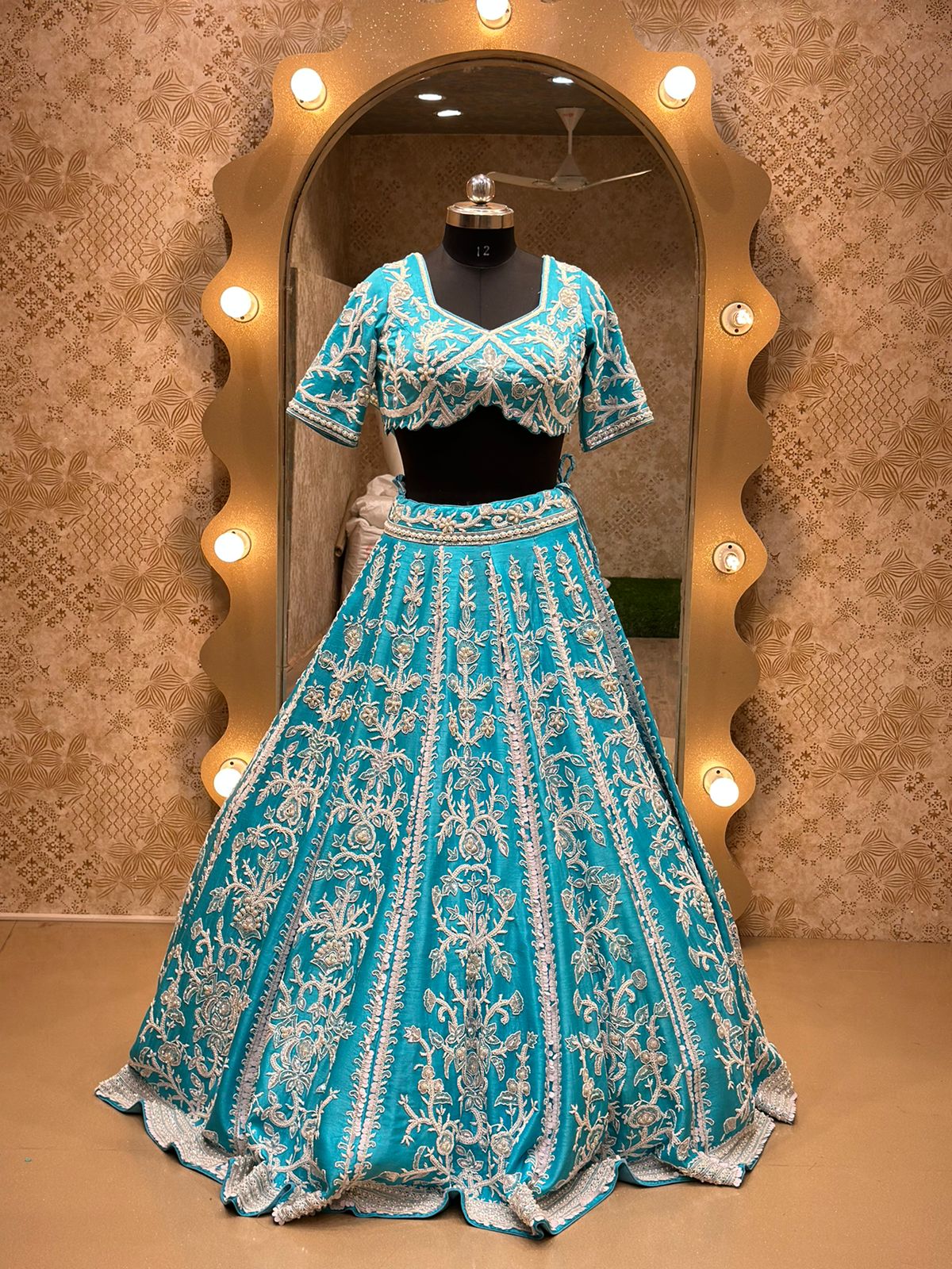Aqua Raw Silk Silver thread Embroidered Bridal Lehenga