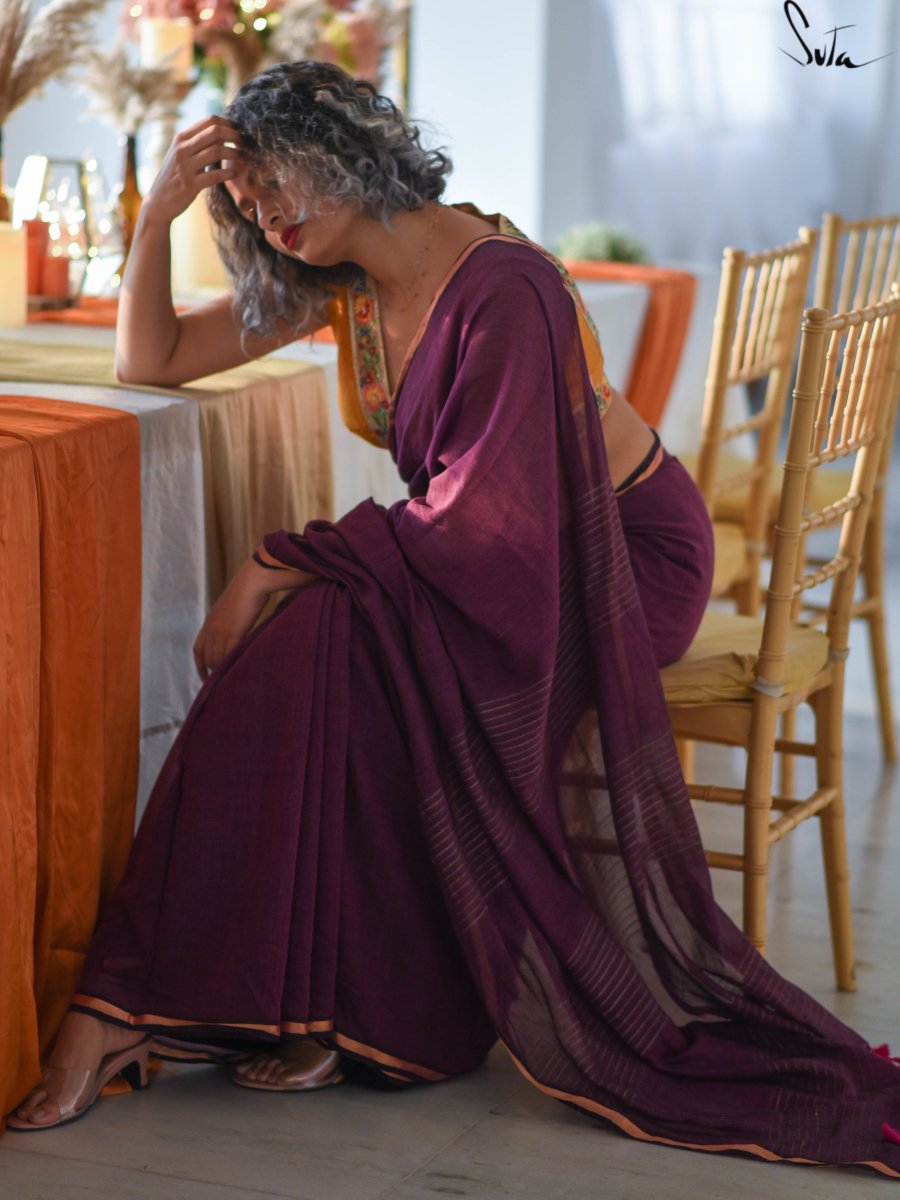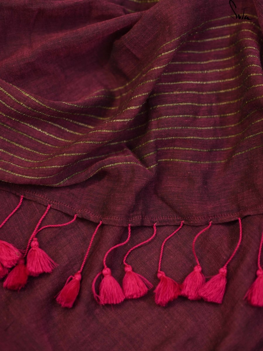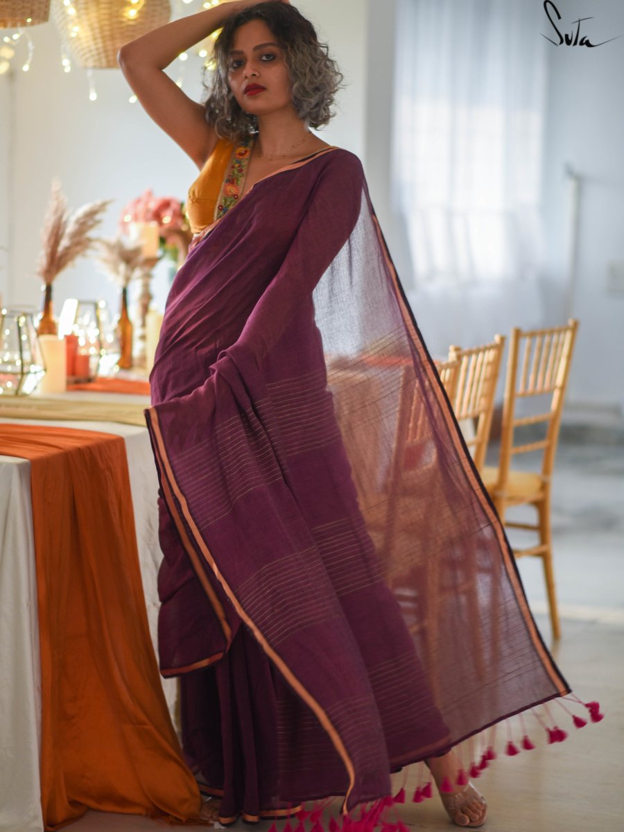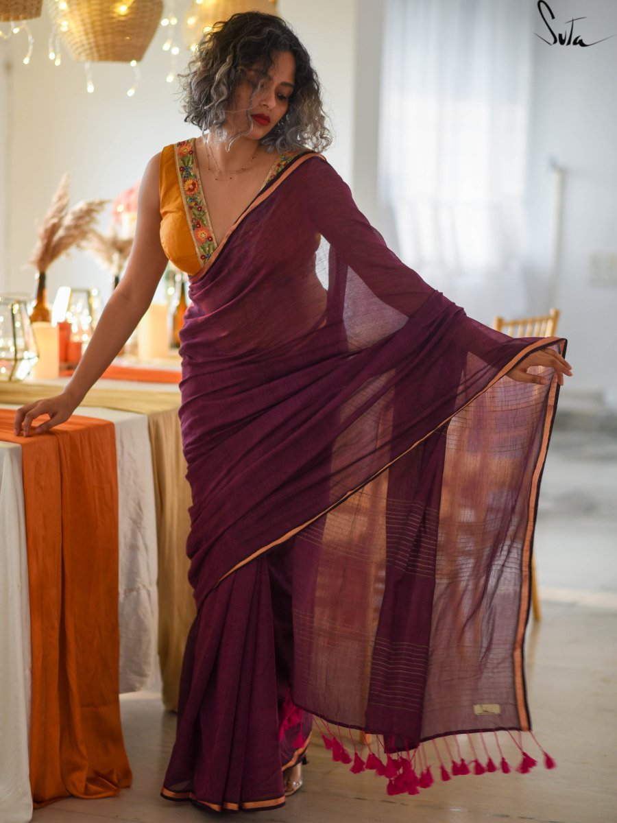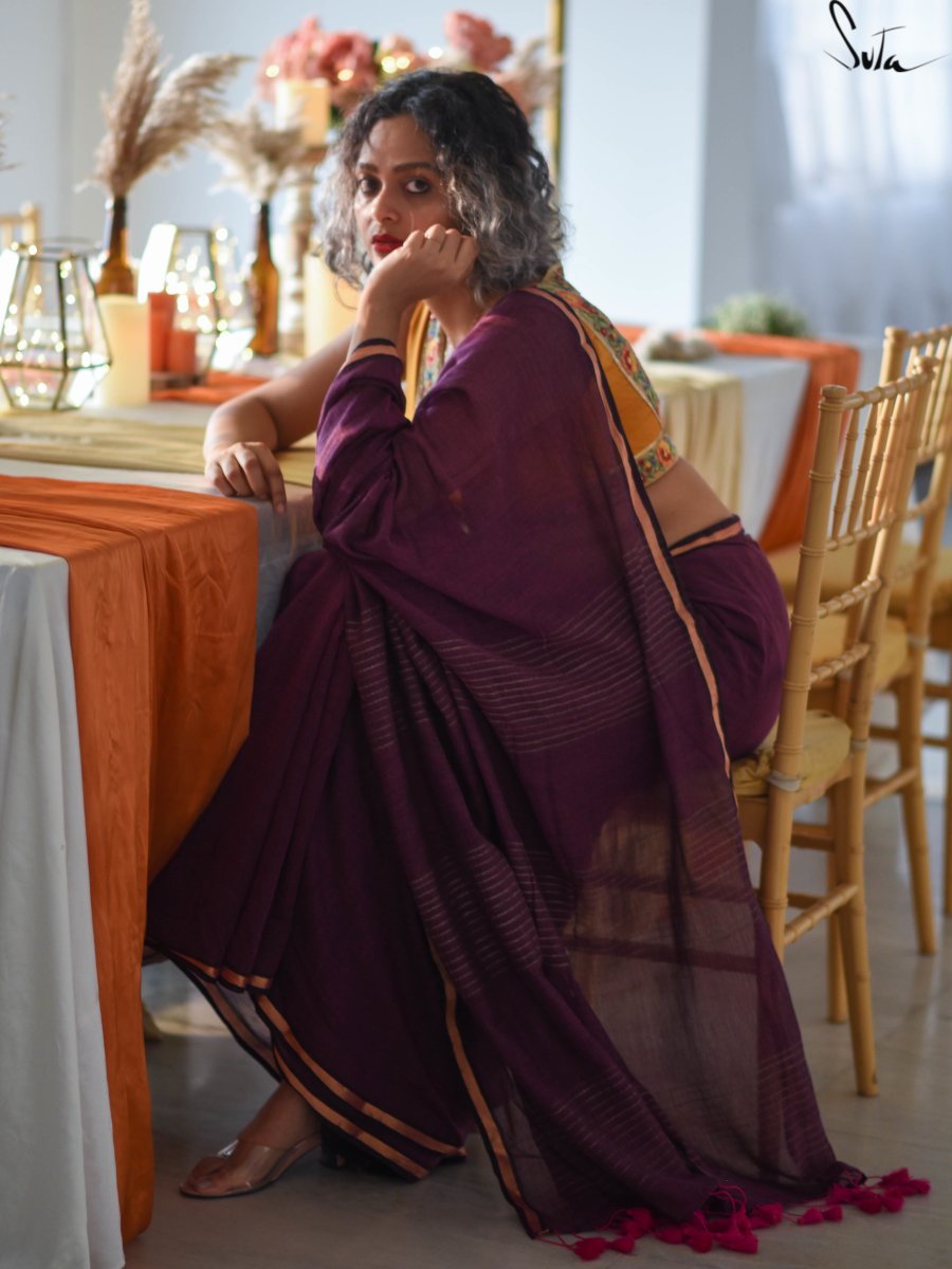 This gorgeous made-in-heaven mul cotton saree in purple with pink tassels and beautiful Ghicha lines on the pallu and zari border is enough in itself to make a stunning statement!