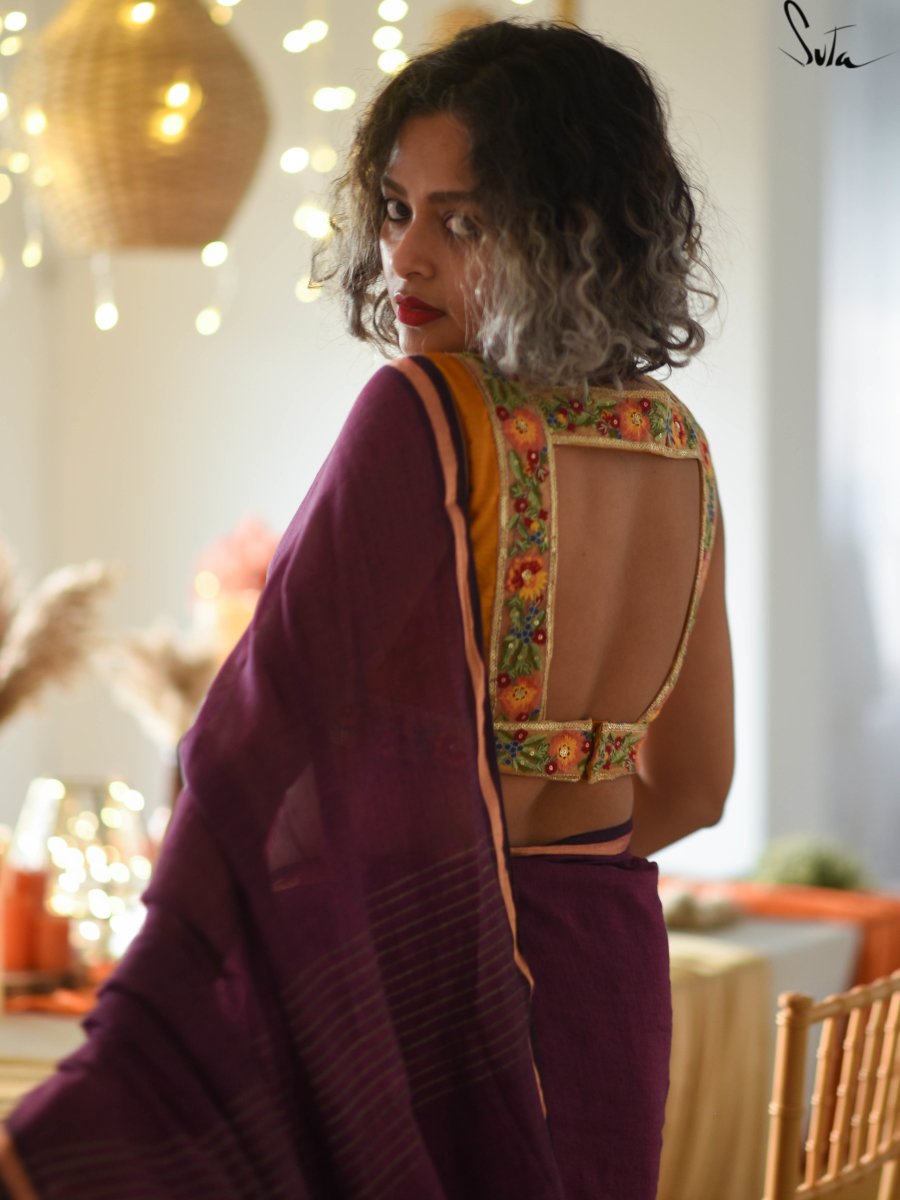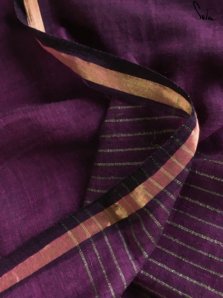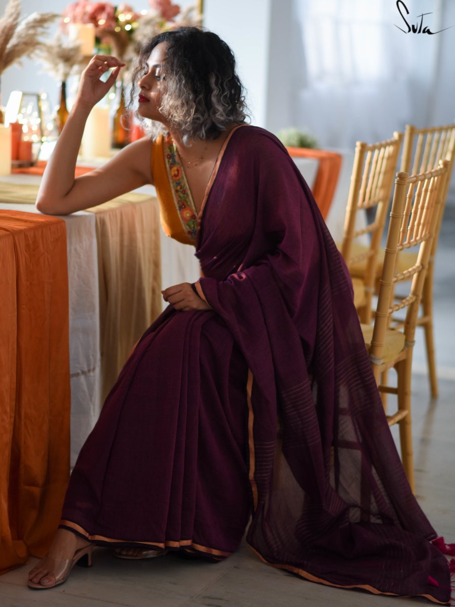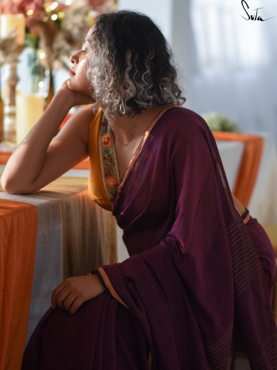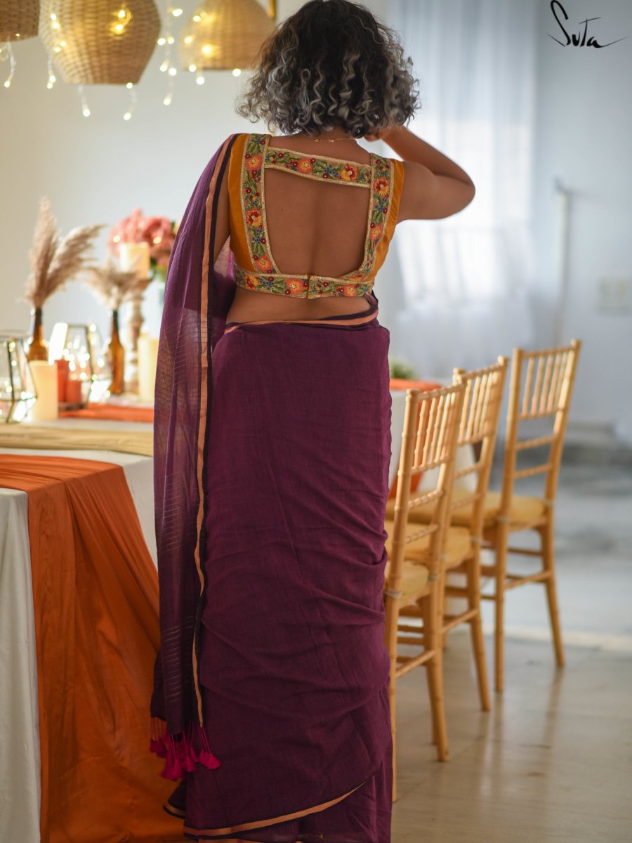 This gorgeous made-in-heaven mul cotton saree in purple with pink tassels and beautiful Ghicha lines on the pallu and zari border is enough in itself to make a stunning statement!