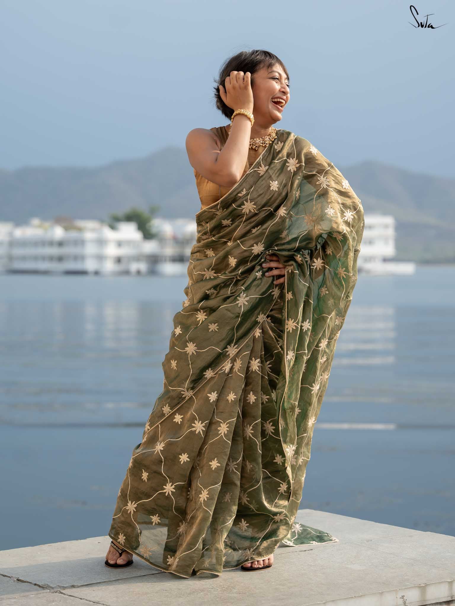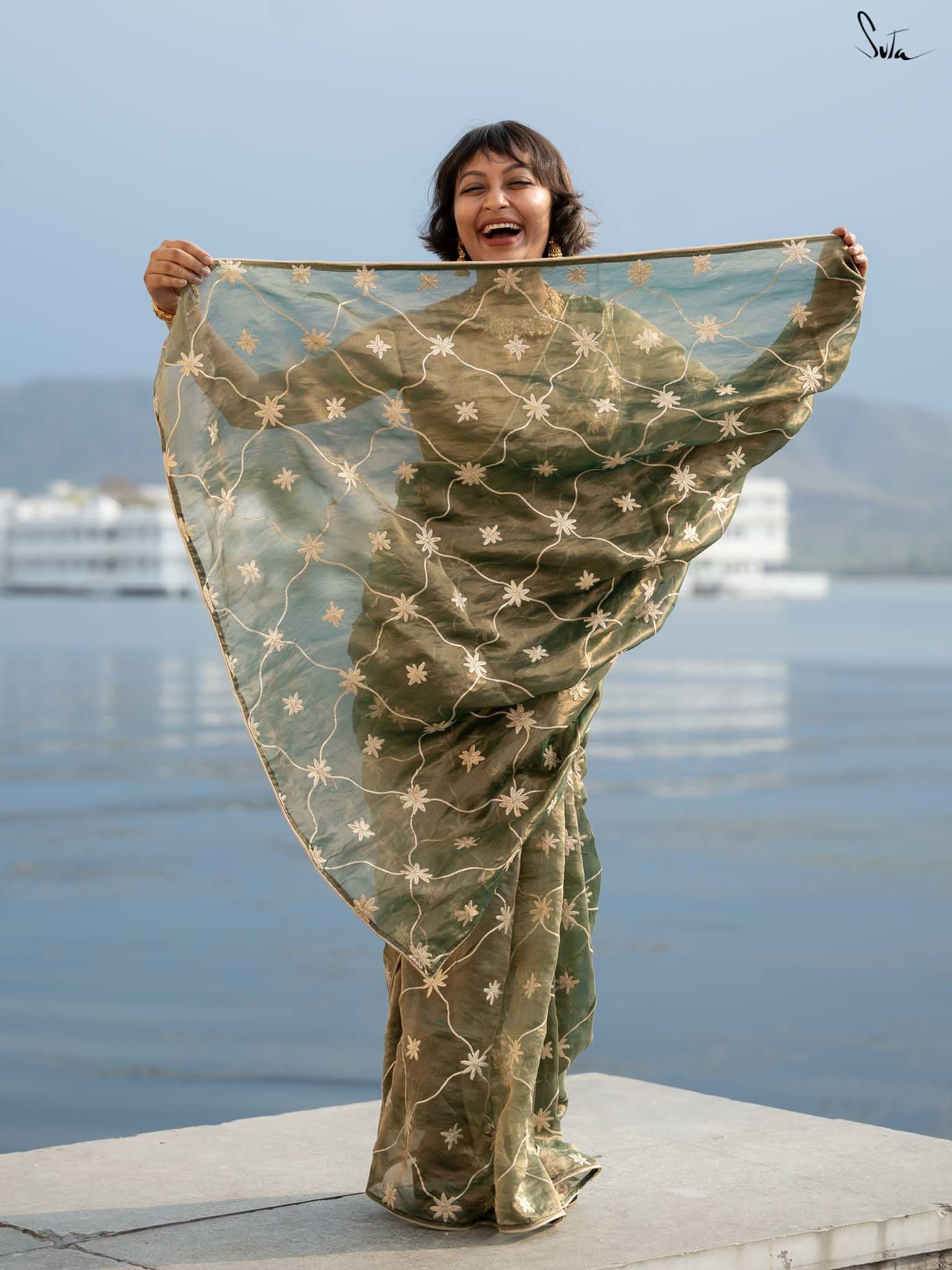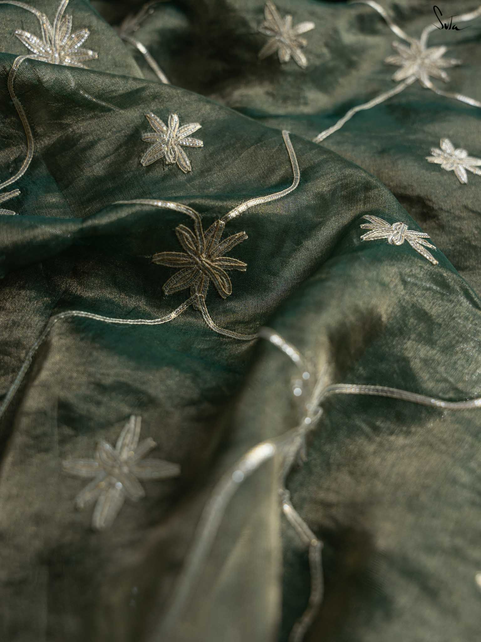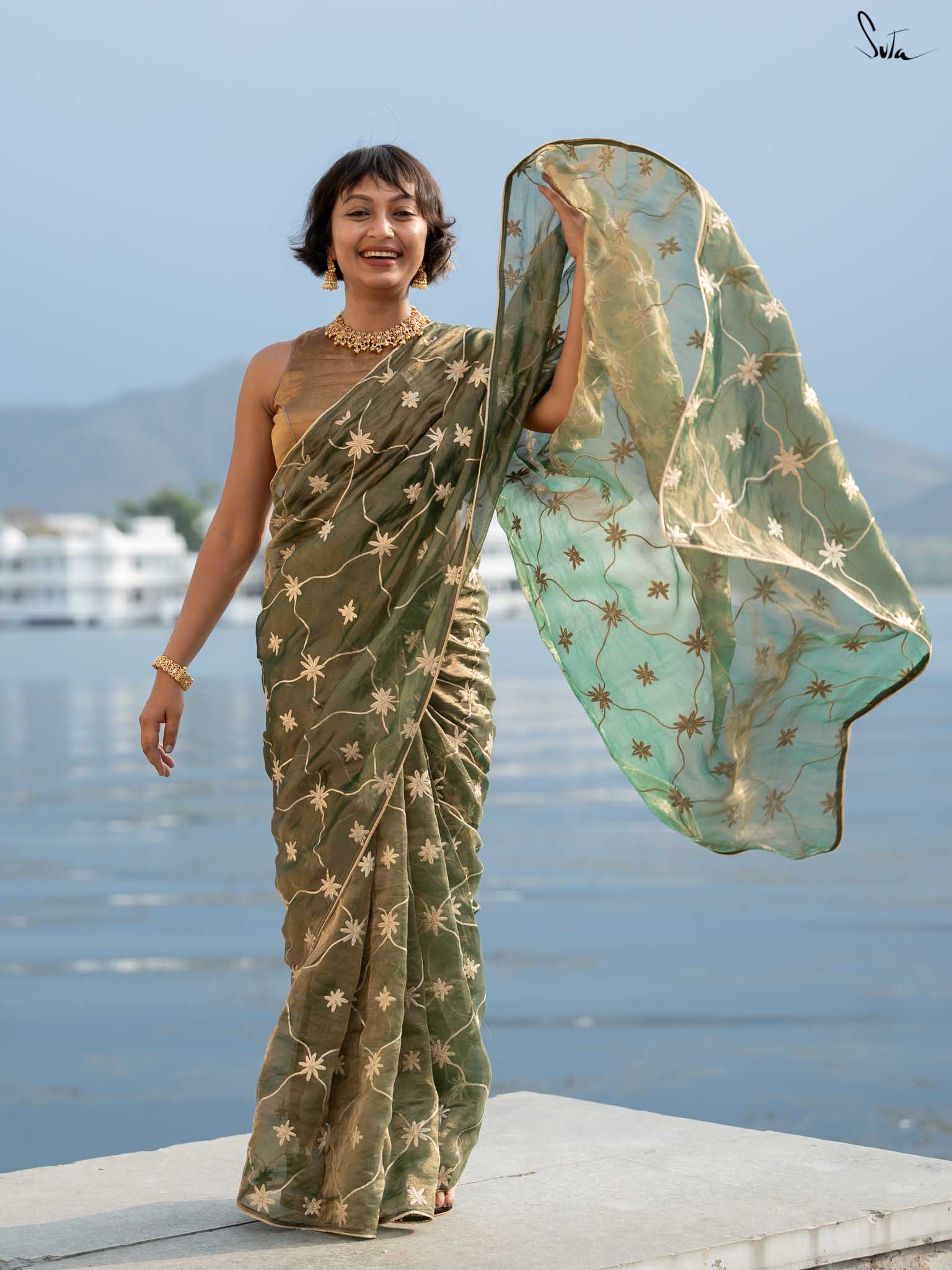 Armin embodies the beauty of a wish coming true. This olive green saree in tissue silk creates a luminous effect that mirrors the night sky filled with stars. Adorned with an all-over hand-embroidered gota patti design and hand-embellished chumki, this saree shines with a celestial glow. Perfect for the season, Armin embodies the understated glamour of starlight, radiating grace and beauty with each step you take.