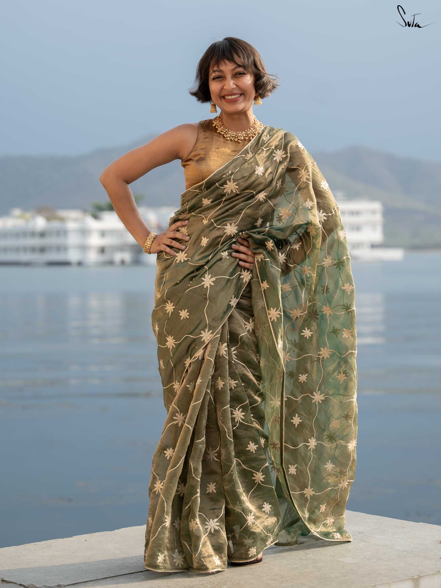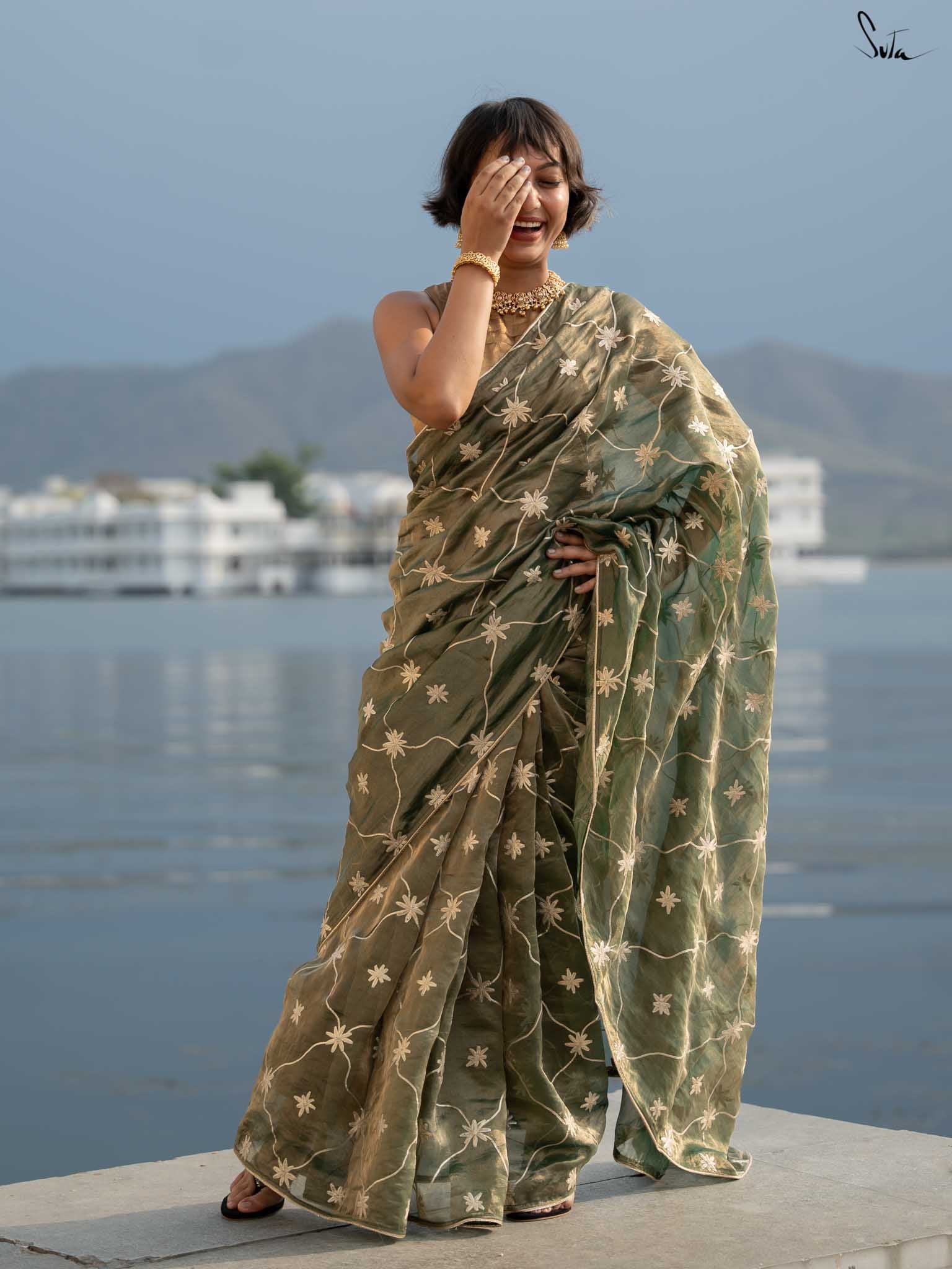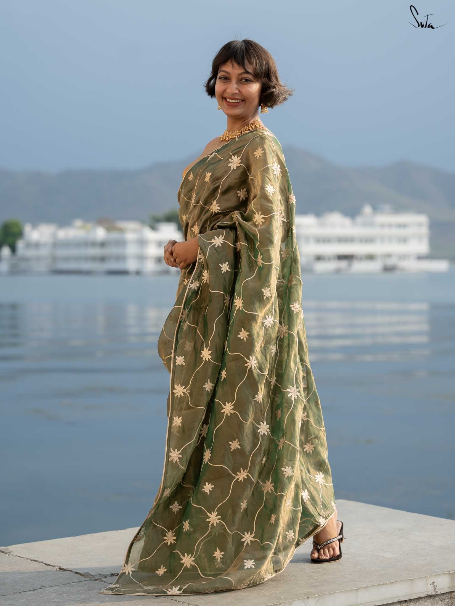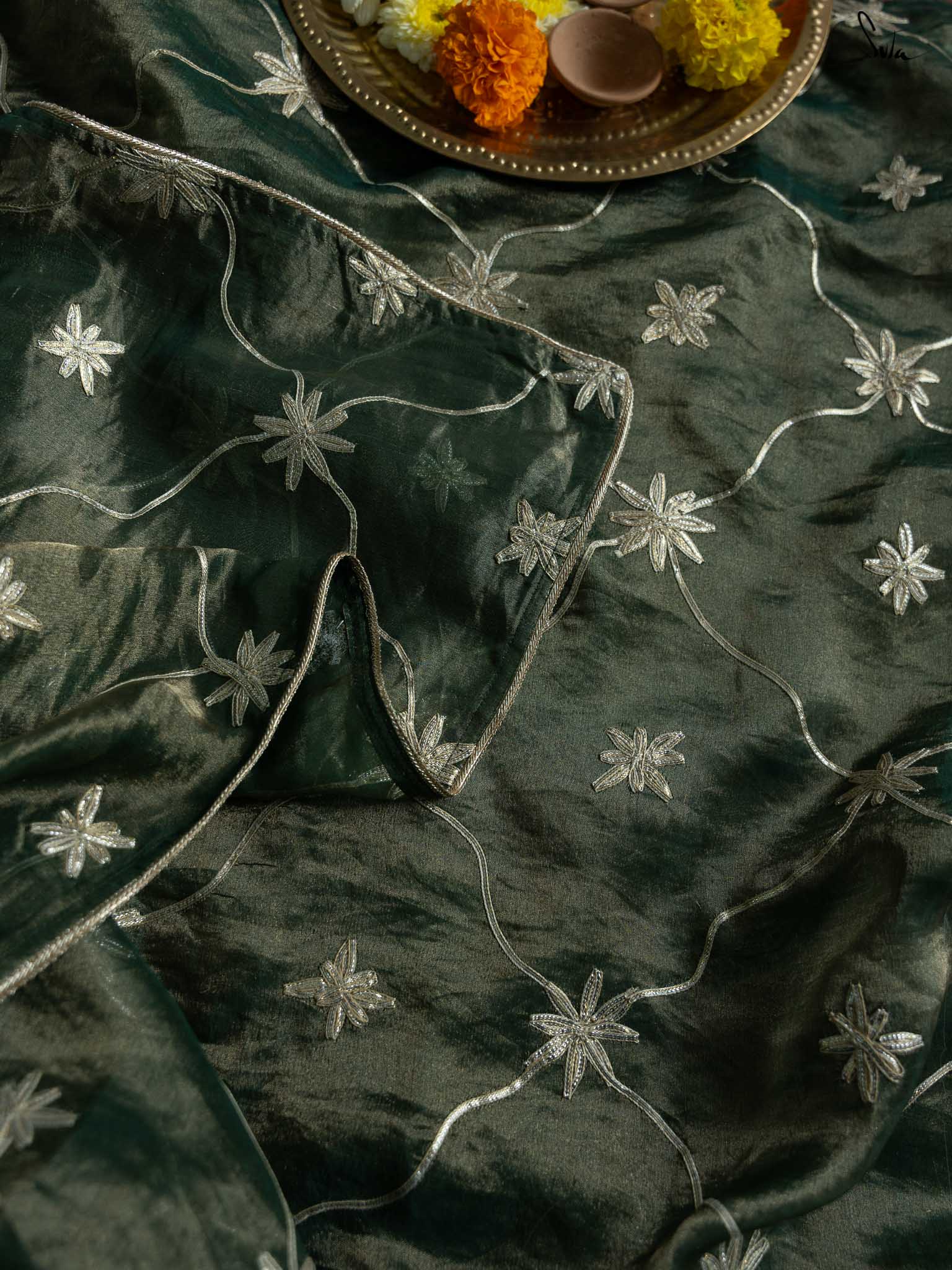 Armin embodies the beauty of a wish coming true. This olive green saree in tissue silk creates a luminous effect that mirrors the night sky filled with stars. Adorned with an all-over hand-embroidered gota patti design and hand-embellished chumki, this saree shines with a celestial glow. Perfect for the season, Armin embodies the understated glamour of starlight, radiating grace and beauty with each step you take.