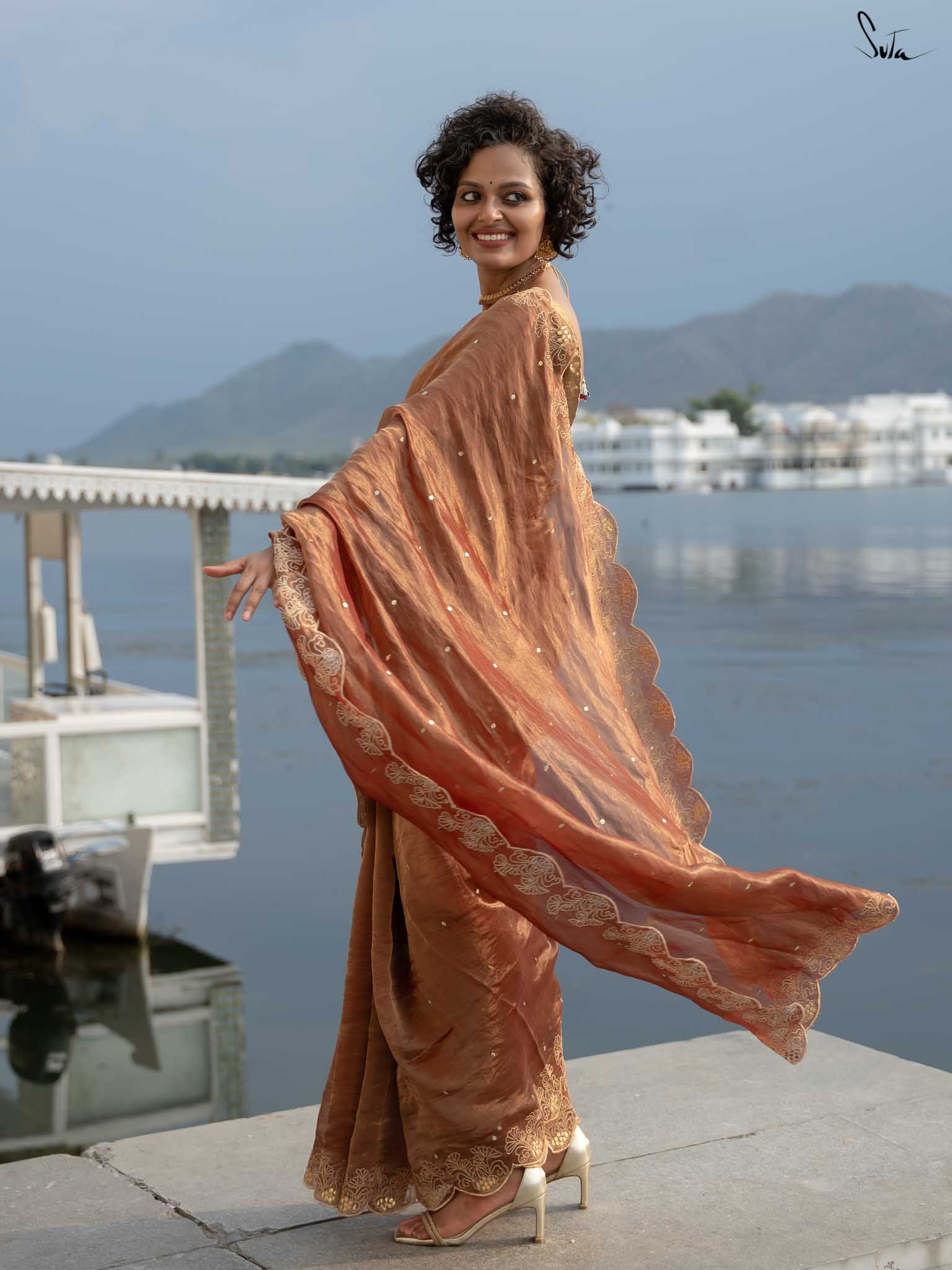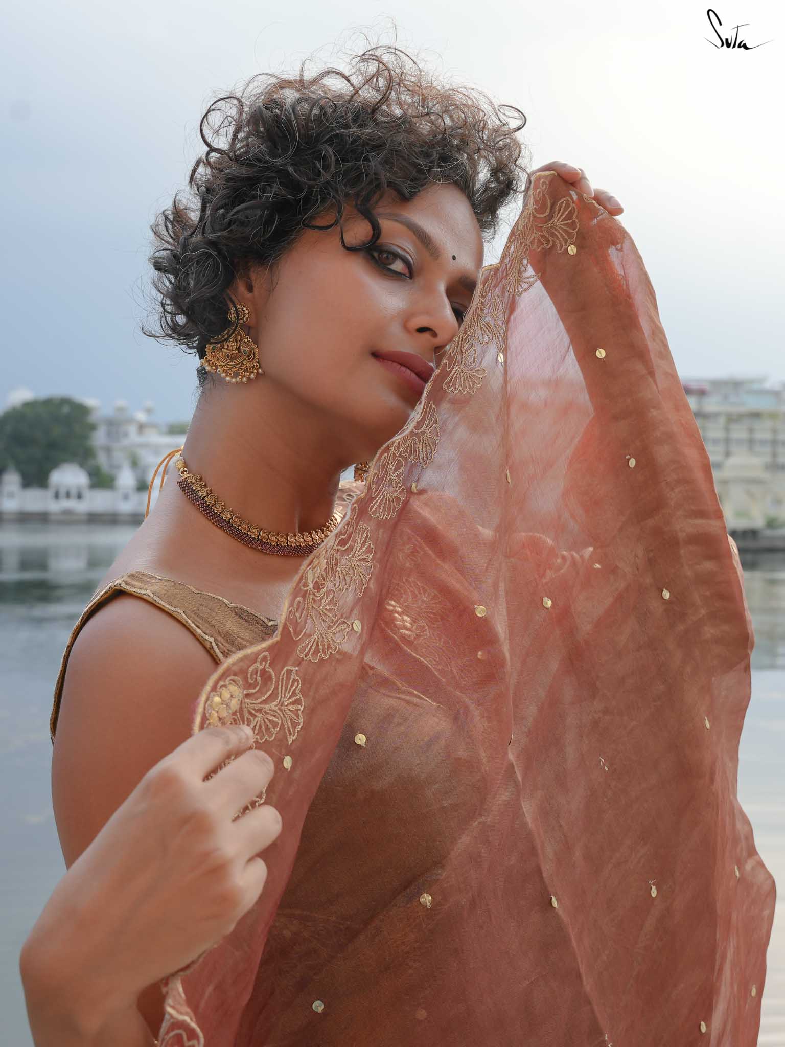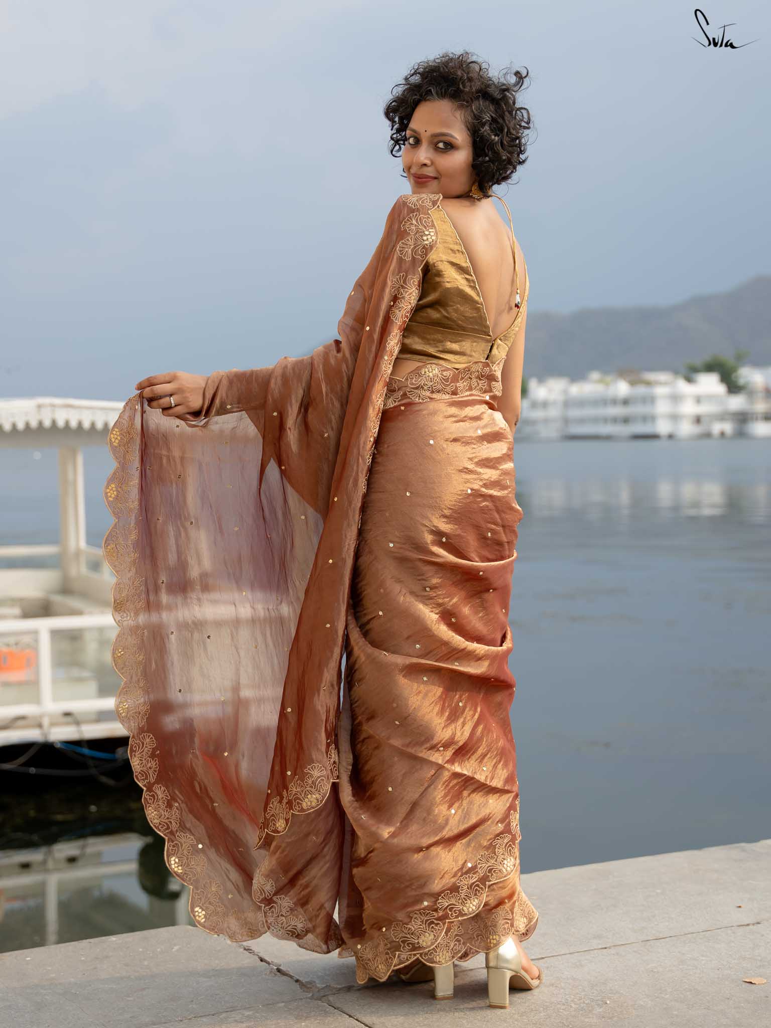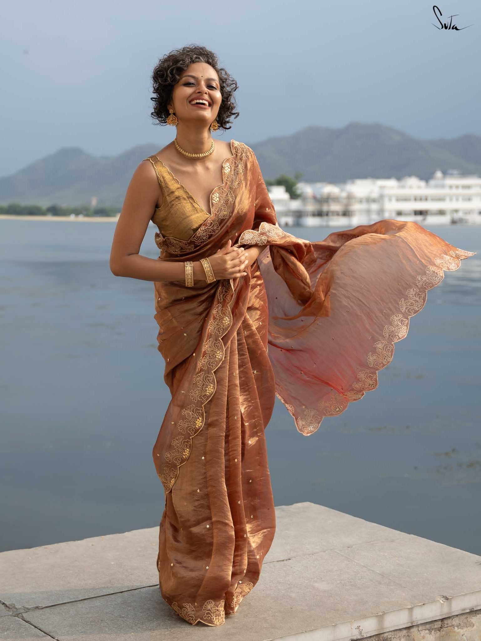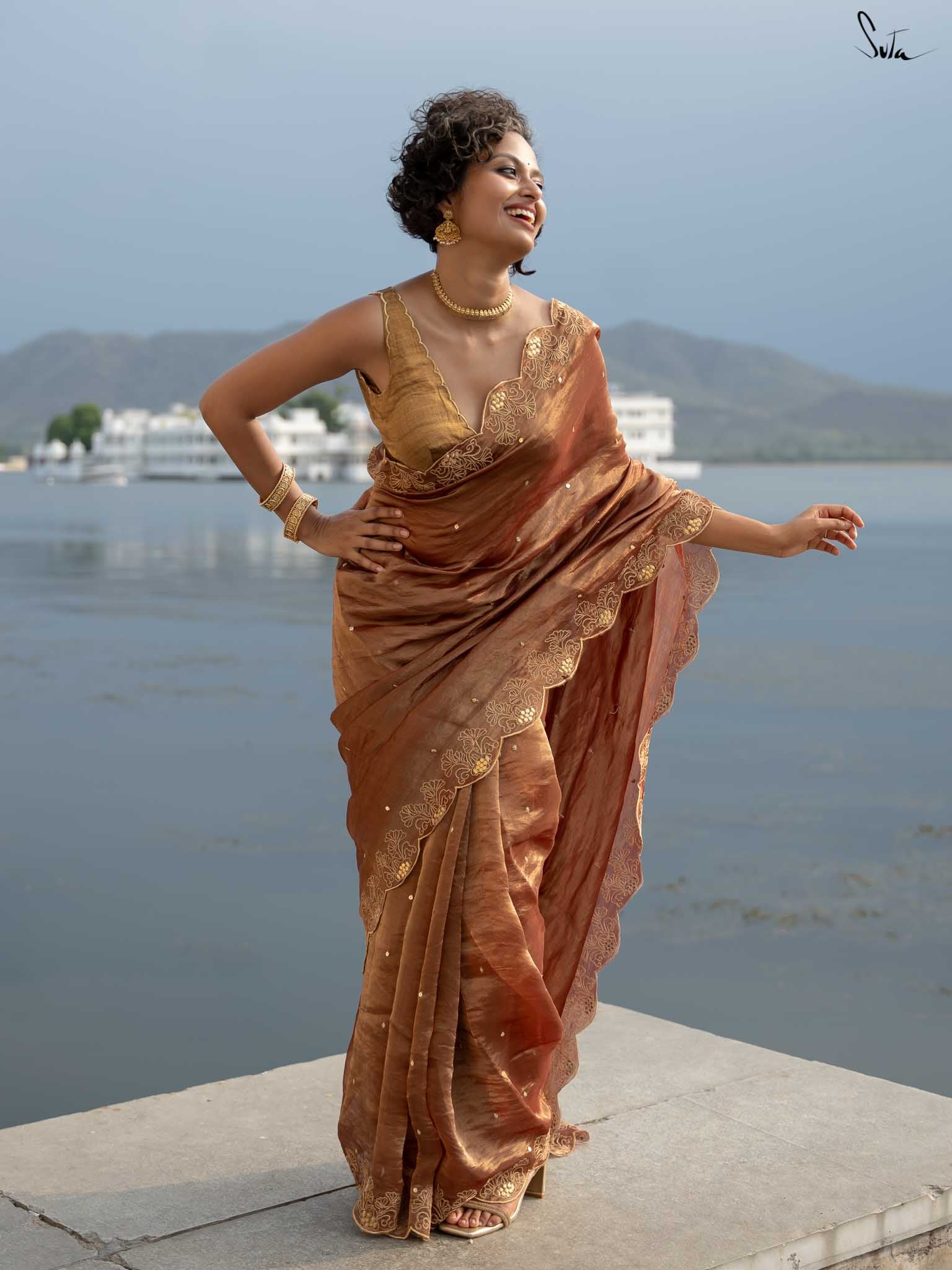 Like the silver glow of the moonlight, Arnika captures the essence of a starlit night. This rust tissue silk saree is hand-embellished with an all-over chumki work and a scalloped hand-embroidered gota patti border. Its subtle sparkle highlights your inner radiance, making Arnika perfect for moments when you want to shine with quiet elegance.