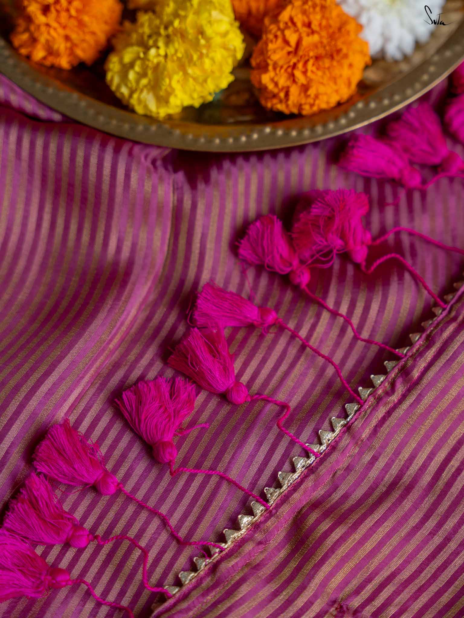 A rich burgundy saree crafted from viscose zari, featuring zari stripes and a gota border with burgundy tassels. It’s the perfect choice for festive occasions, adding elegance and allure to your look.