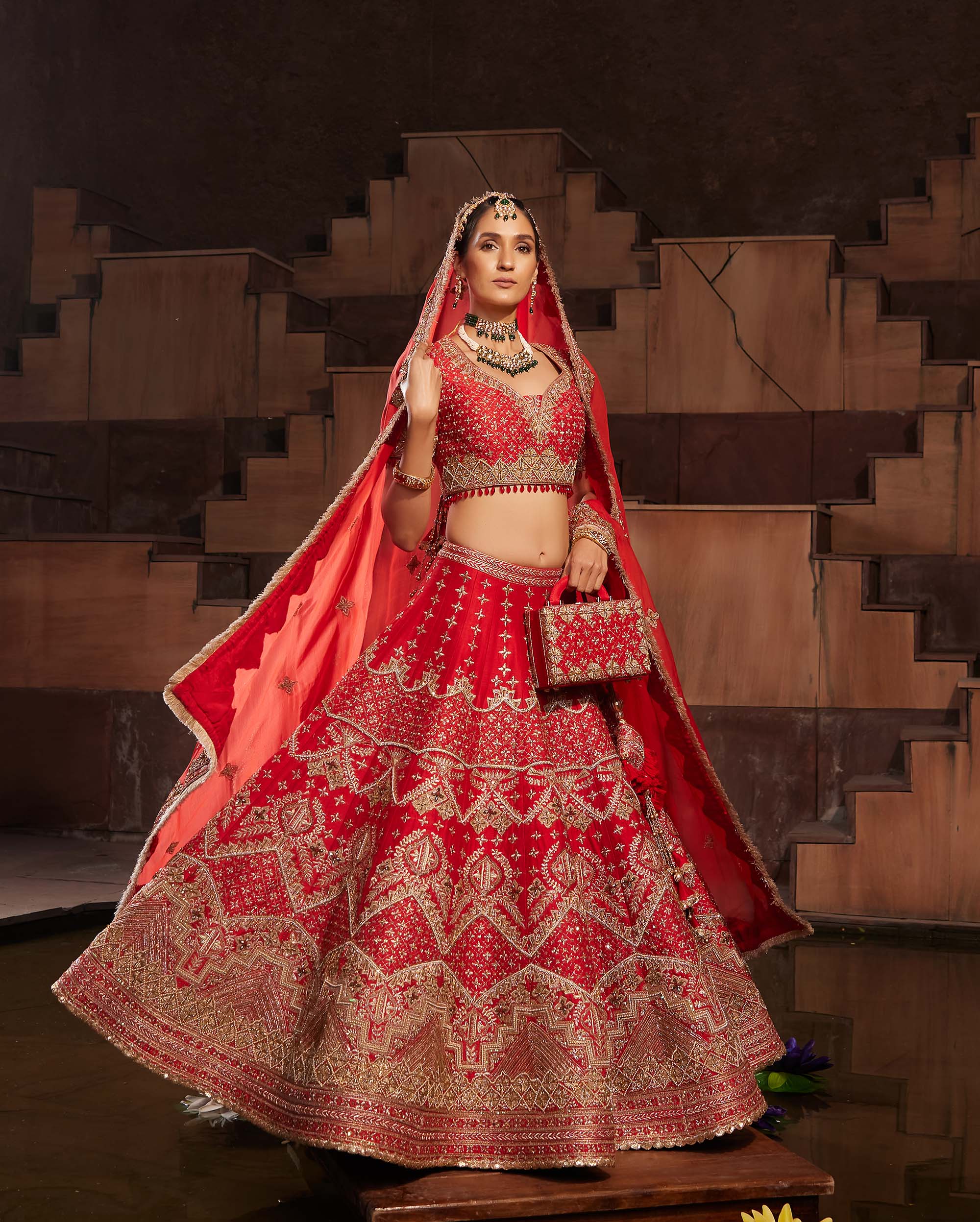 Art Deco Red Raw Silk Embroidered Designer Bridal Lehenga
