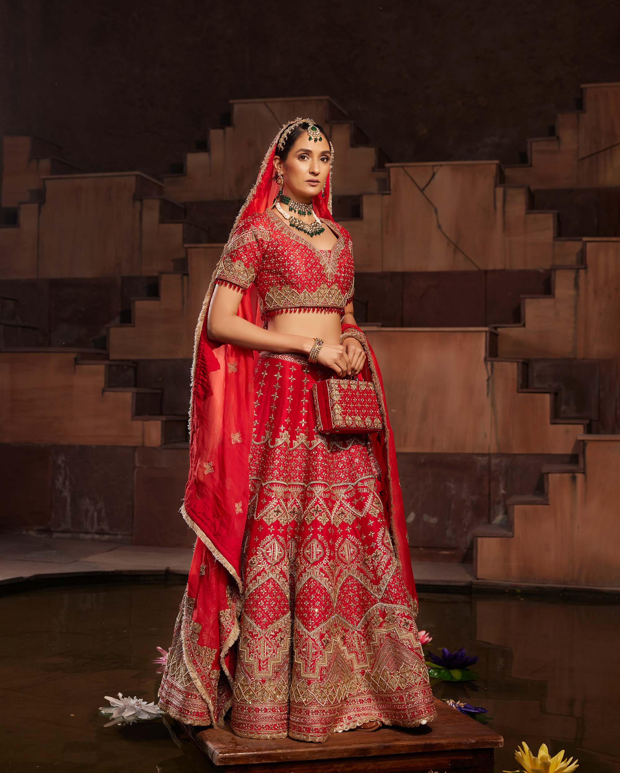 Featuring red raw silk hand embroidered bridal lehanga with matching blouse and dupatta set