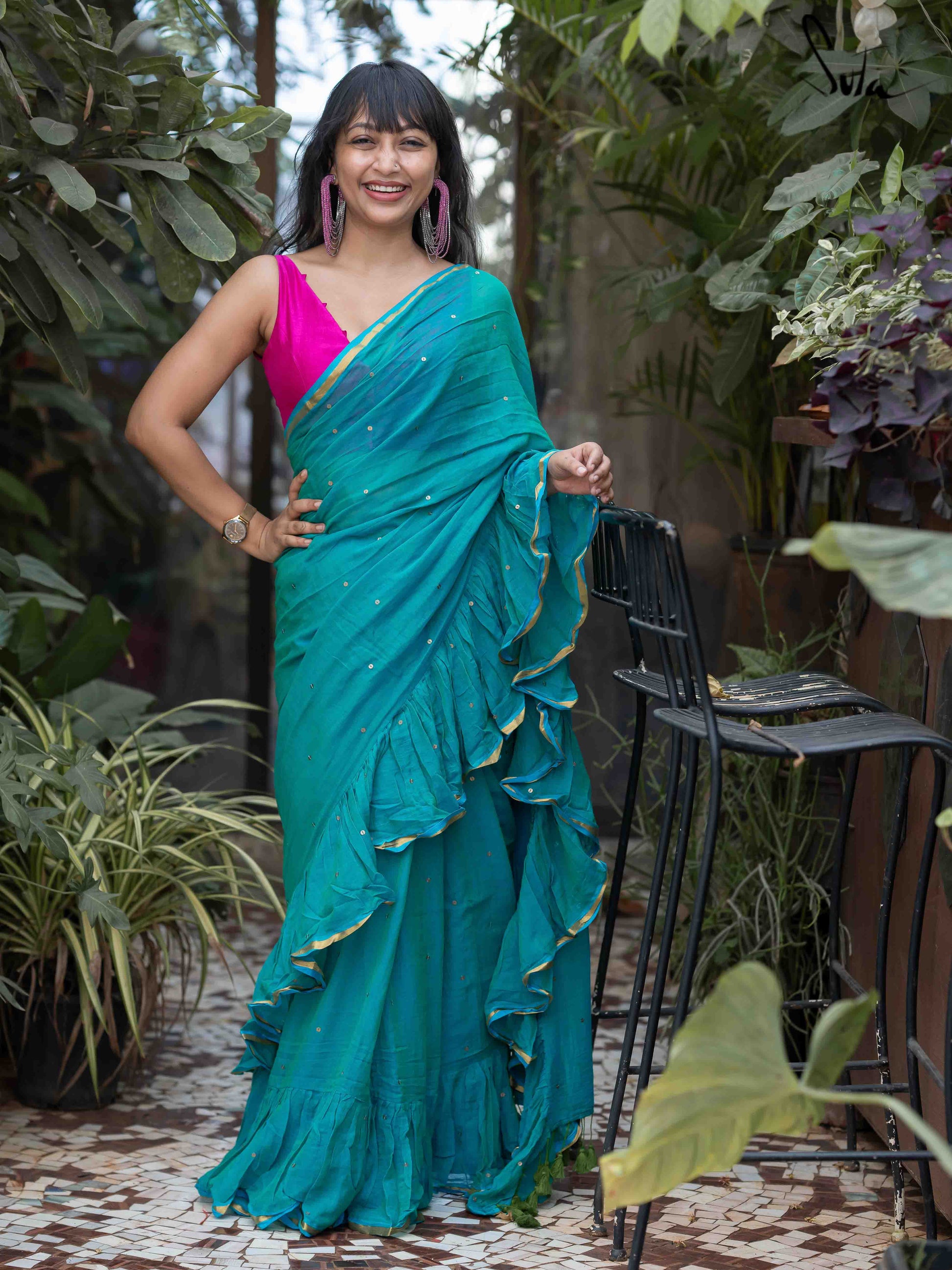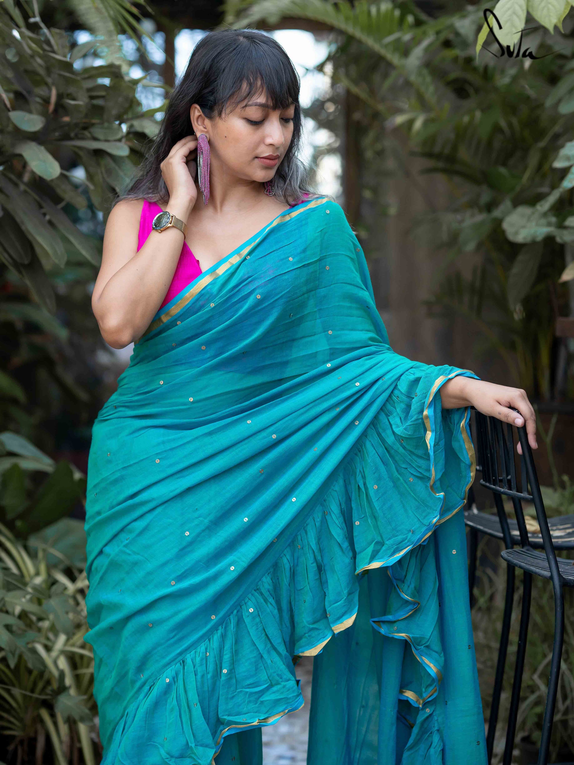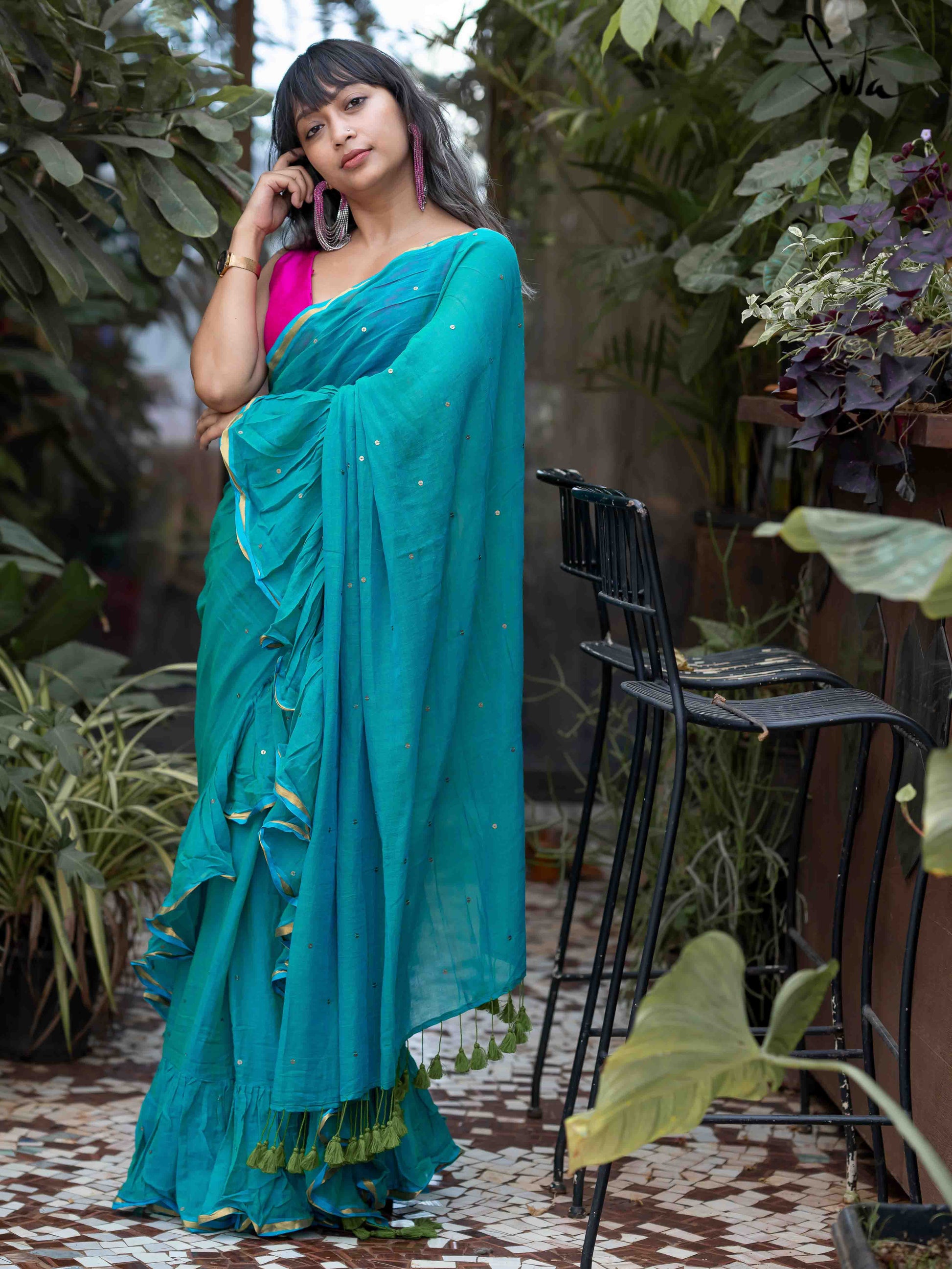 Pick this blue handwoven mul cotton saree with ruffles for big and small wins, and everything in between! Its sedate elegance comes alive in the ruffles, twinkling chumkis and that golden trim.