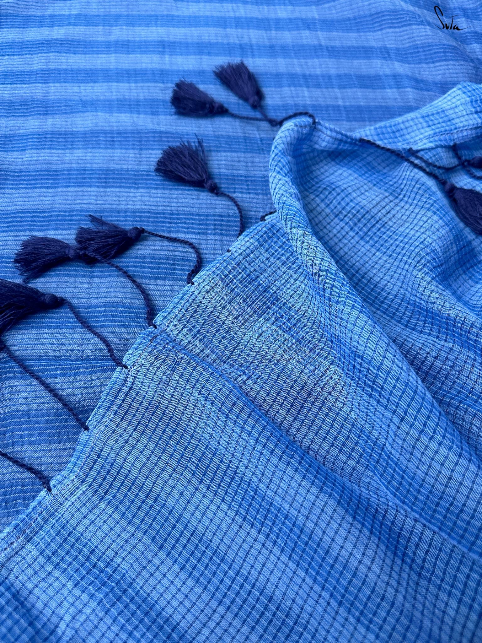 Soft as a summer whisper, this mul cotton saree features a captivating two-tone blue weave, like a twilight sky. Playful tassels in blue and brights add a touch of vivacity.