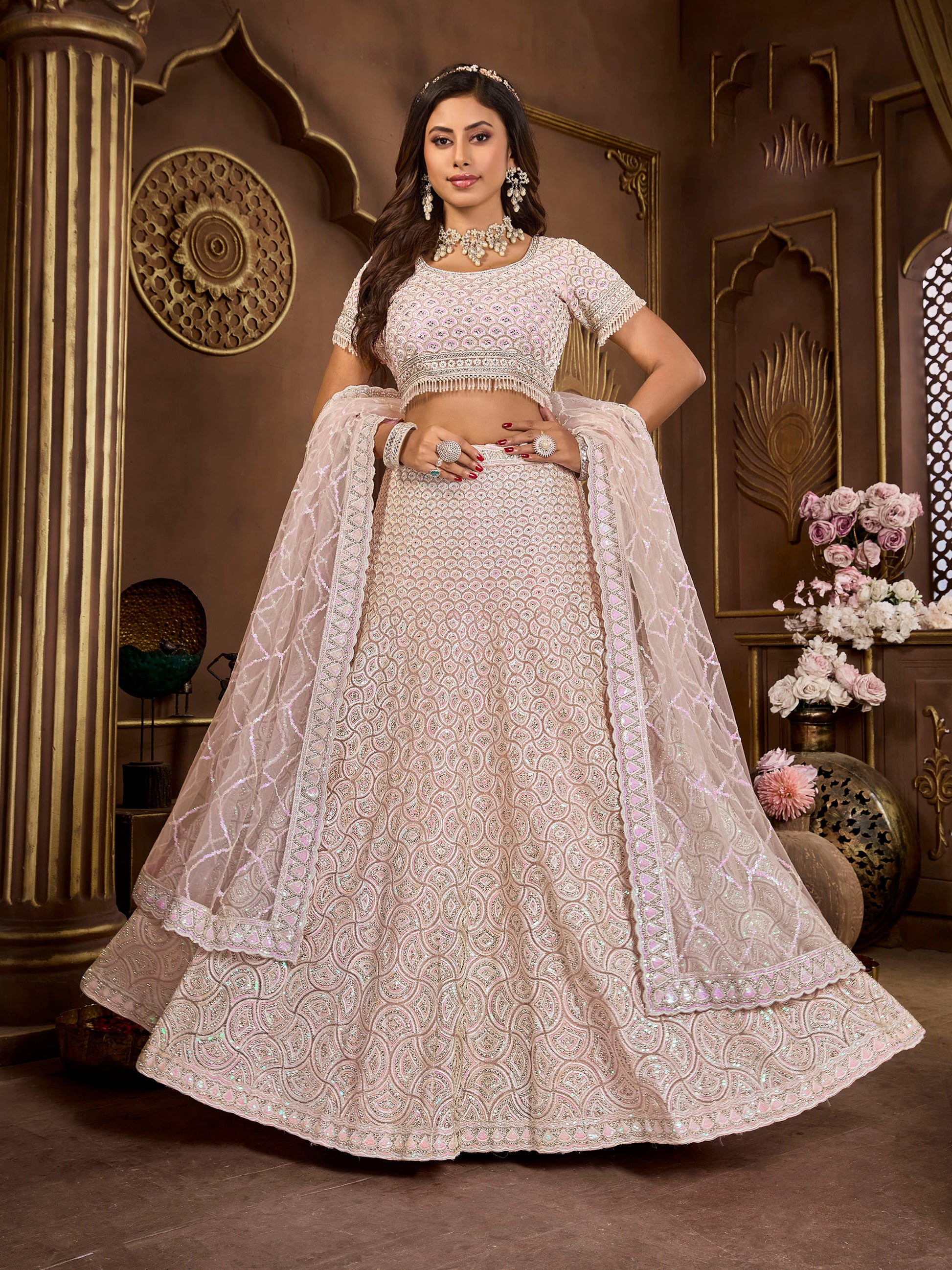 Baby Pink Heavy Zarkan Embroidery Net Wedding Guest Lehenga