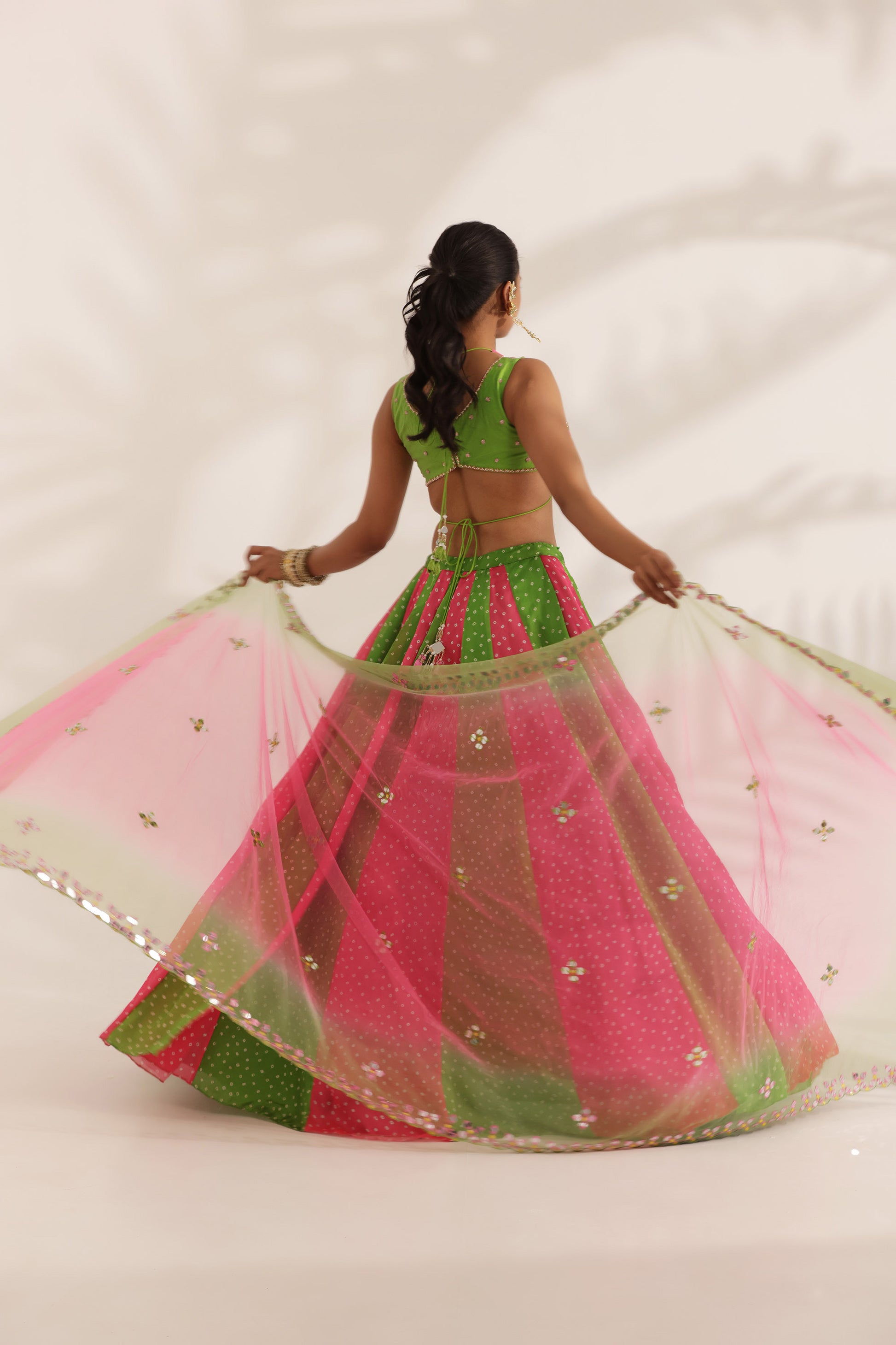 Bandhani Satin Georgette kali lehenga in two shades. Paired with hand embroidered blouse on net base. Two shade dupatta on net fabric with mirror work