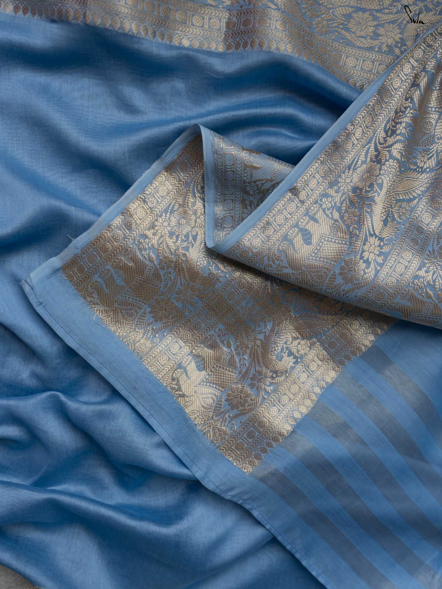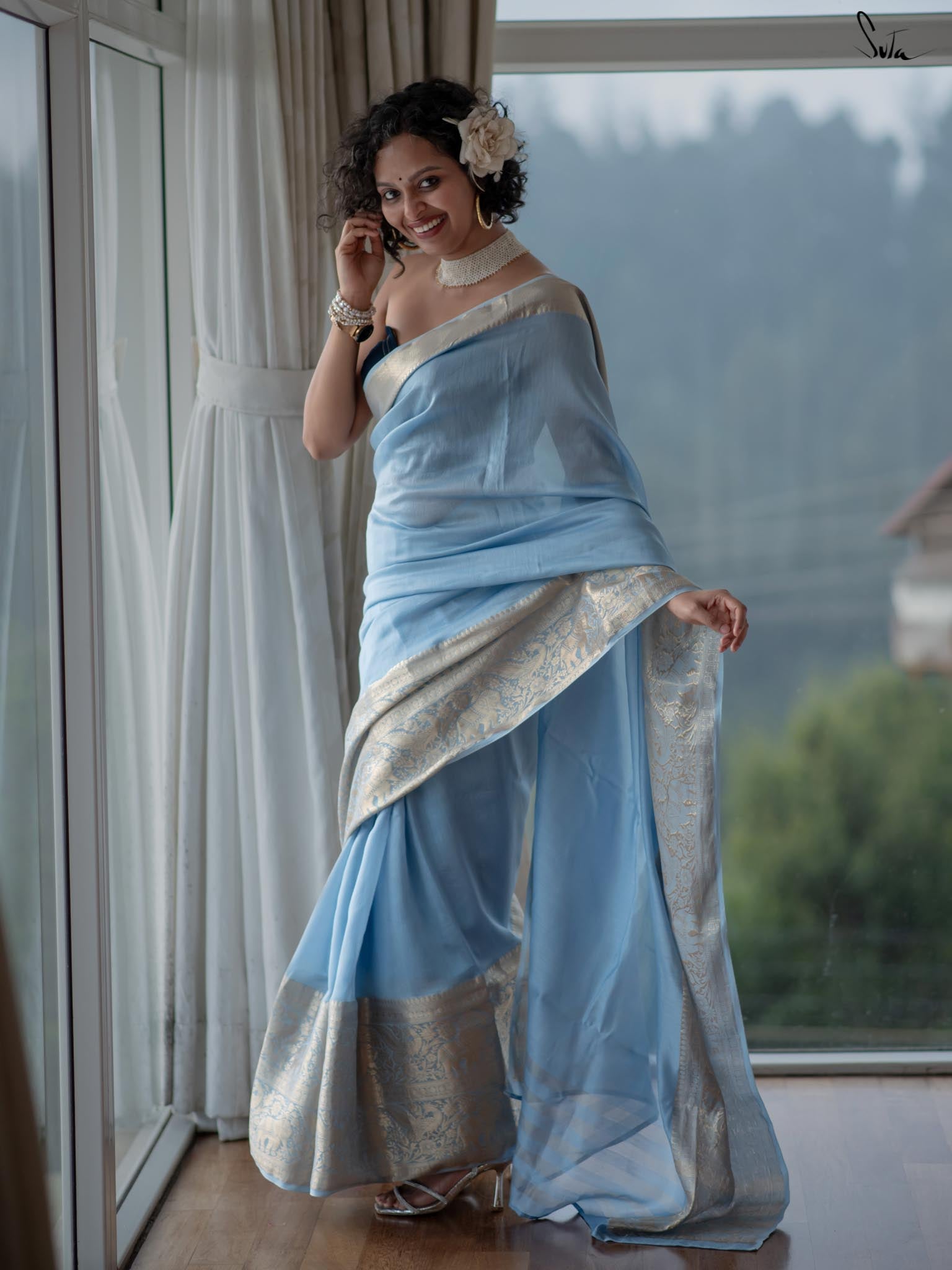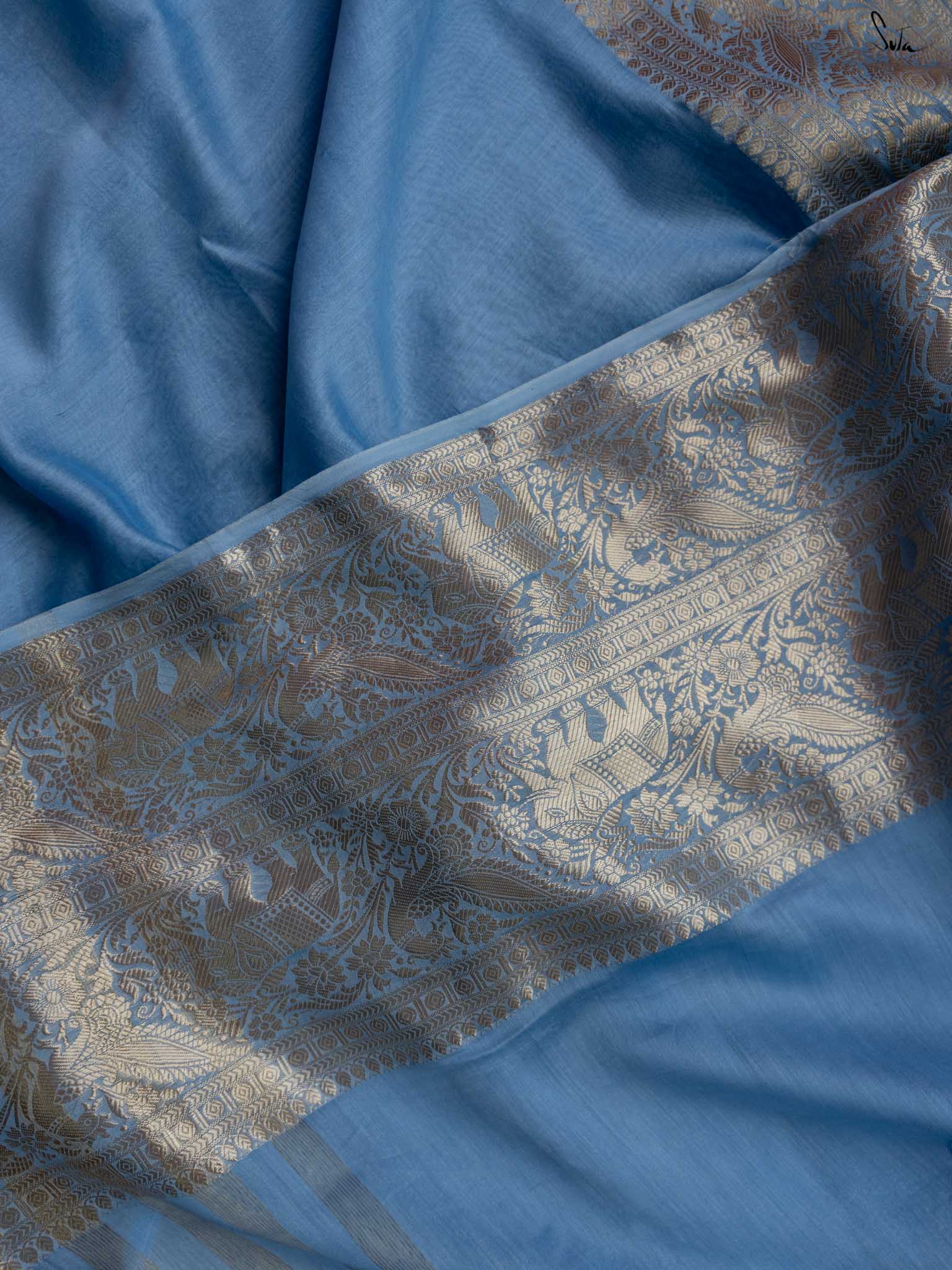 Inspired by the serenity of the chilly, snow-covered winter evenings, the 'Barfeeli Sham' saree consists of a unique powder blue base. Crafted from soft cotton polyester fabric, this saree features animal motifs all over, and brings special vibes to your wedding fashion!