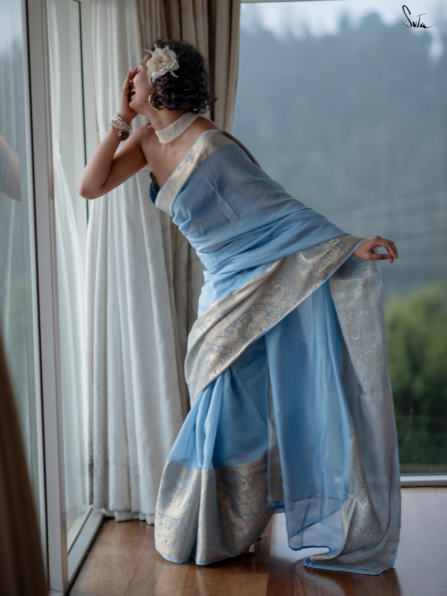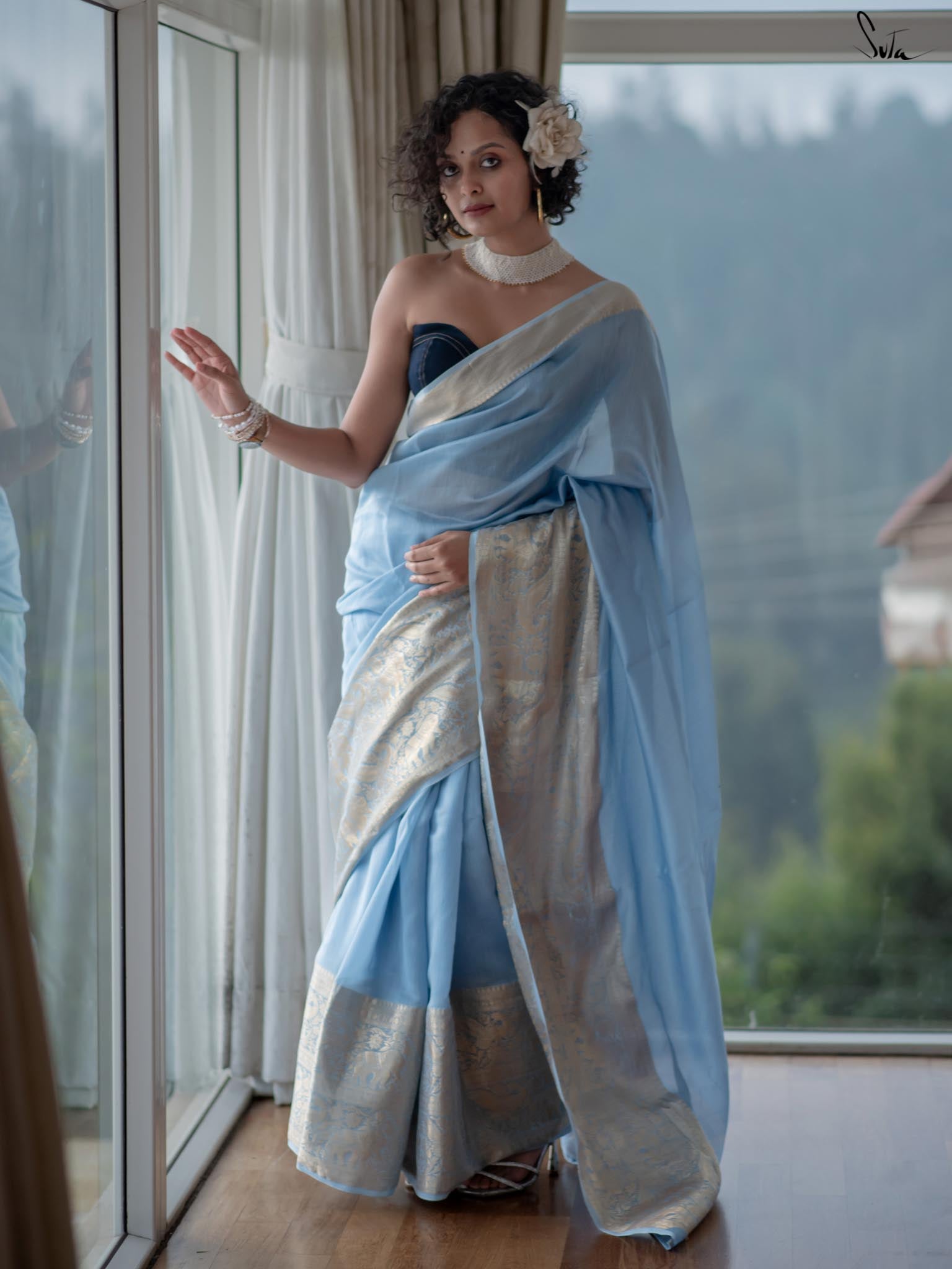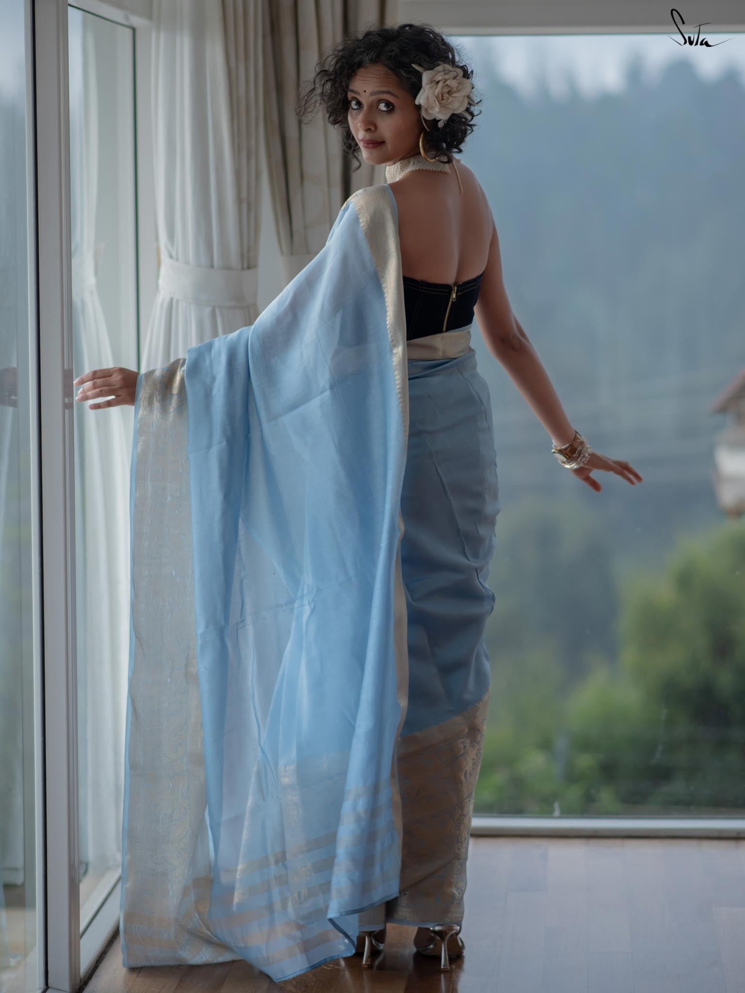 Inspired by the serenity of the chilly, snow-covered winter evenings, the 'Barfeeli Sham' saree consists of a unique powder blue base. Crafted from soft cotton polyester fabric, this saree features animal motifs all over, and brings special vibes to your wedding fashion!