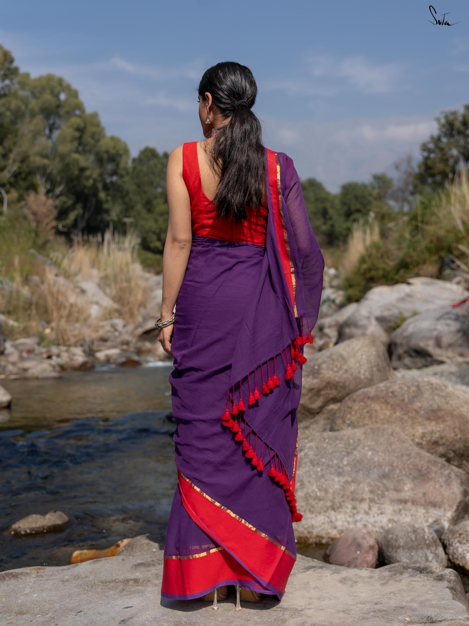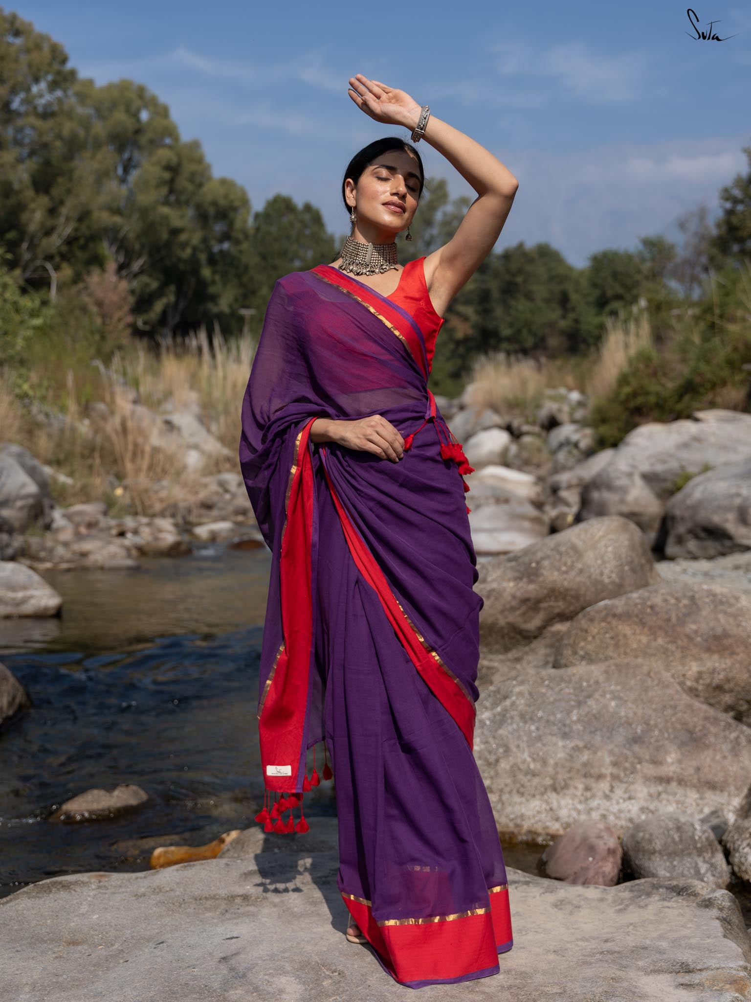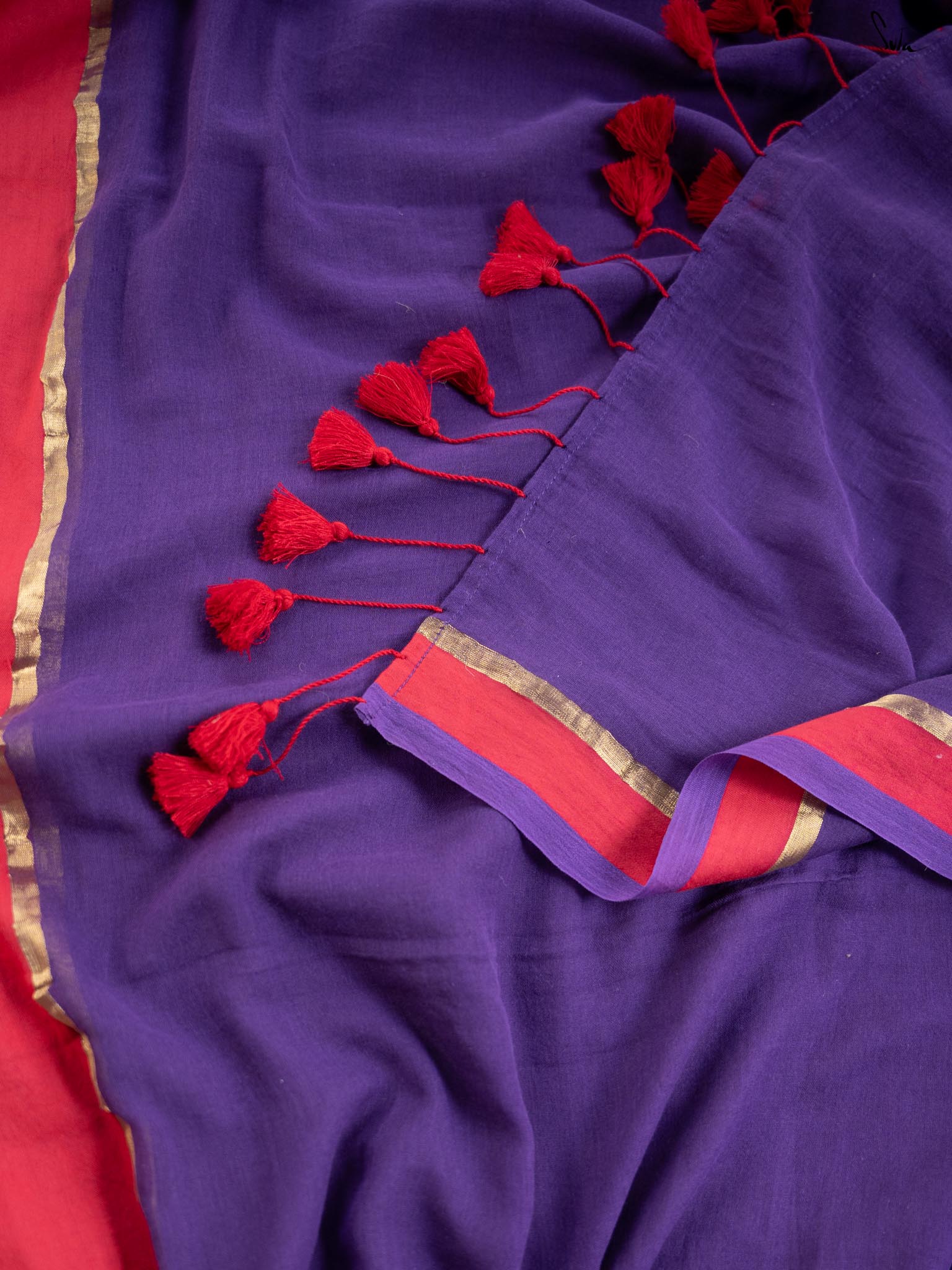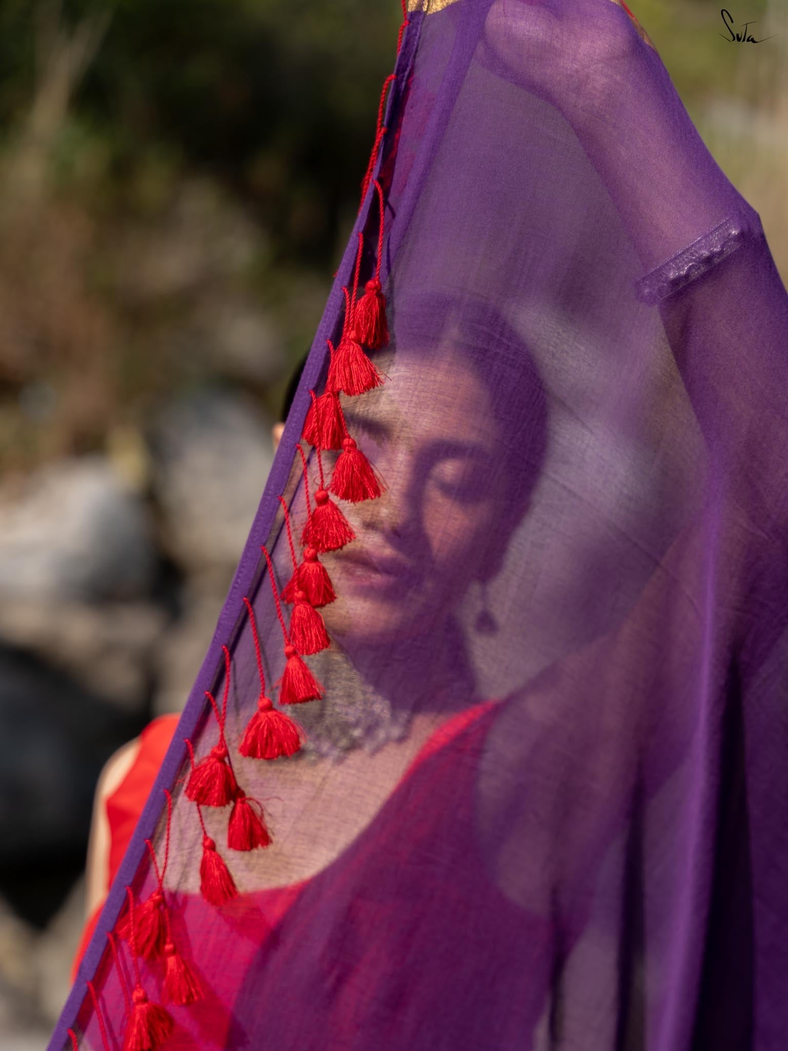 The name Beguni means 'Purple'. Staying true to its name, the saree captures the vibrance and warmth of the color purple. The softness of the flowing mul, that glorious feeling when the playful red tassels on the pallu caress the wearer's skin, everything about the ensemble speaks serenity! Artisanal brilliance and love is poured into every stitch and the beauty wraps you with unmatched charm!