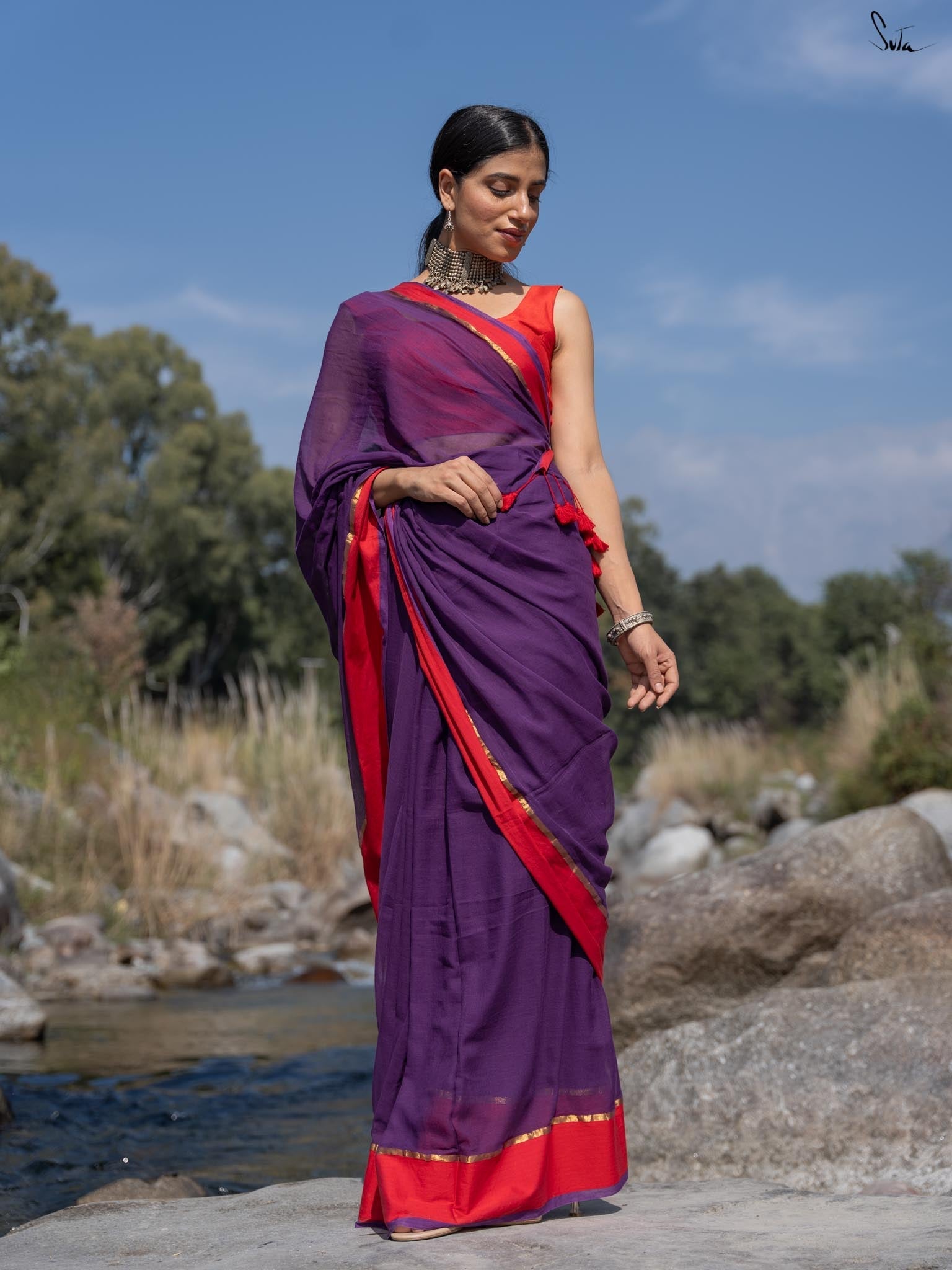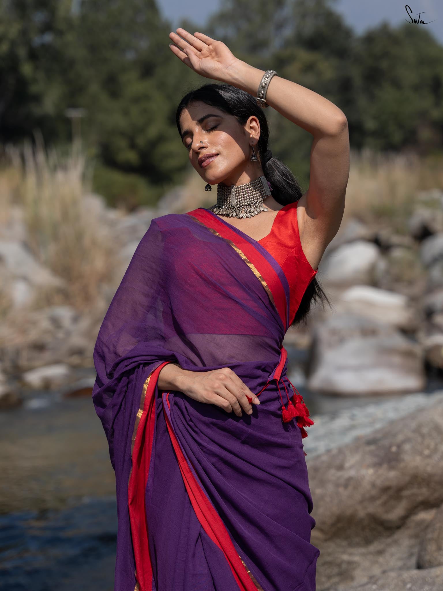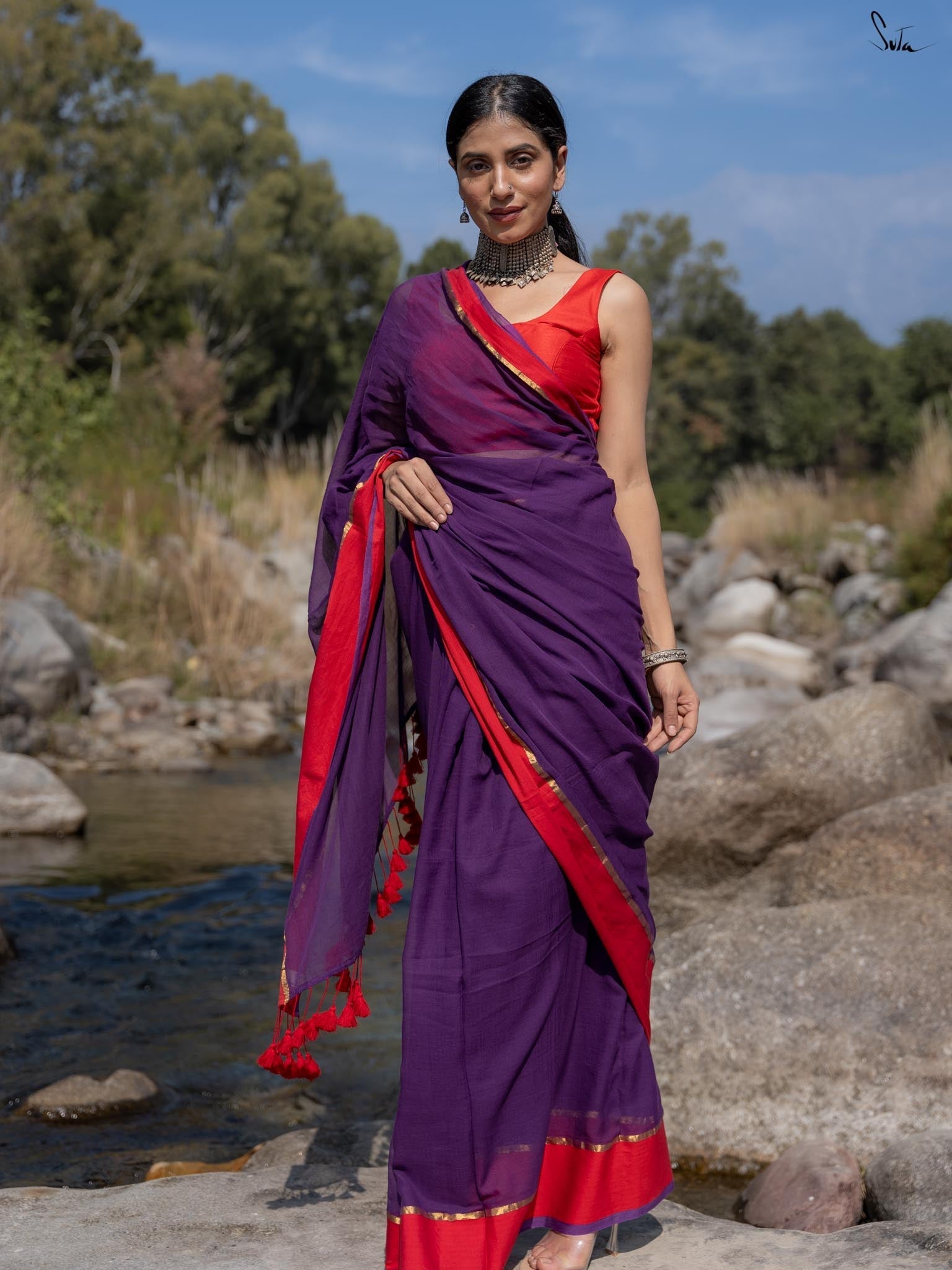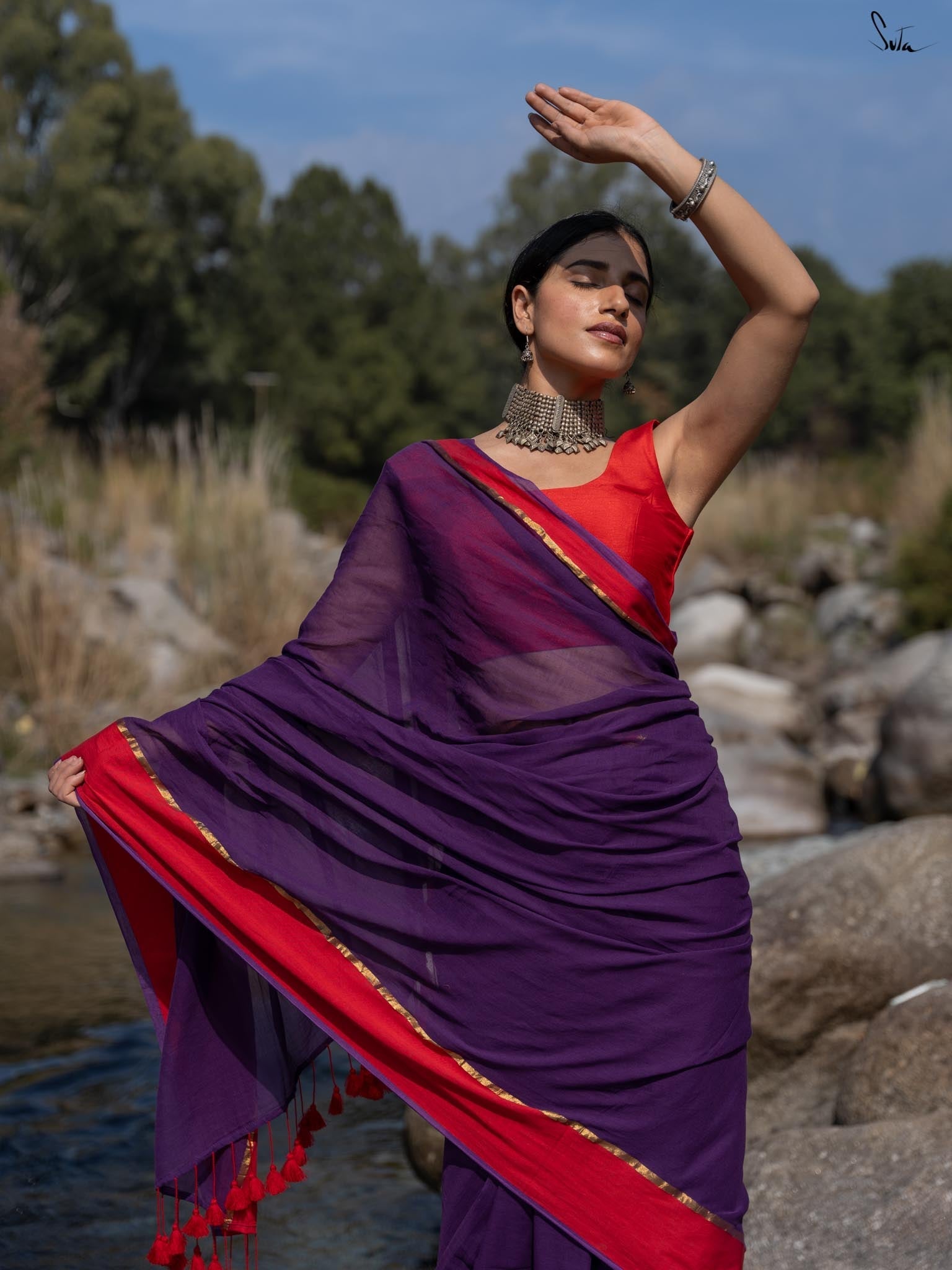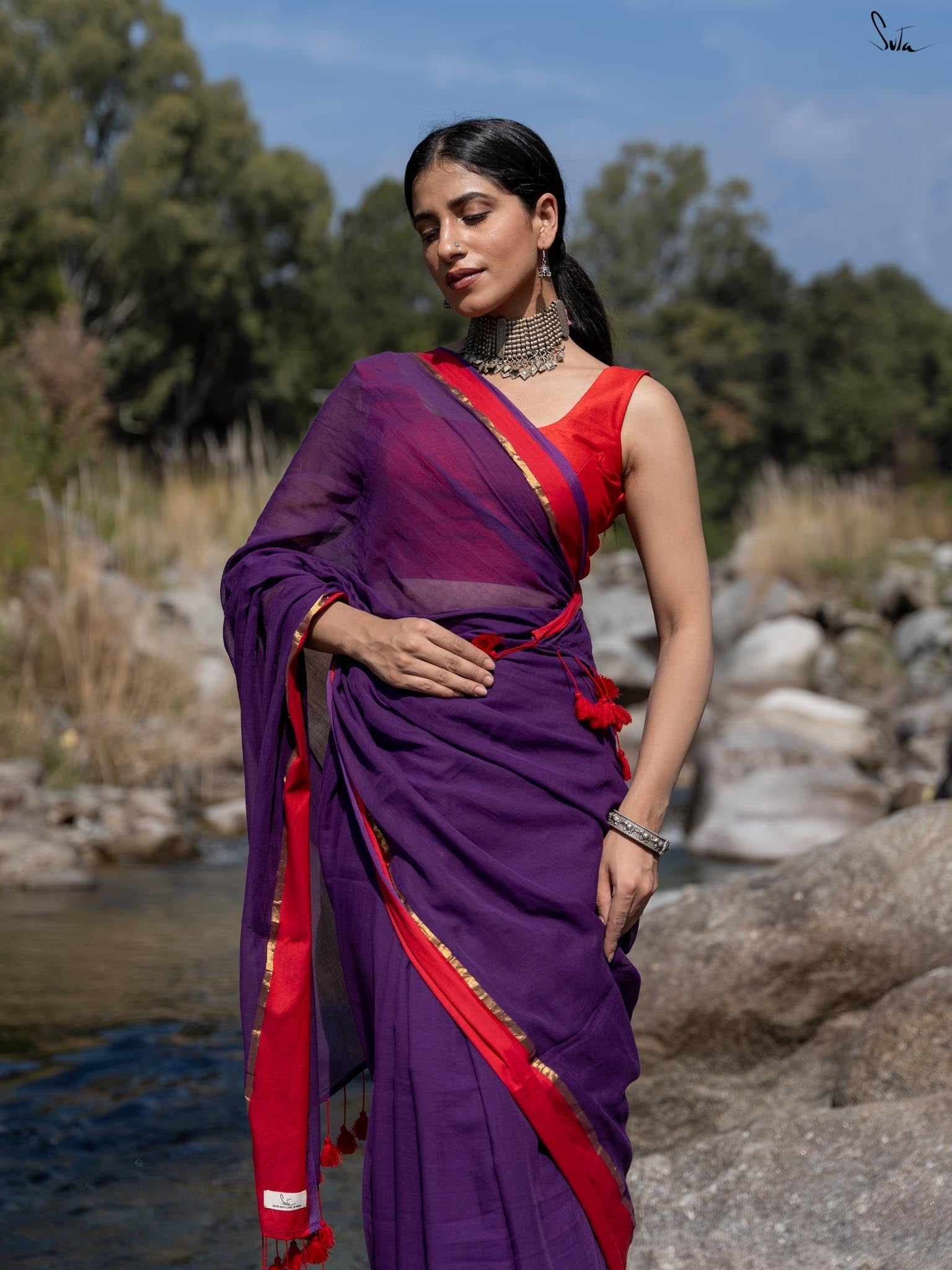 The name Beguni means 'Purple'. Staying true to its name, the saree captures the vibrance and warmth of the color purple. The softness of the flowing mul, that glorious feeling when the playful red tassels on the pallu caress the wearer's skin, everything about the ensemble speaks serenity! Artisanal brilliance and love is poured into every stitch and the beauty wraps you with unmatched charm!