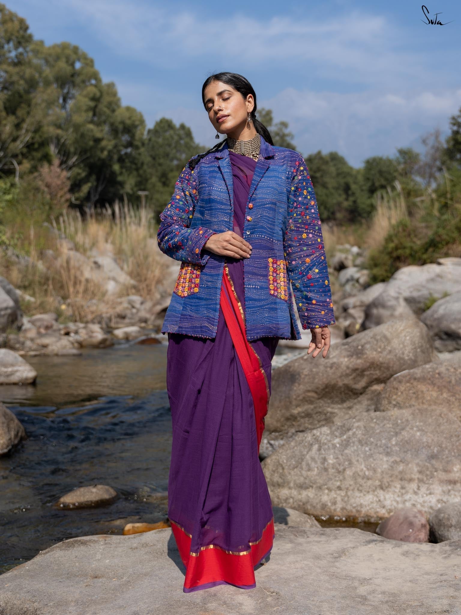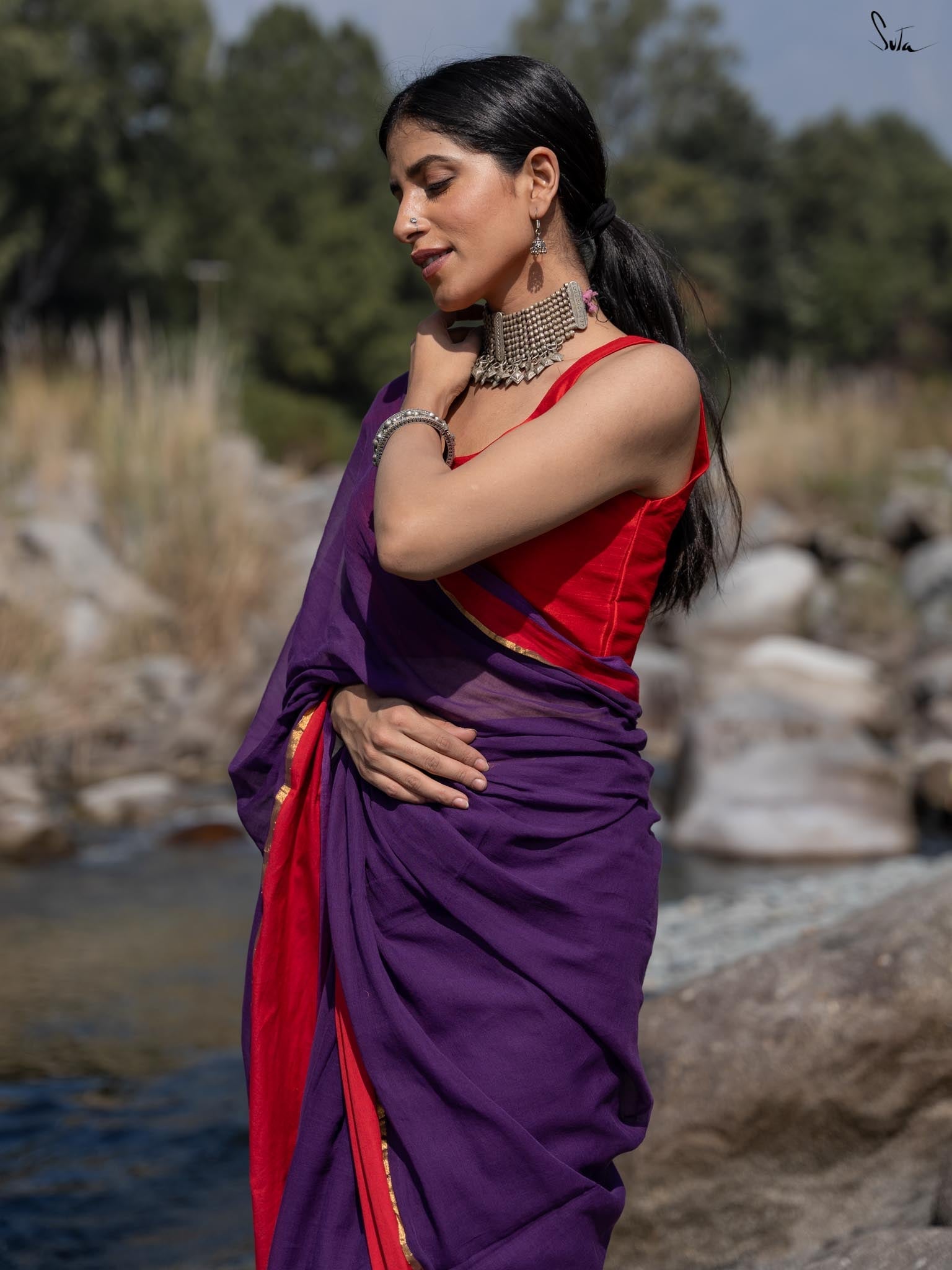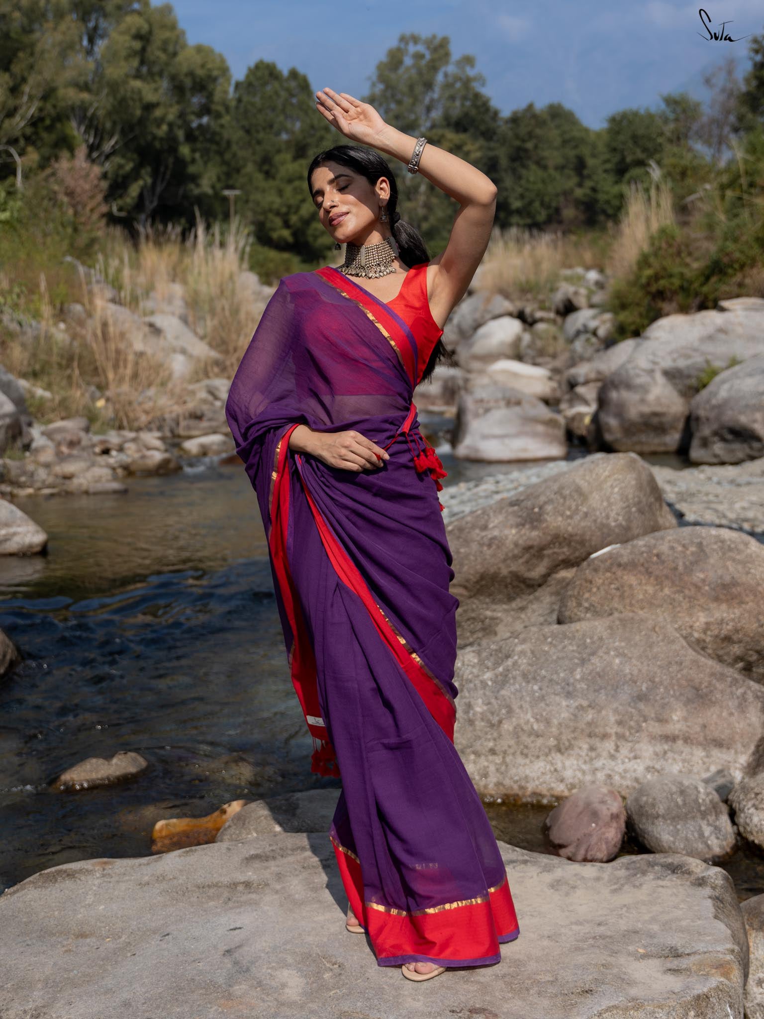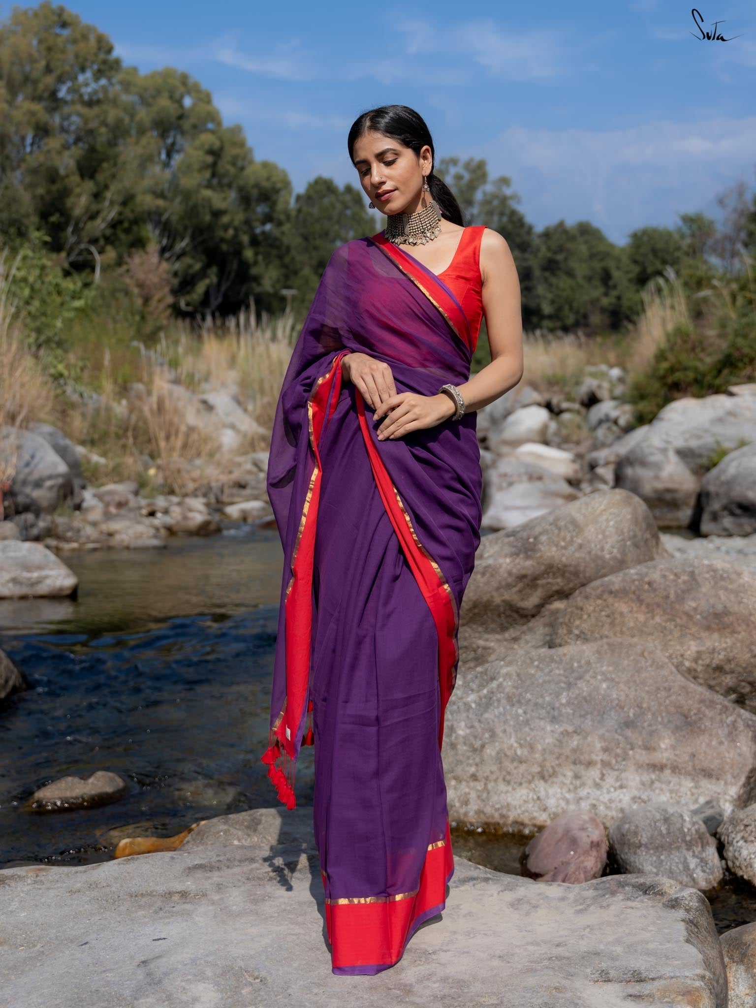The name Beguni means 'Purple'. Staying true to its name, the saree captures the vibrance and warmth of the color purple. The softness of the flowing mul, that glorious feeling when the playful red tassels on the pallu caress the wearer's skin, everything about the ensemble speaks serenity! Artisanal brilliance and love is poured into every stitch and the beauty wraps you with unmatched charm!