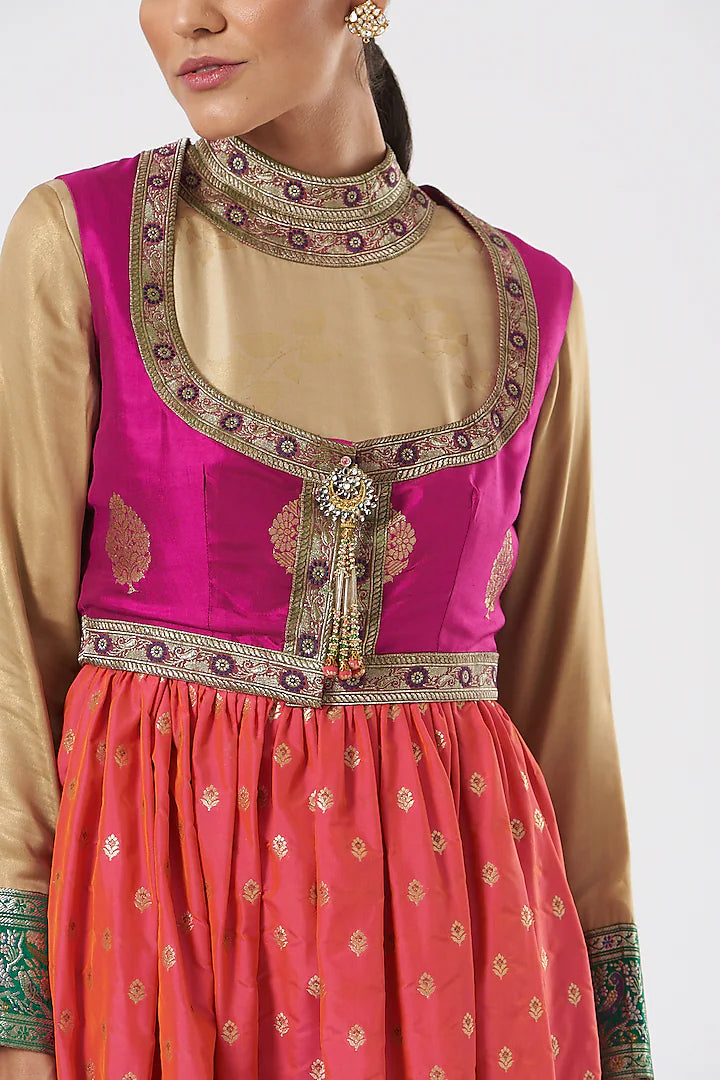 Beige and Fuschia pink Pure Banarasi silk Limited Edition Designer Anarkali Set