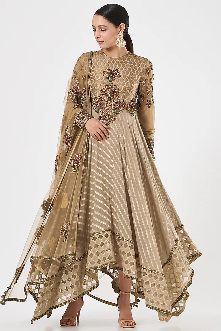 Featuring a beige anarkali in pure chanderi silk base with gold lines and zardosi embroidery. It is paired with matching pants and an embroidered french net dupatta.