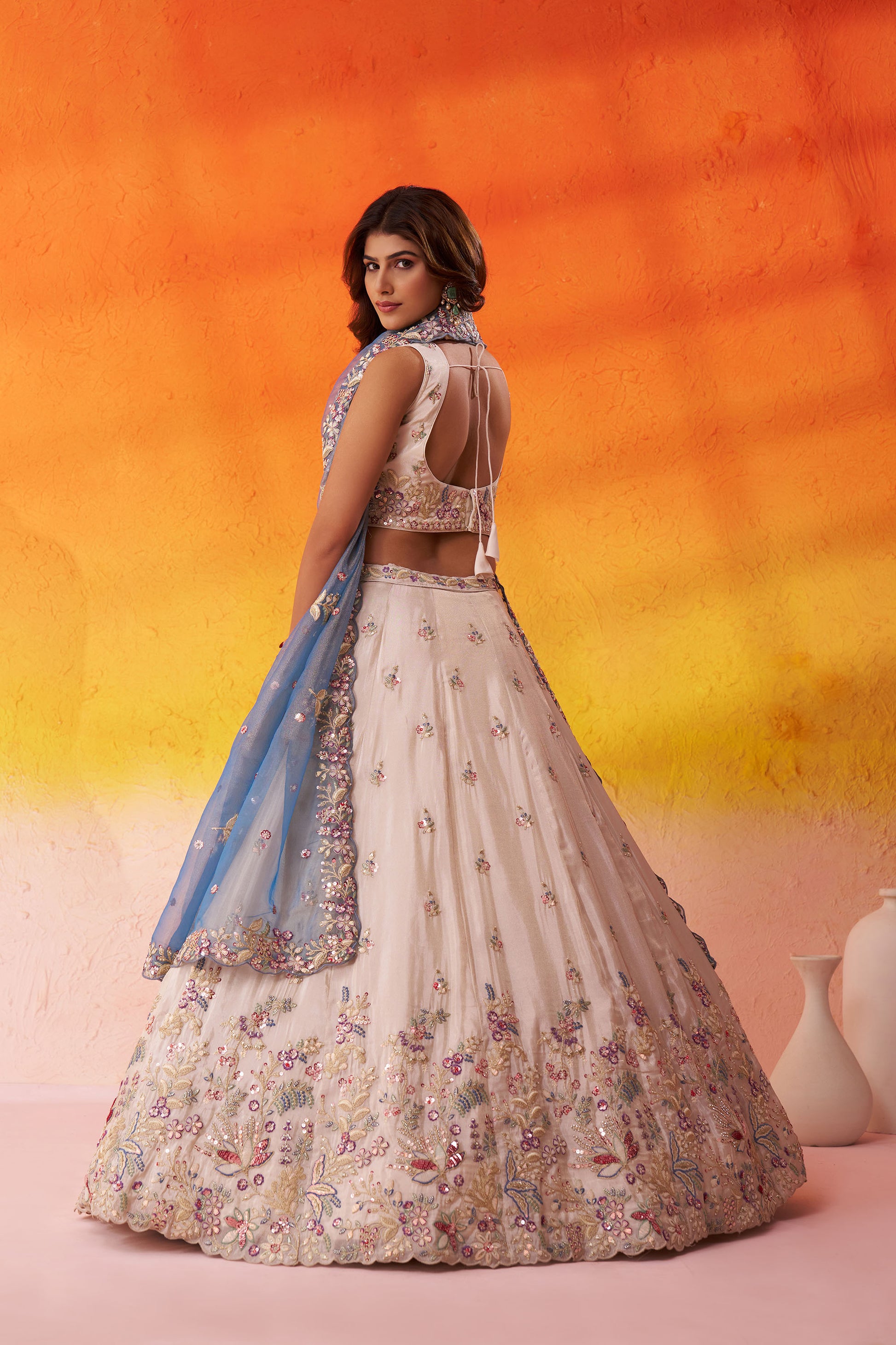 • Lehenga:- Made of premium quality Beige Tissue fabric Full Flair Semi-Stitched Lehenga With Moti, Sequinse and Coding work has a thread Embroidery work. Has a thread work border on the hemline.