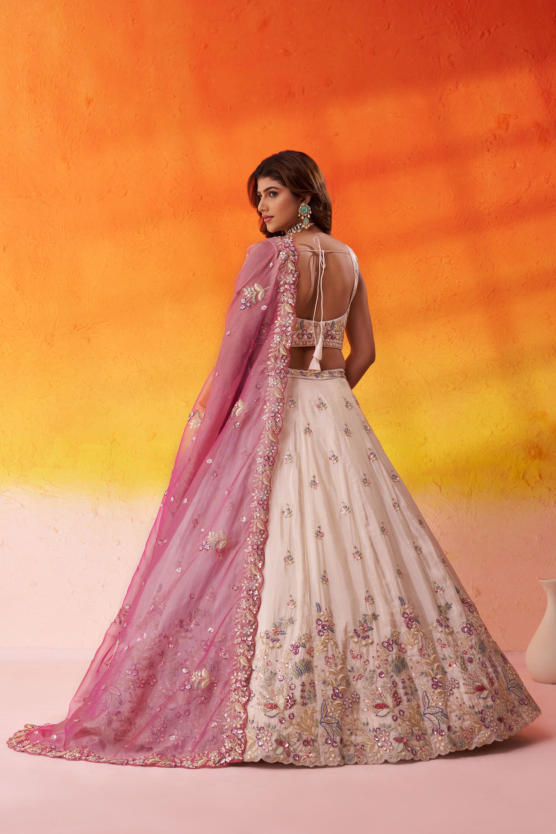 • Lehenga:- Made of premium quality Beige Tissue fabric Full Flair Semi-Stitched Lehenga With Moti, Sequinse and Coding work has a thread Embroidery work. Has a thread work border on the hemline.
