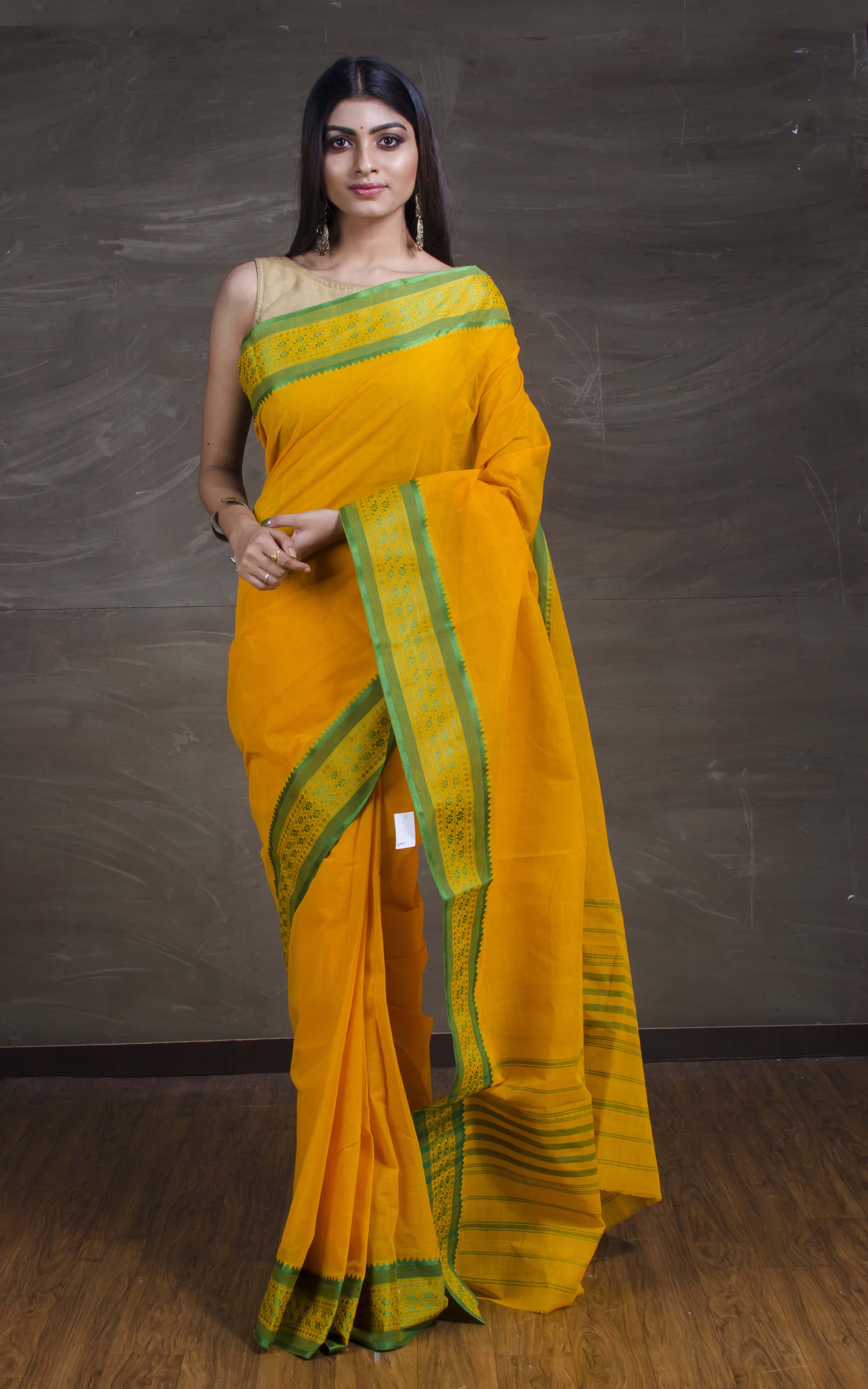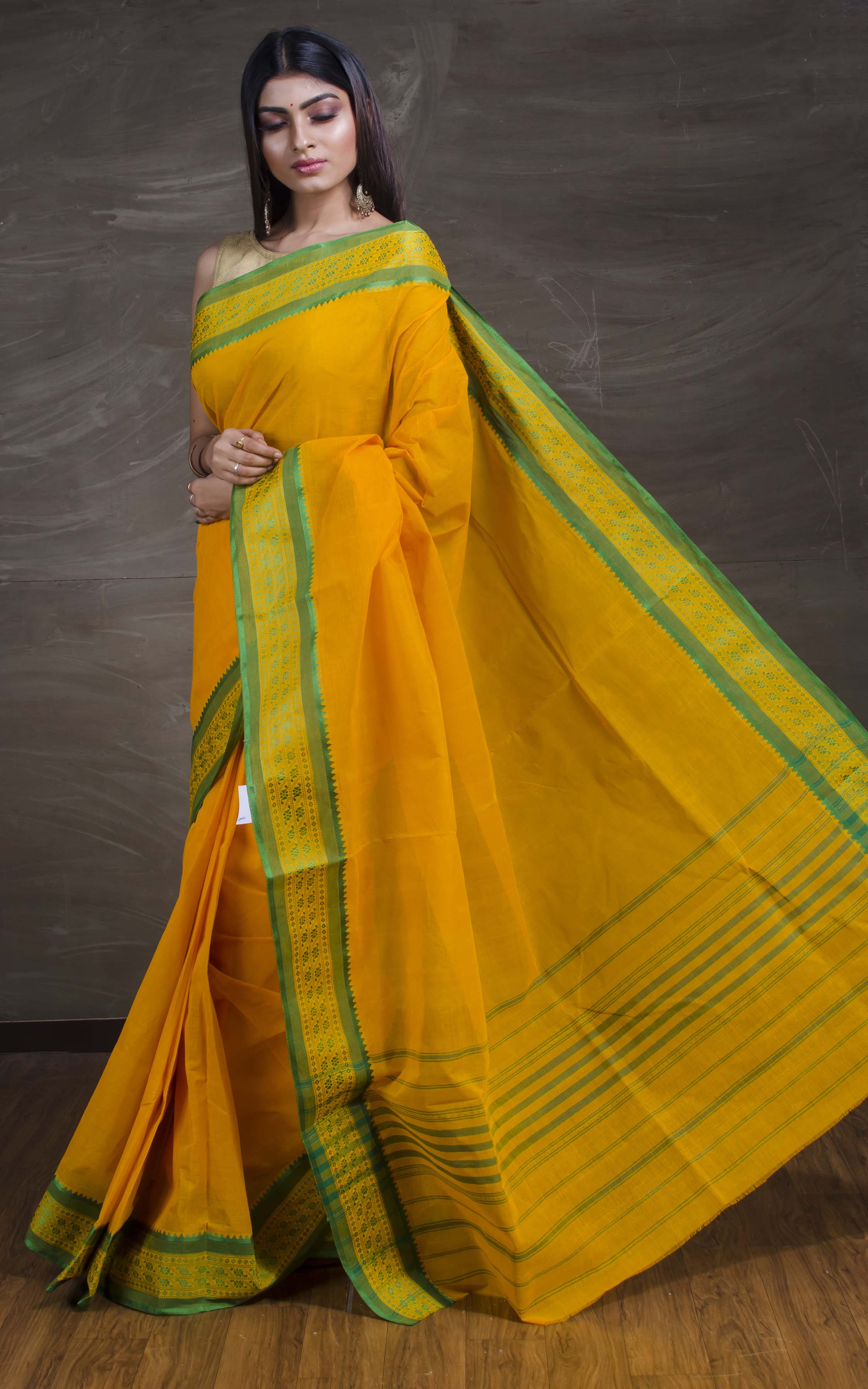 Bengal Handloom Begampuri Cotton Saree in Cyber Yellow and Natural Green