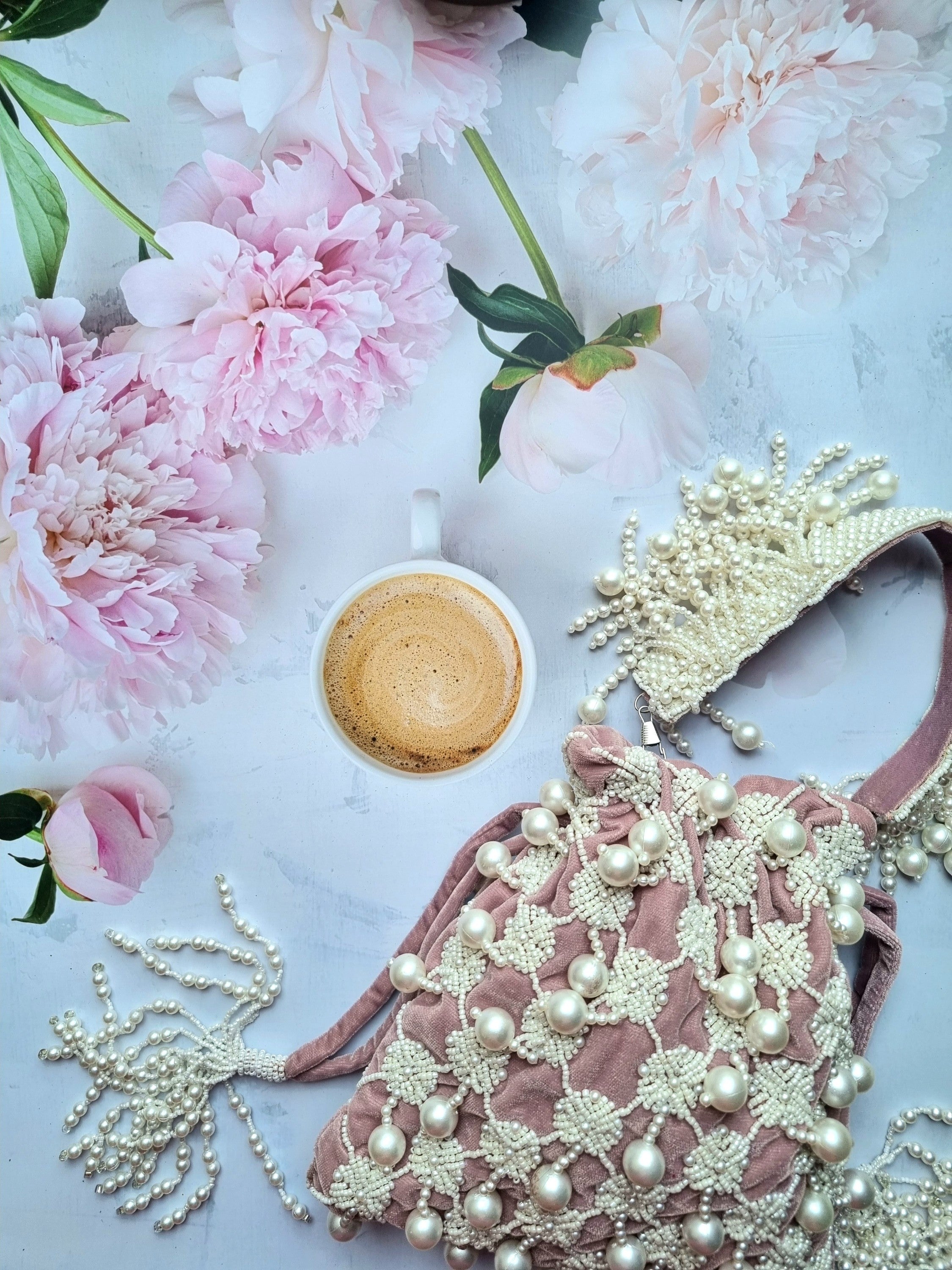 Potli with Pearl handwork and Tassels on both sides. The Potli comes with a Hand embroidered handle