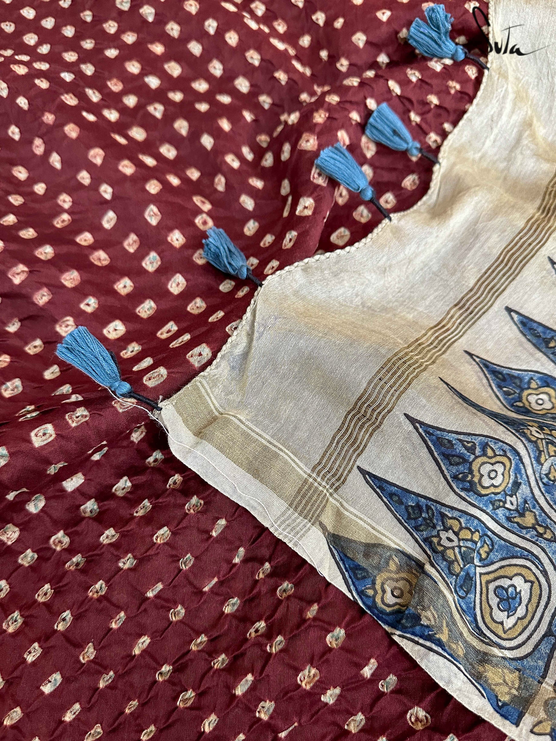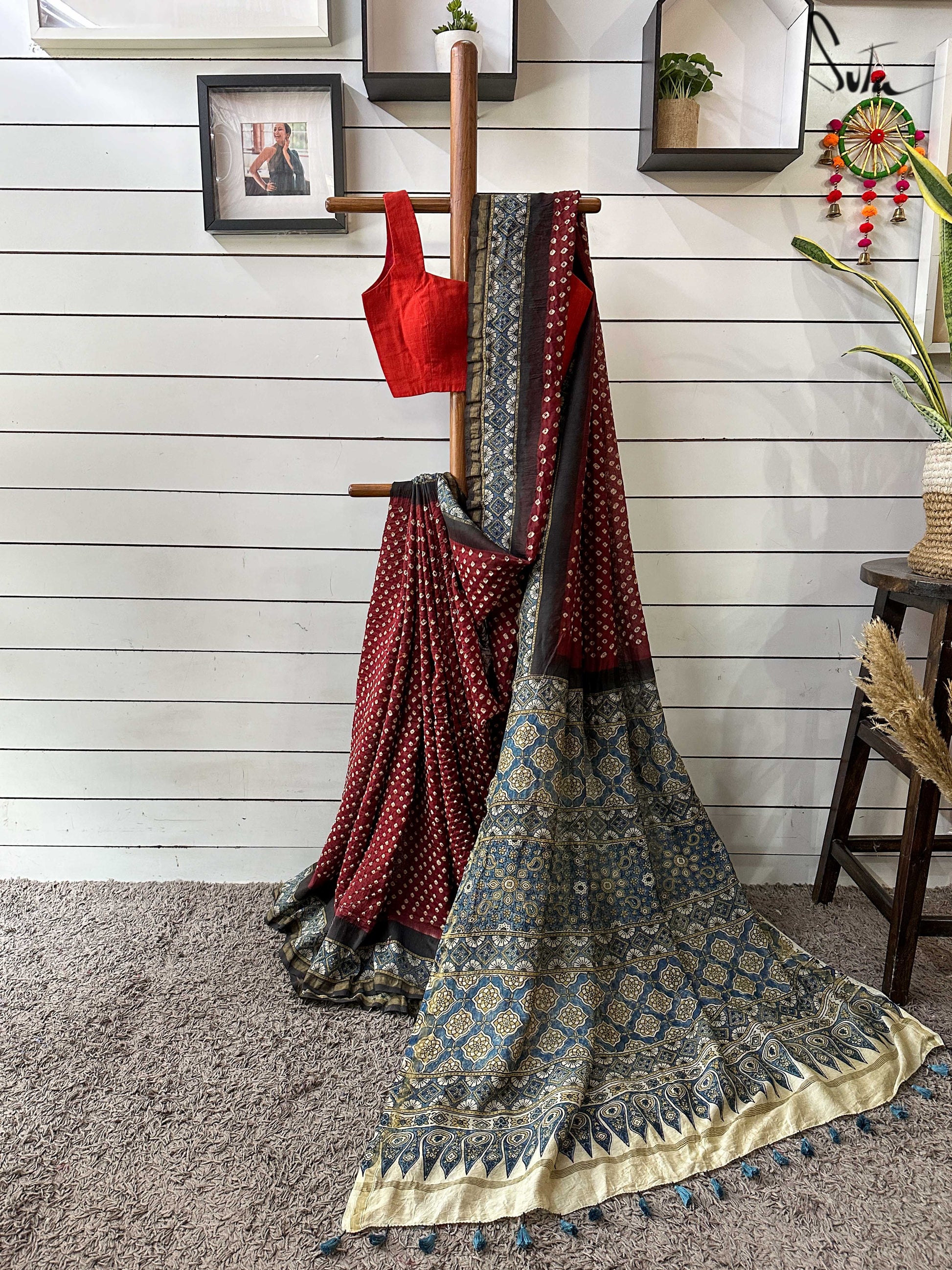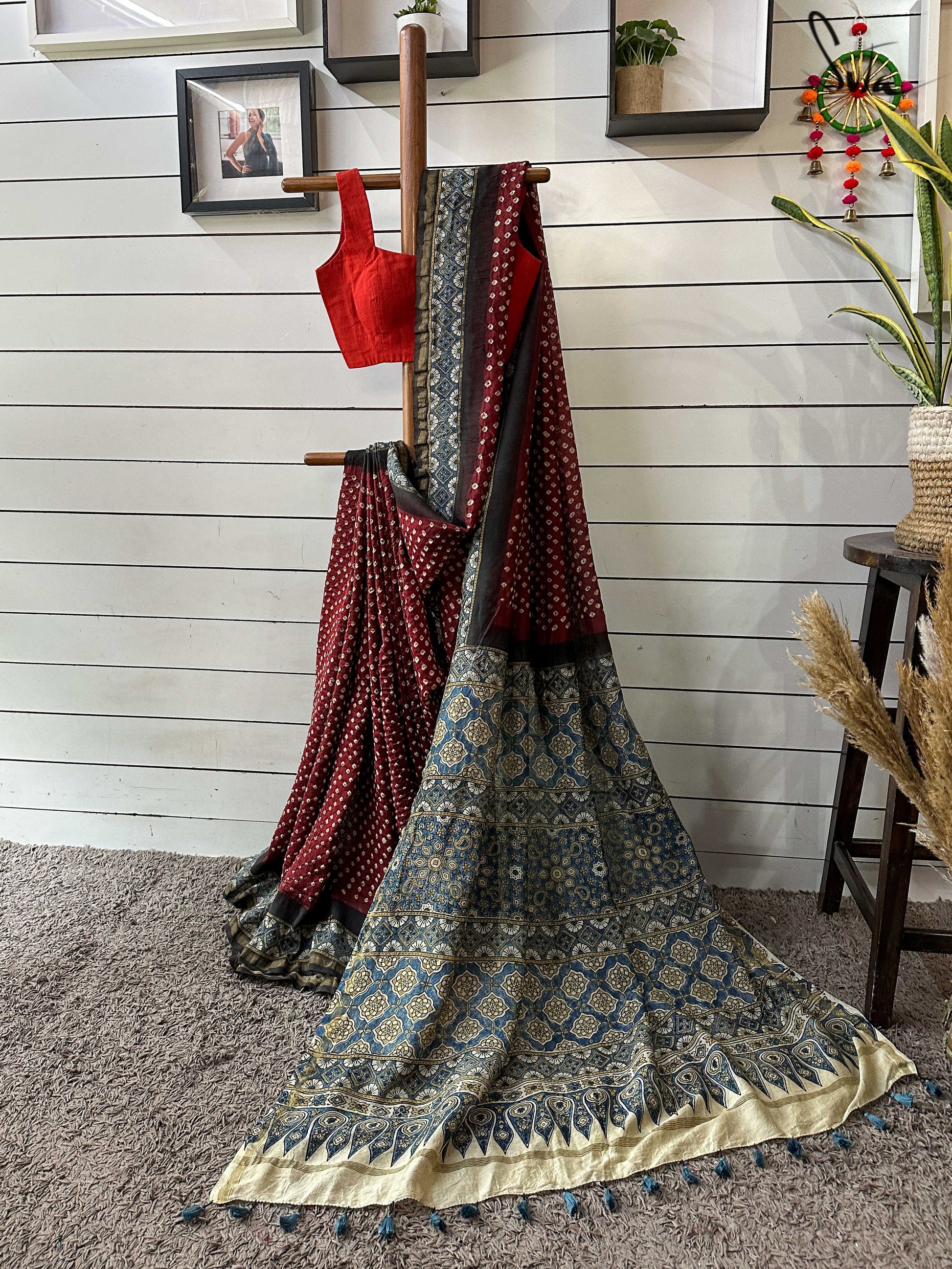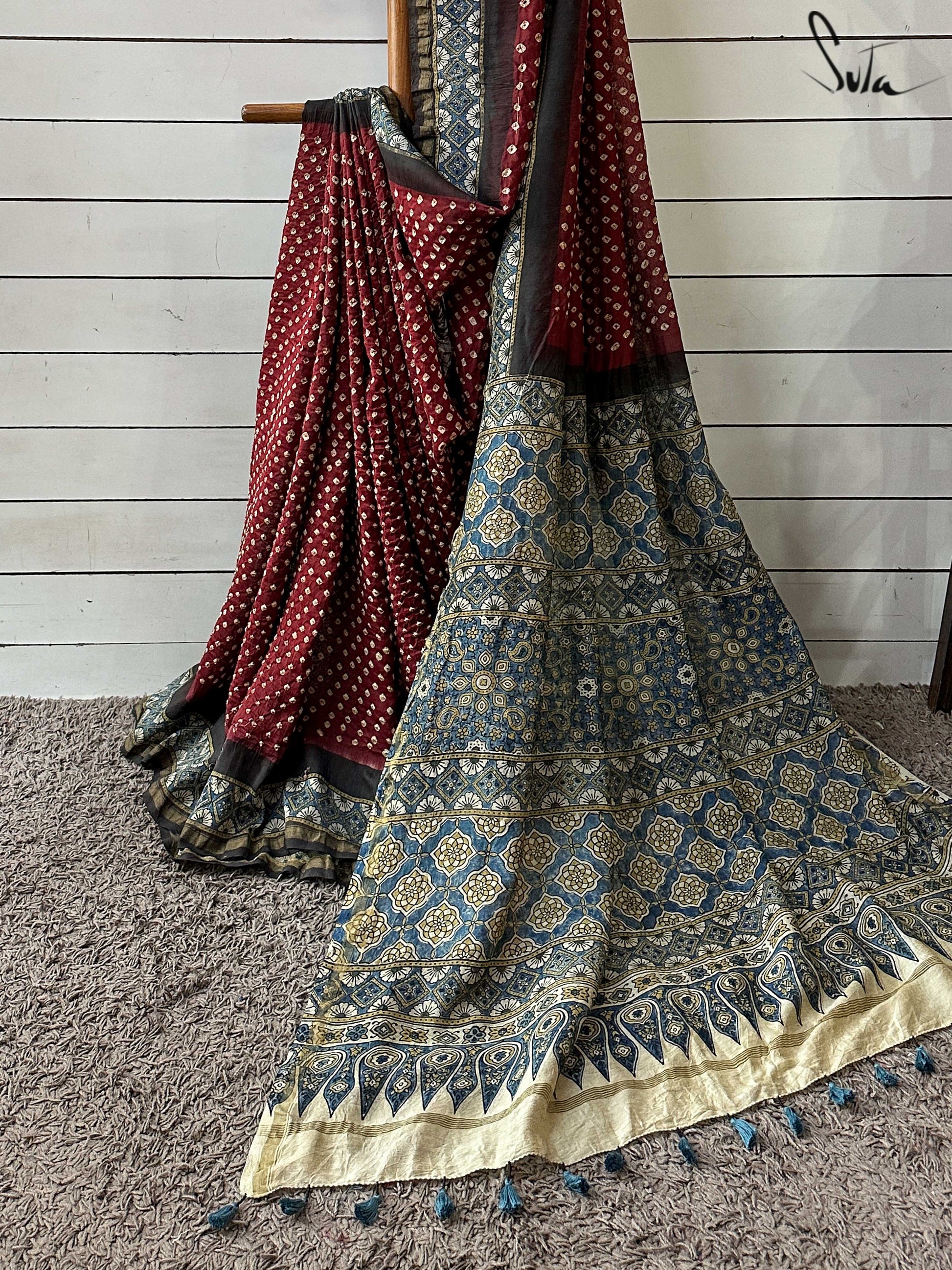 Pallu, border and blouse piece is ajrakh
