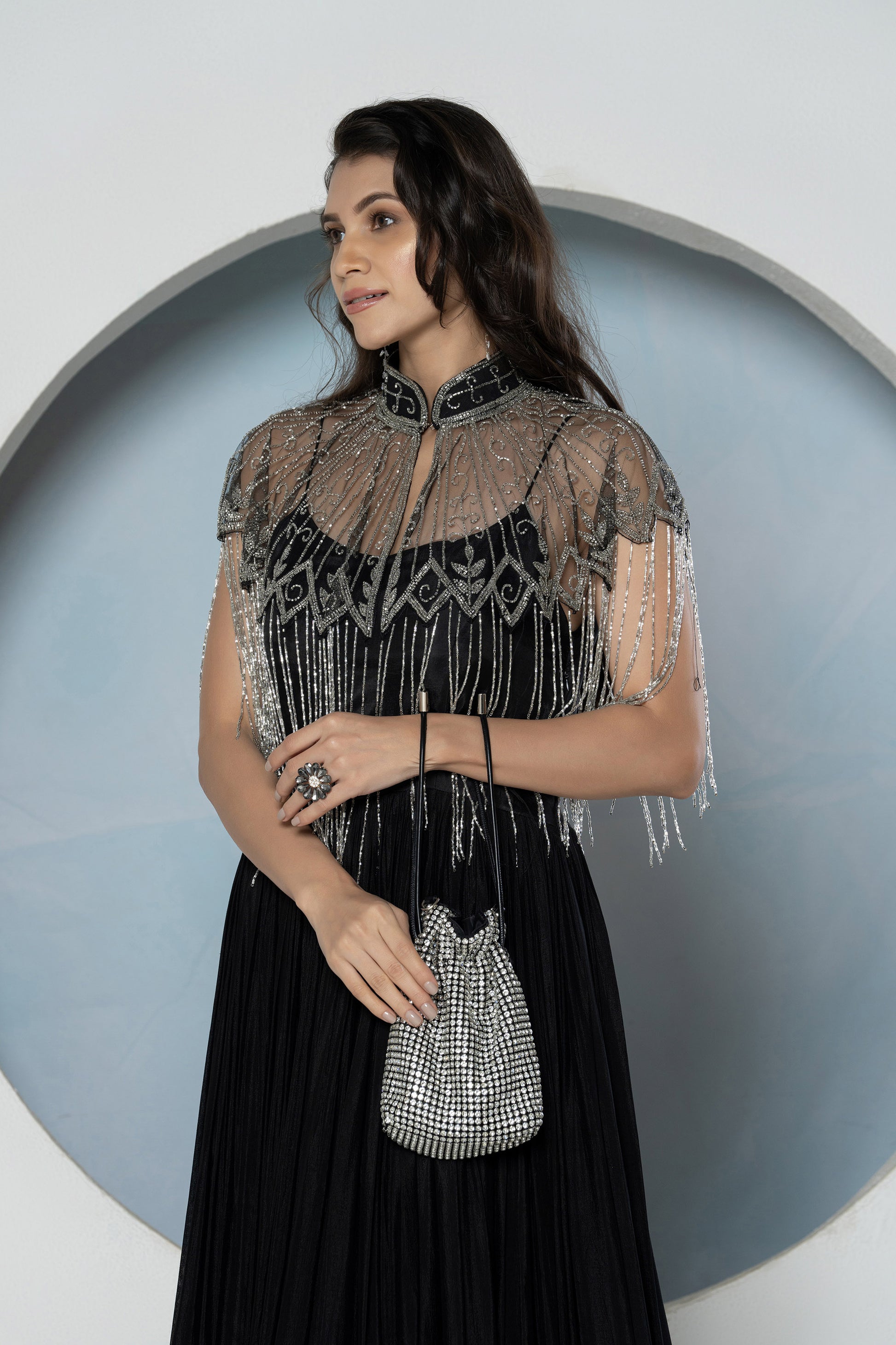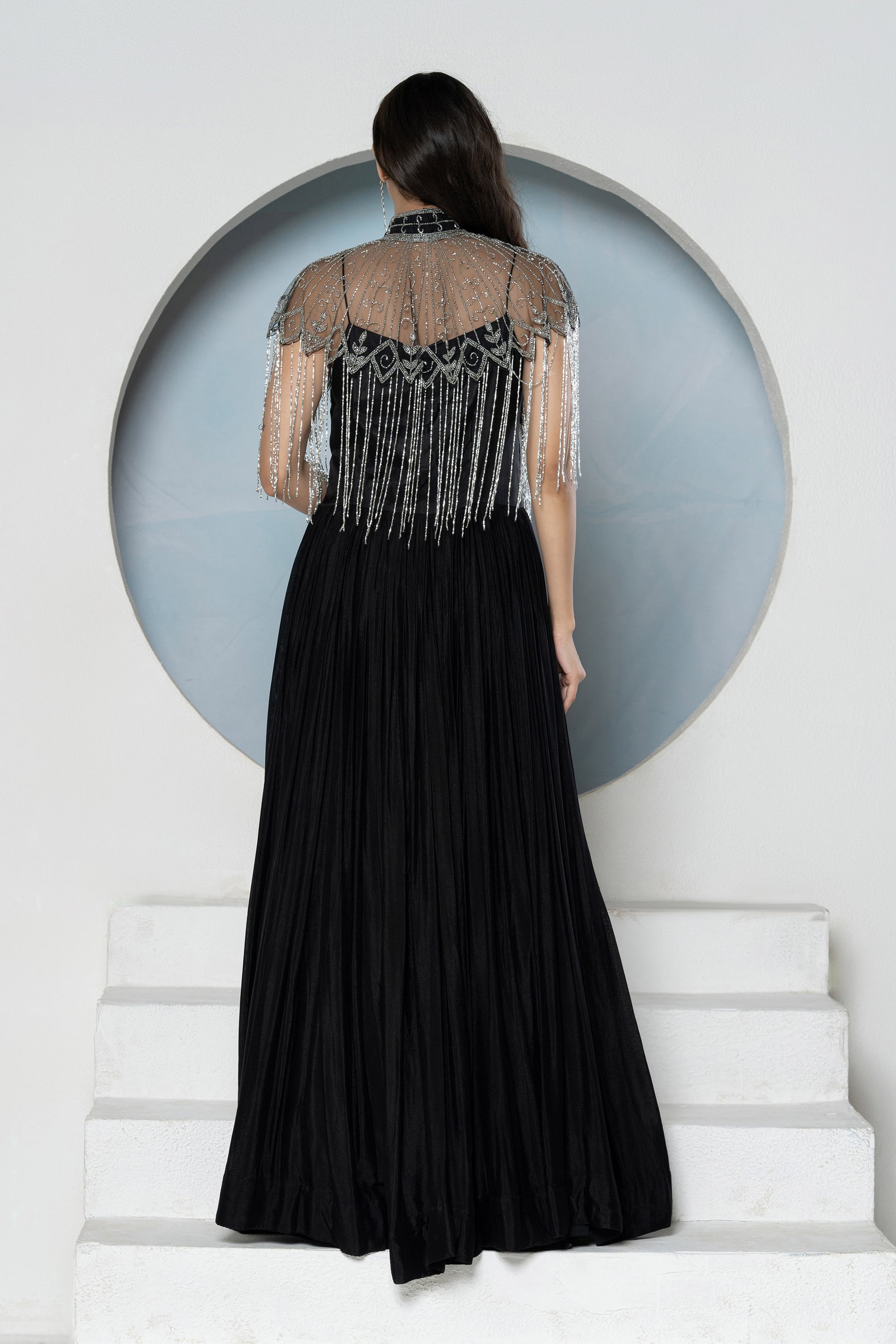 Embroidered detachable cape with hangings paired with a singlet flared gown with added can can & beautiful fall.