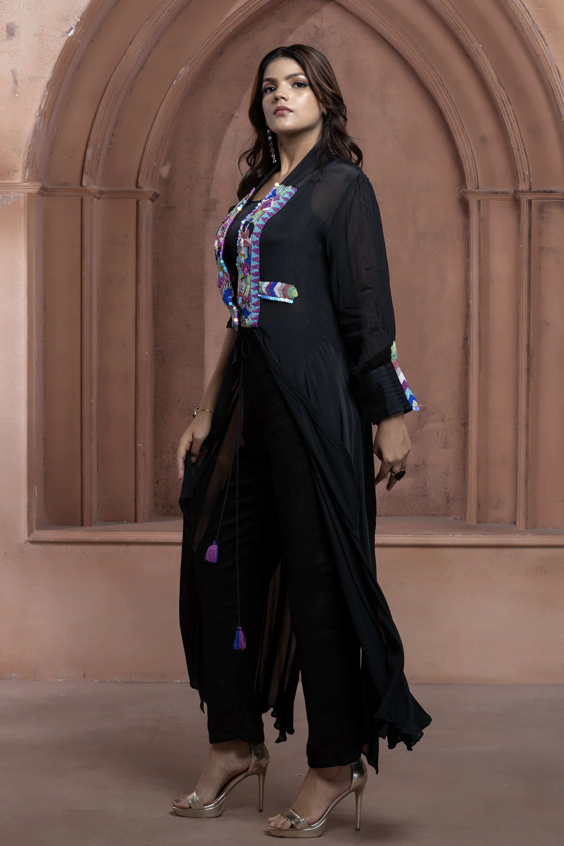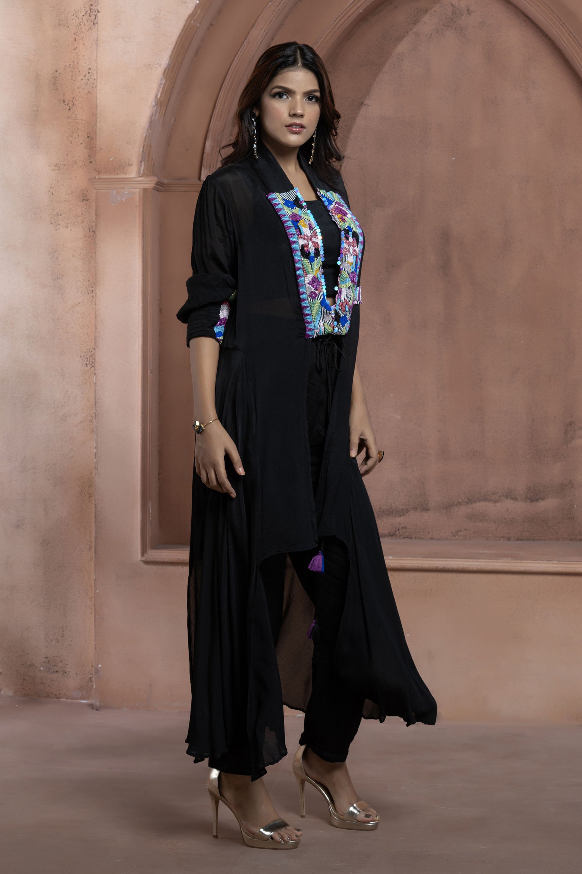 This Black jacket set comes with colorful detailed embroidery with open-front dori to cinch the waist