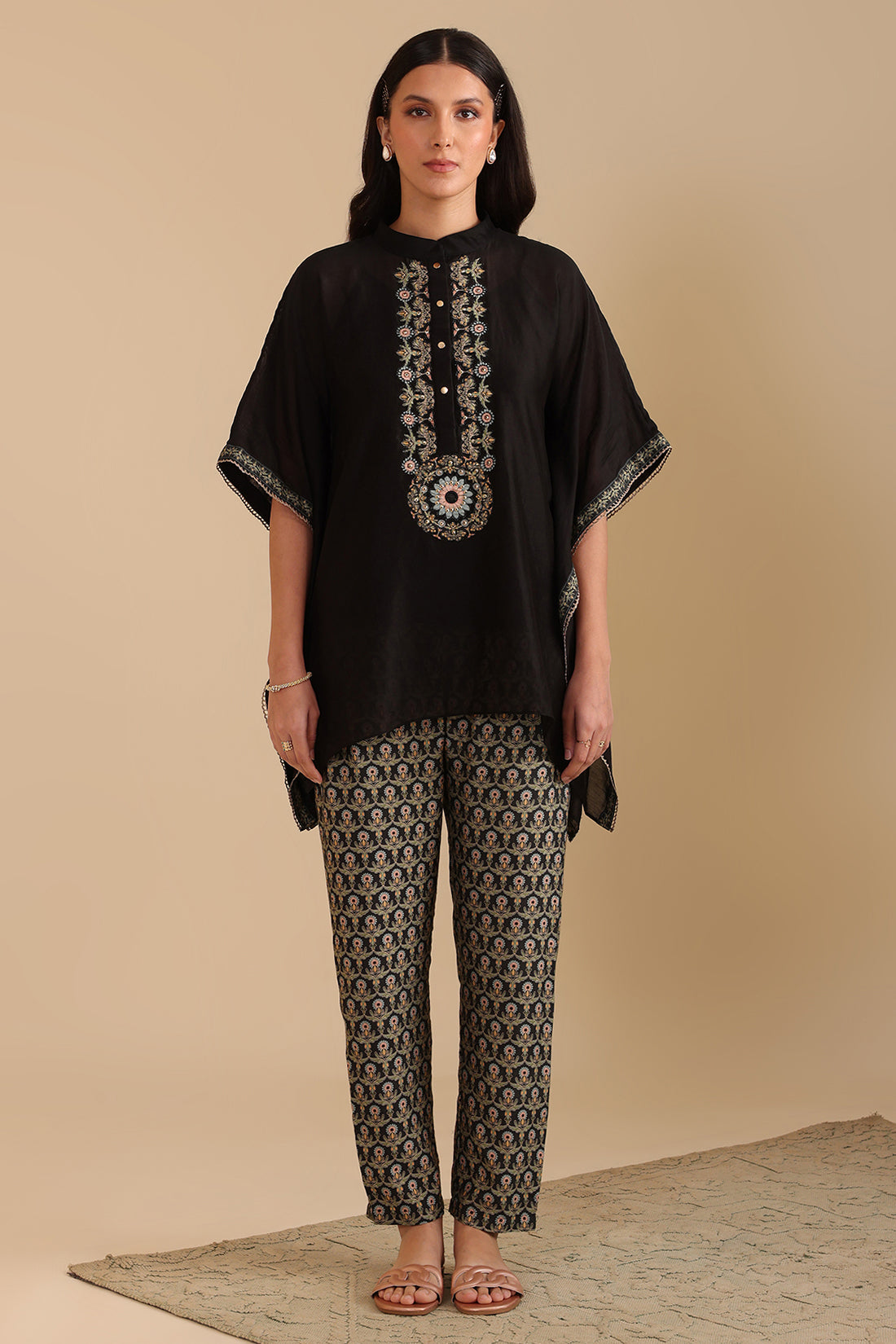 A black Eraya kaftan-style Chanderi top with appliqué, paired with printed pants.
