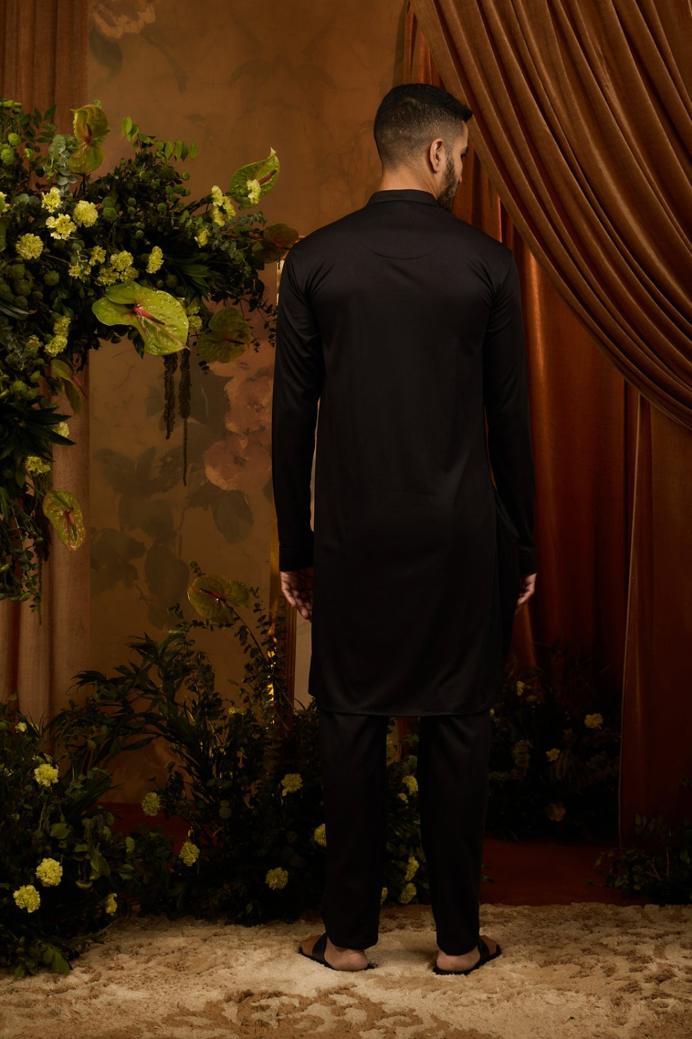 Elevate your traditional look with black silk koti set. The classic black kurta pajama is paired with a stunning koti featuring floral details, crafted with golden resham thread work.