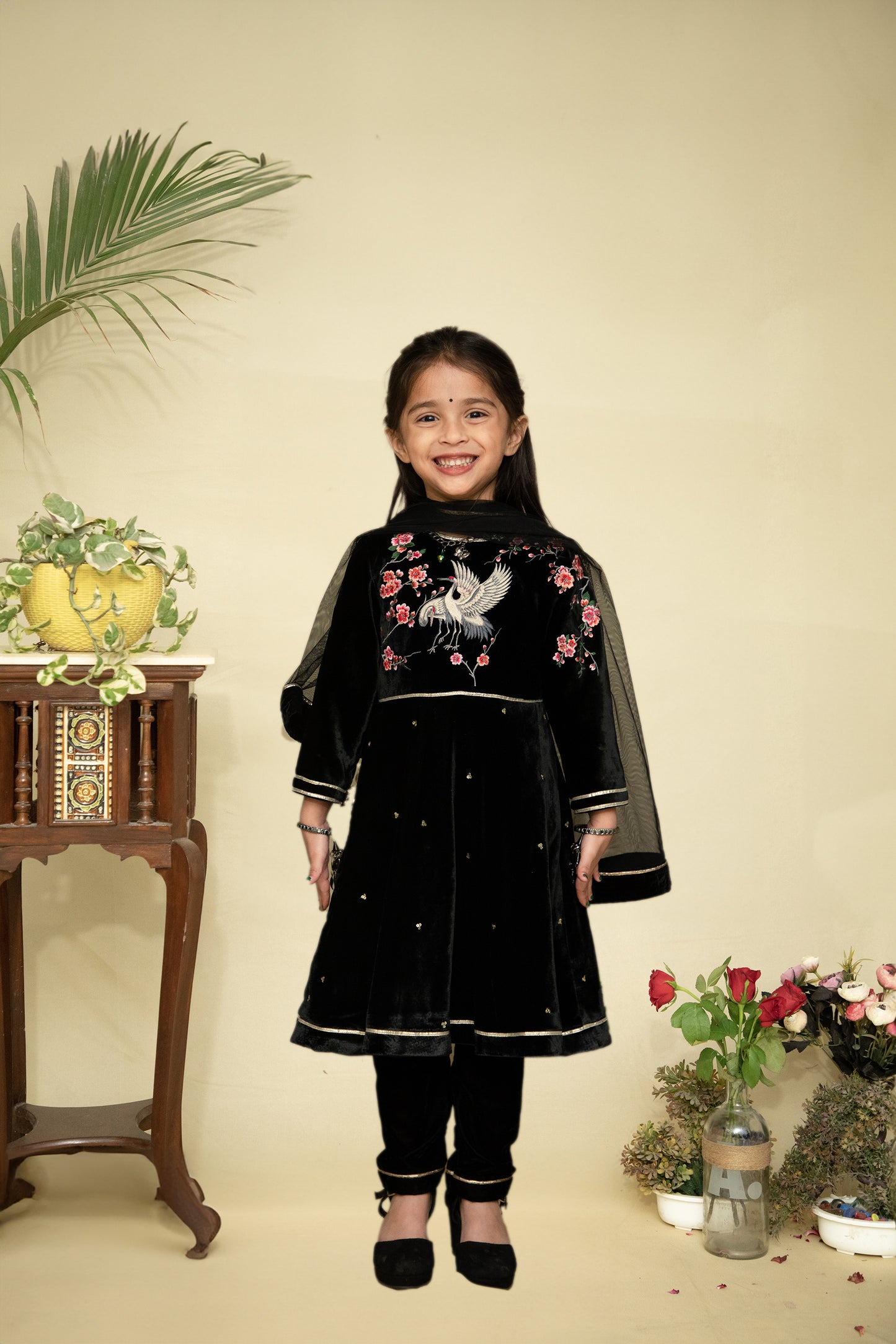Machine Embroidered and hand Adda work on Black Velvet Anarkali comes with Net Dupatta.
