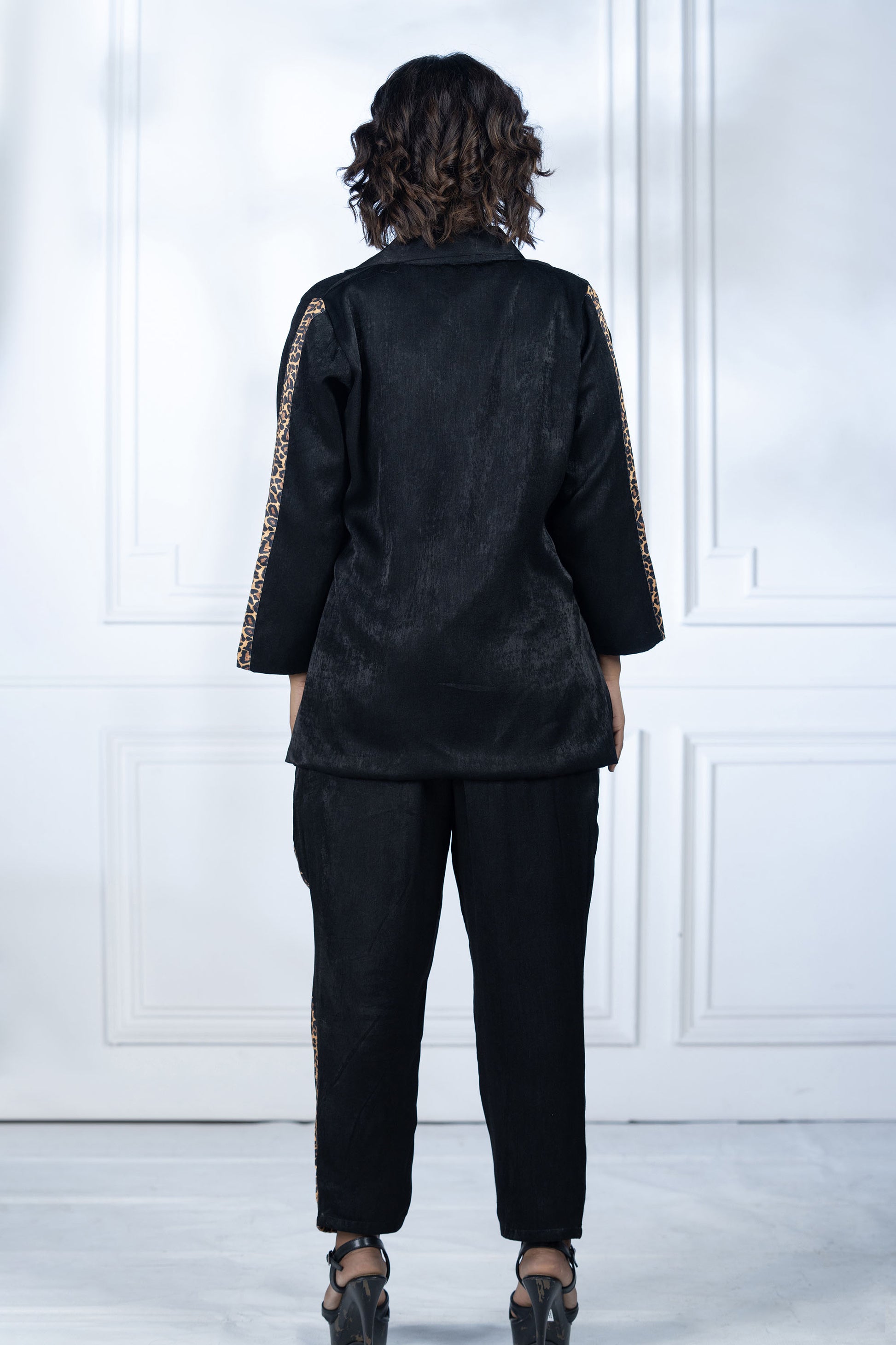 This set is a stylish and versatile outfit that combines the sharpness of a blazer with the comfort of tailored pants,printed panel on pants & small patches on blazer looks chic.