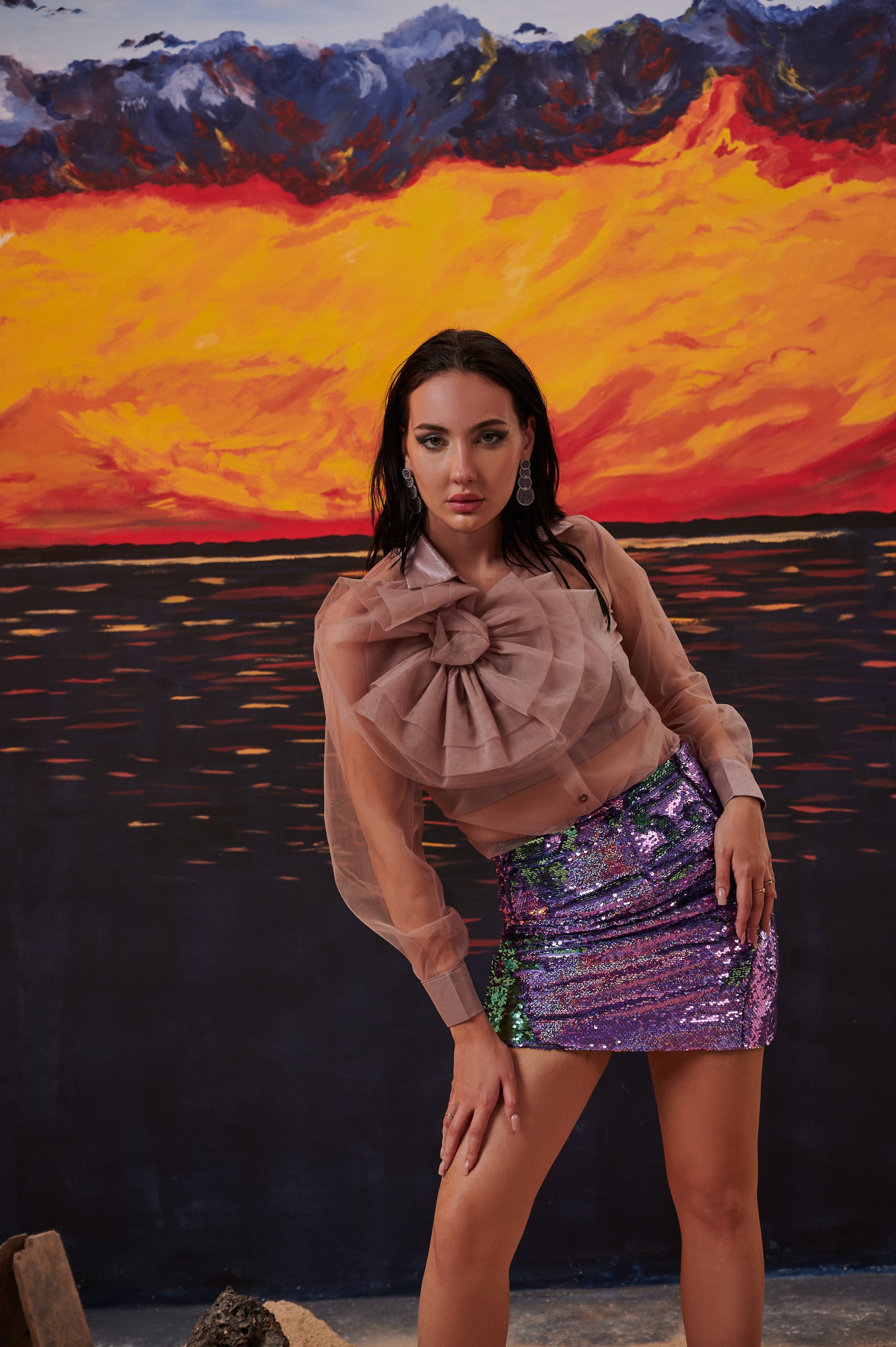 DETAILS- See through shirt with flower detailing paired with a reversible sequin fitted skirt.