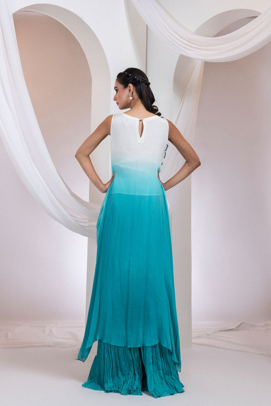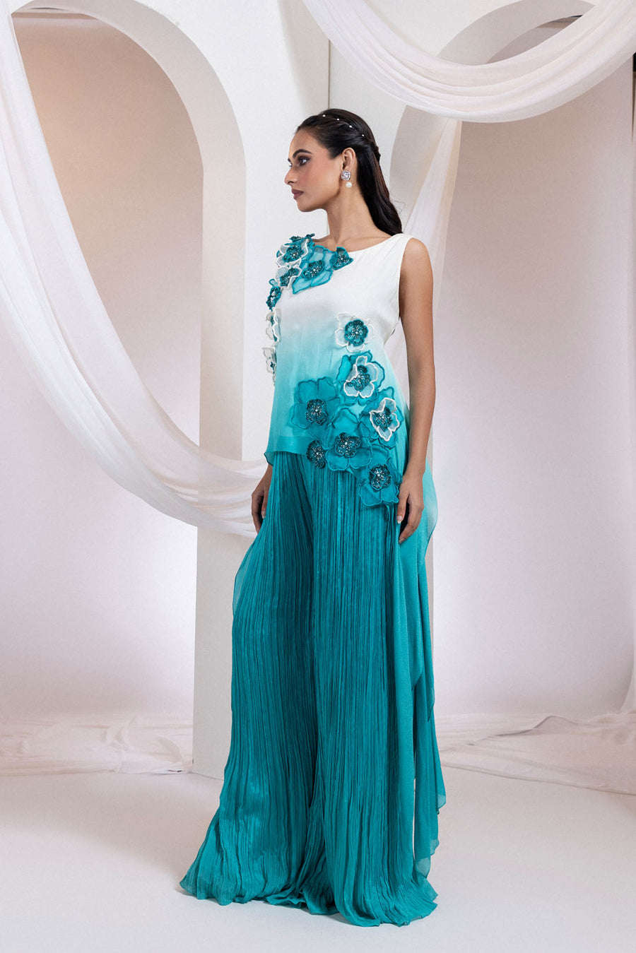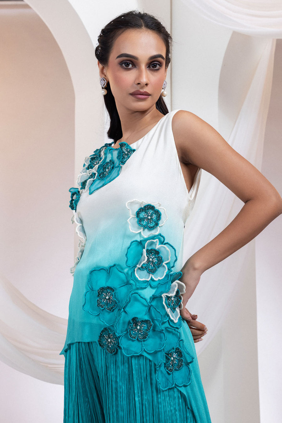 A two-piece ensemble featuring an asymmetrical top that fades from ivory to aqua, adorned with bold 3D teal and white organza florals and intricate beadwork. Paired with ruched palazzo pants for soft structure and movement. The statement florals and fresh palette make it ideal for festive summer occasions and destination celebrations.