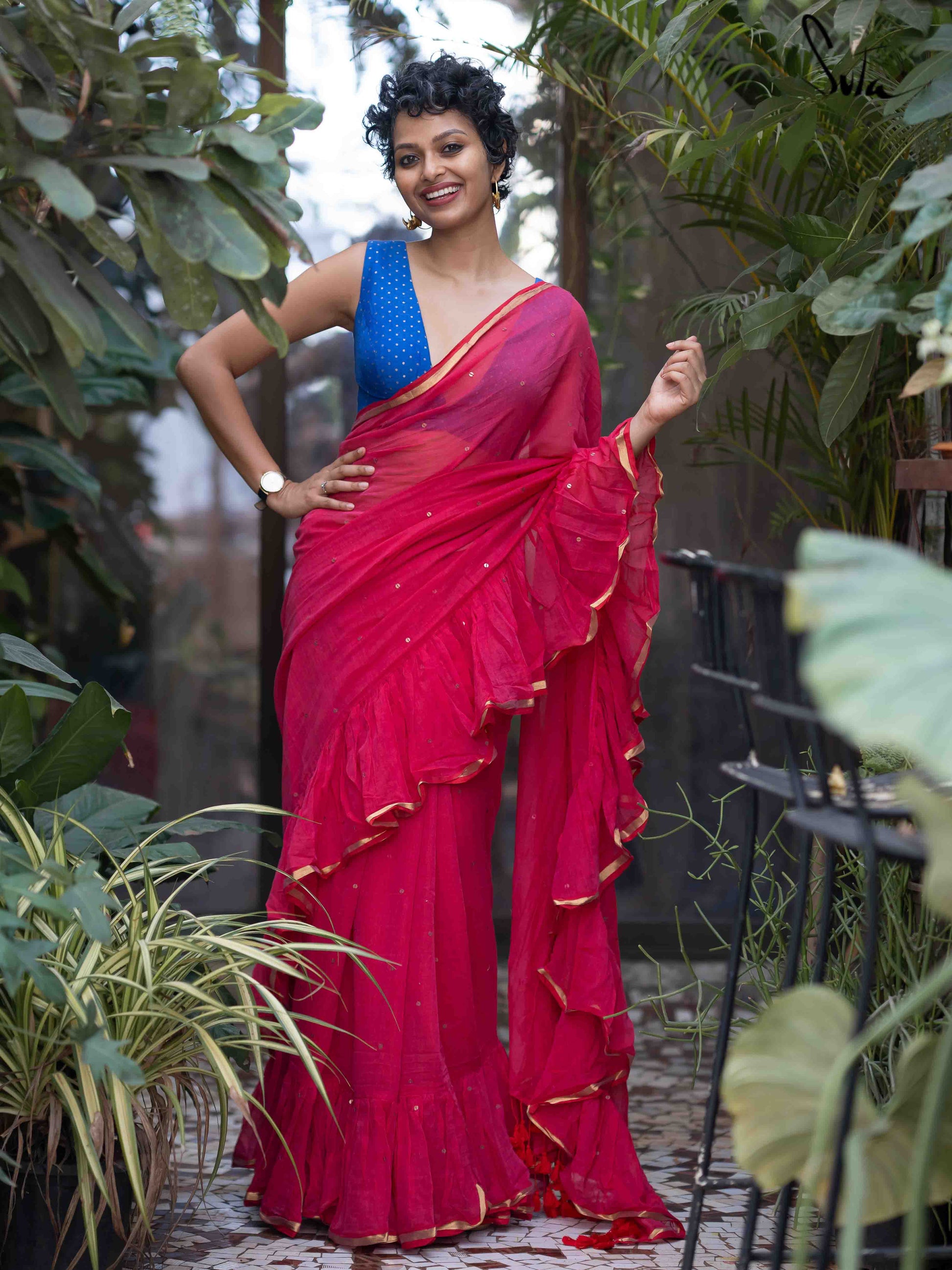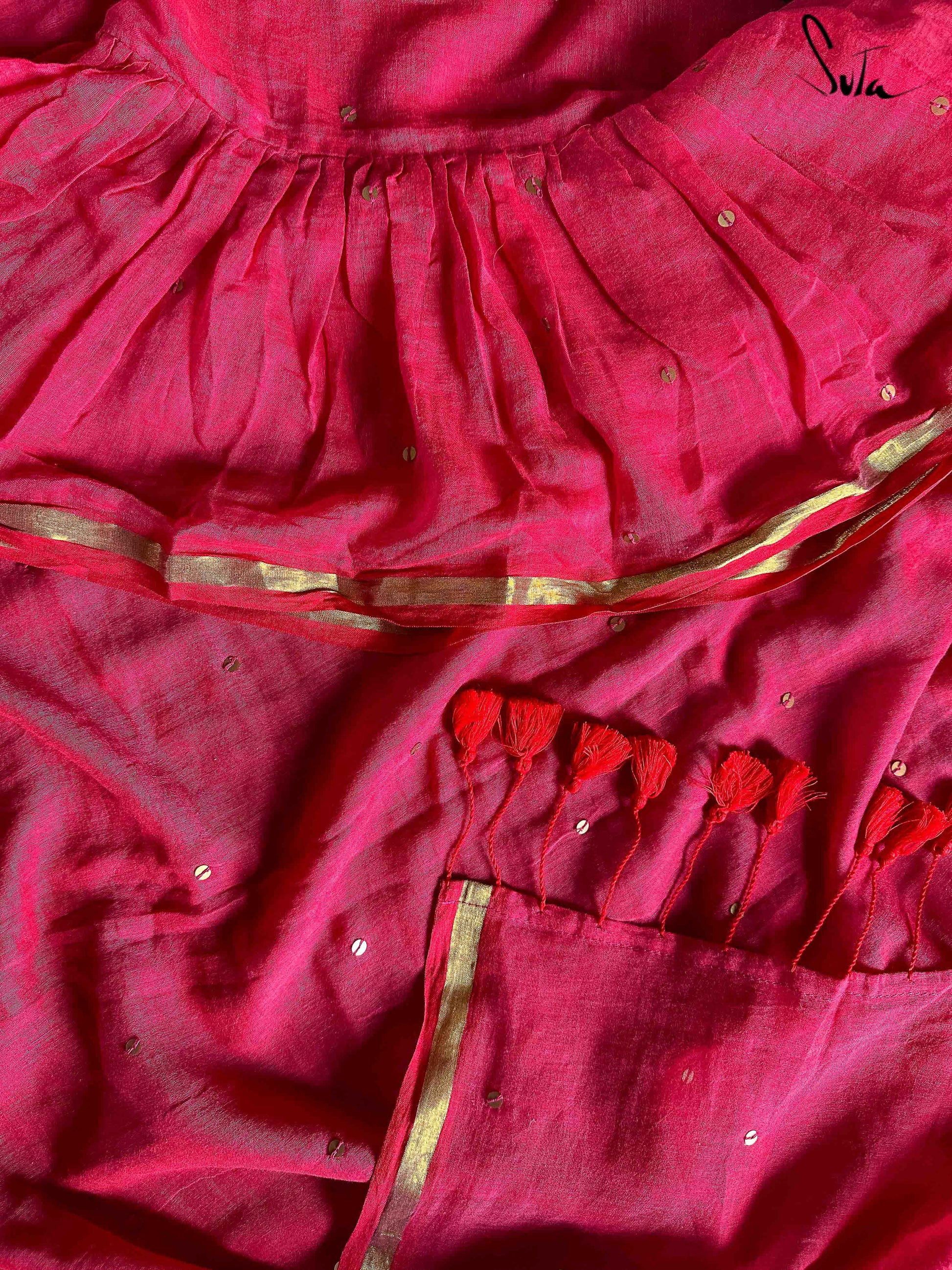 Sutas ˜made in heaven mul cotton is also known as mul mul in West Bengal. The fabric is buttery soft and has a delicate beauty. Its weave is very fine “ this lends a very fluid texture to the fabric and makes draping it a breeze. It truly is like a hug that wraps you in its love. Mul-mul cotton forms the base for this beautiful saree, which is also embellished with ruffles, hand-sewn chumkis (sequins) and gold trim, to add to its ethereal charm.