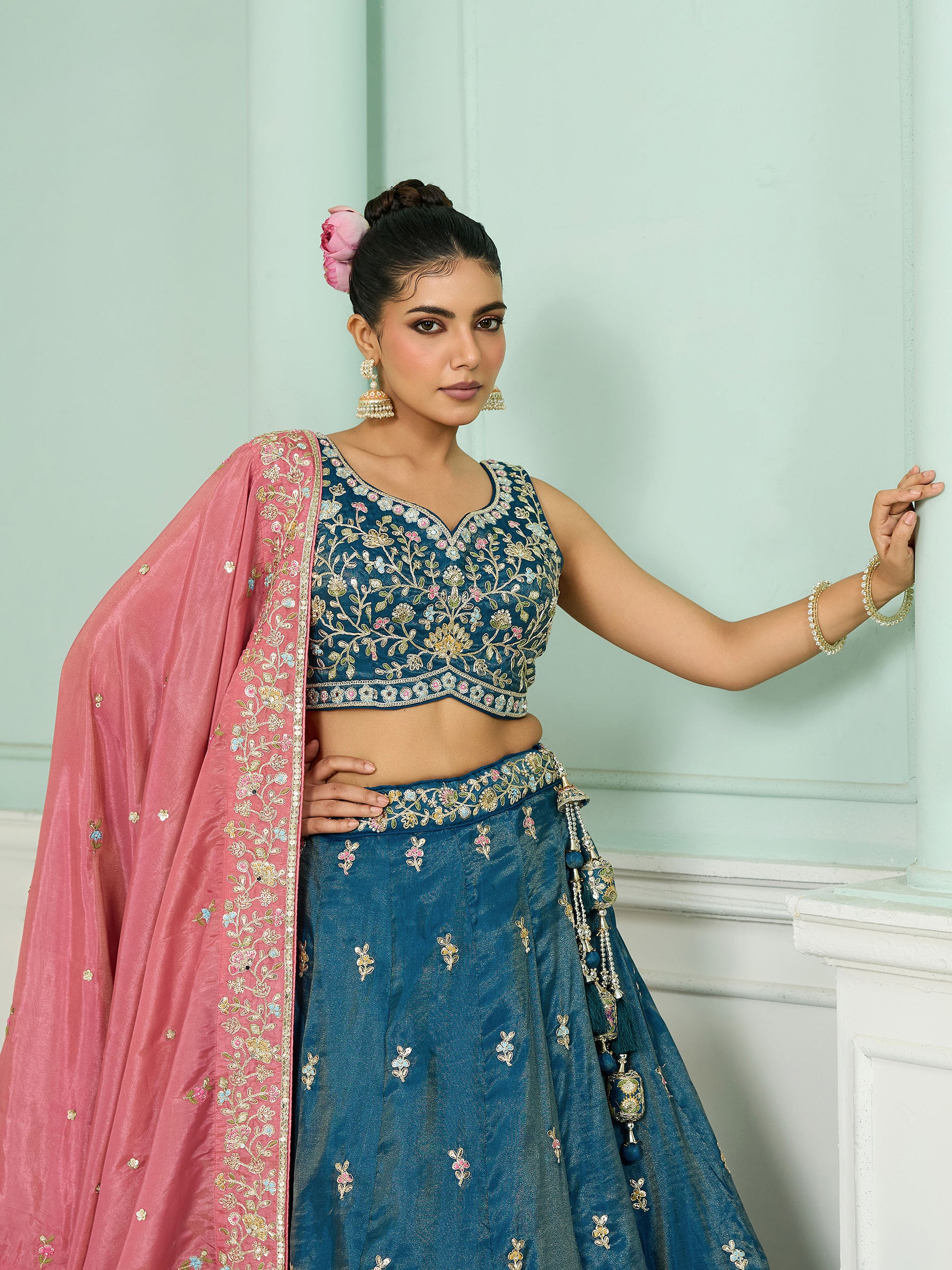 • Lehenga:- Made of premium quality Teal Color with Cosmos Silk fabric Full Flaire Semi-Stitched Lehenga With Beads and stone and Coding work has a thread Embroidery work. Has a thread cutwork border on the hemline.